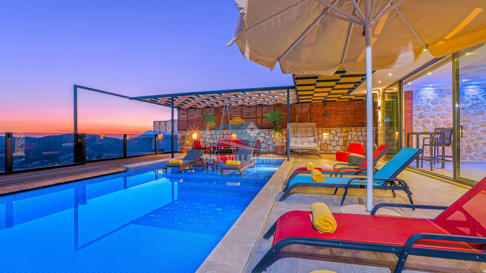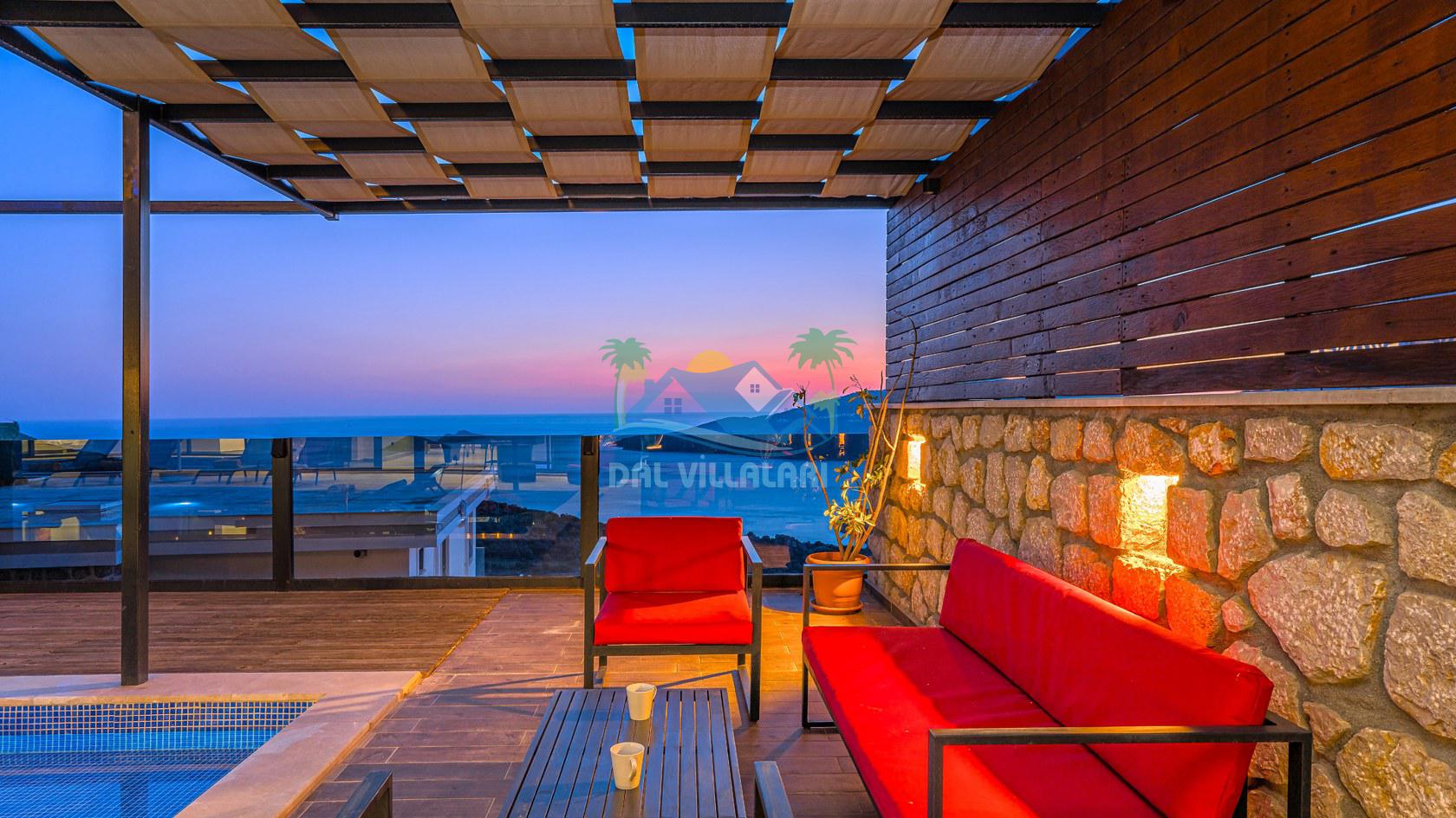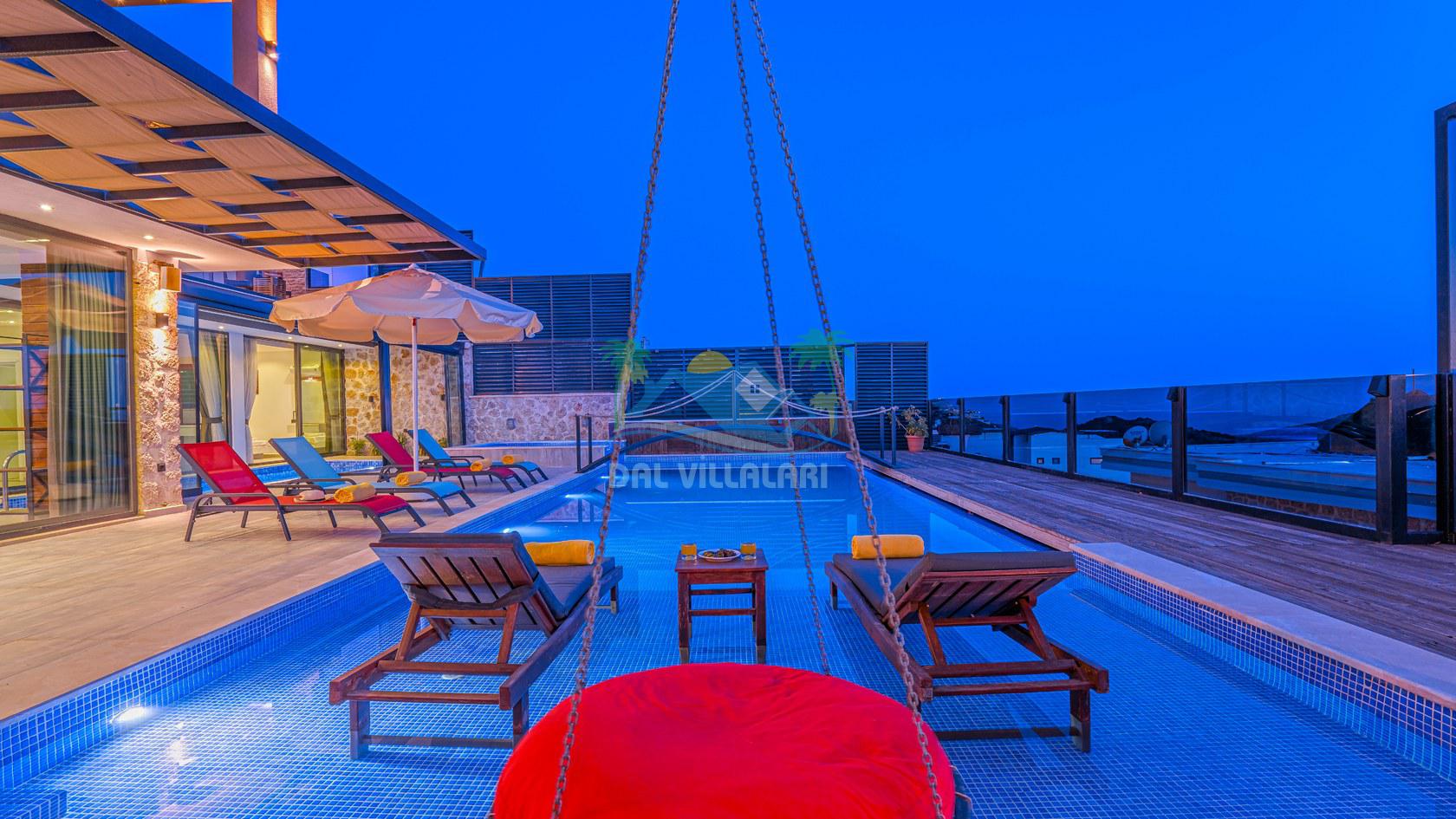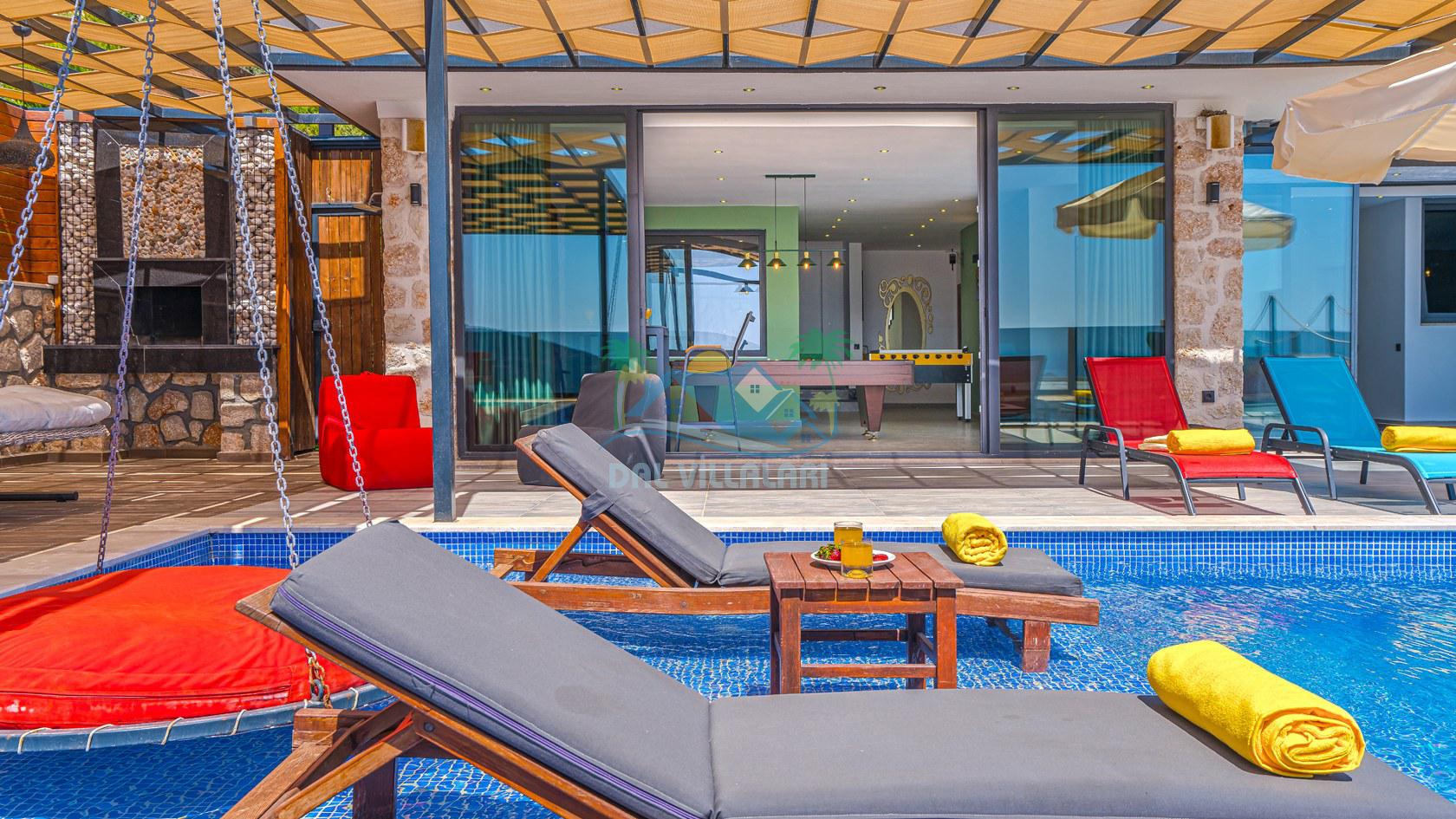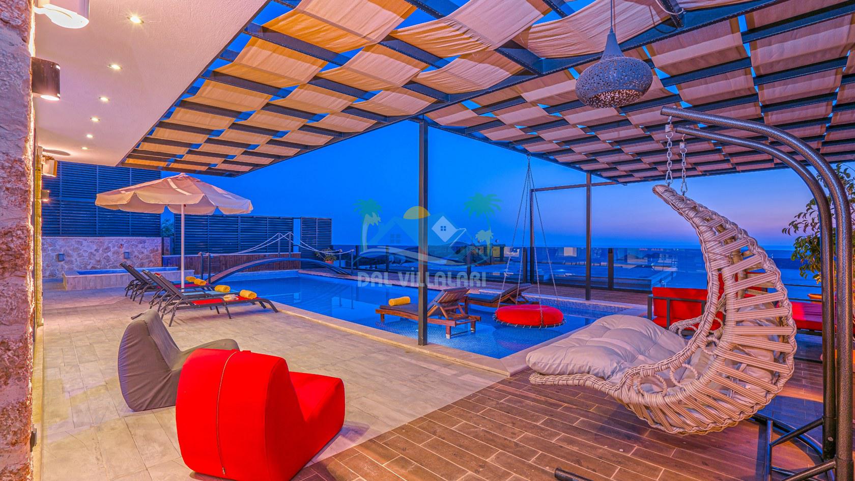 Villa Adalya Duo, Kalkan Kördere mevkiinde konumlanmakta olan eşsiz deniz ve doğa manzarasına hakim kiralık villalarımız arasında yer almaktadır. Modern ve konforlu bir şekilde dizayn edilen yazlık villamızda 3 adet yatak odası bulunmakta olup, 6 kişiye konaklama imkanı sağlamaktadır. Kış aylarında tatil planı yapan misafirlerimiz için jakuzili kapalı ısıtma havuzu, hamam ve sauna yer almaktadır. Havuz ve havuz terası korunaklı hale getirilen kiralık villamızı muhafazakar aileler ve balayı çiftleri rahatlıkla tercih edebilirler. Tatilinizi eğlenceli hale getirebilmek adına langırt, masa tenisi ve bilardo masası yer almaktadır. Aynı zamanda yüzme havuzunun yanında sığ havuz ve çocuk havuzu bulunmaktadır. Çocuk havuzunun içerisinde jakuzi sistemi yer almaktadır. Her bir detayın en ince ayrıntısına kadar düşünüldüğü yazlık villamızda tüm yorgunluğunuzu giderebileceğiniz ve sevdiklerinizle birlikte muhteşem deniz manzarasına karşı keyif yapabileceğiniz bir yazlık villada tatil için Villa Adalya Duo’ yu tercih edebilirsiniz.