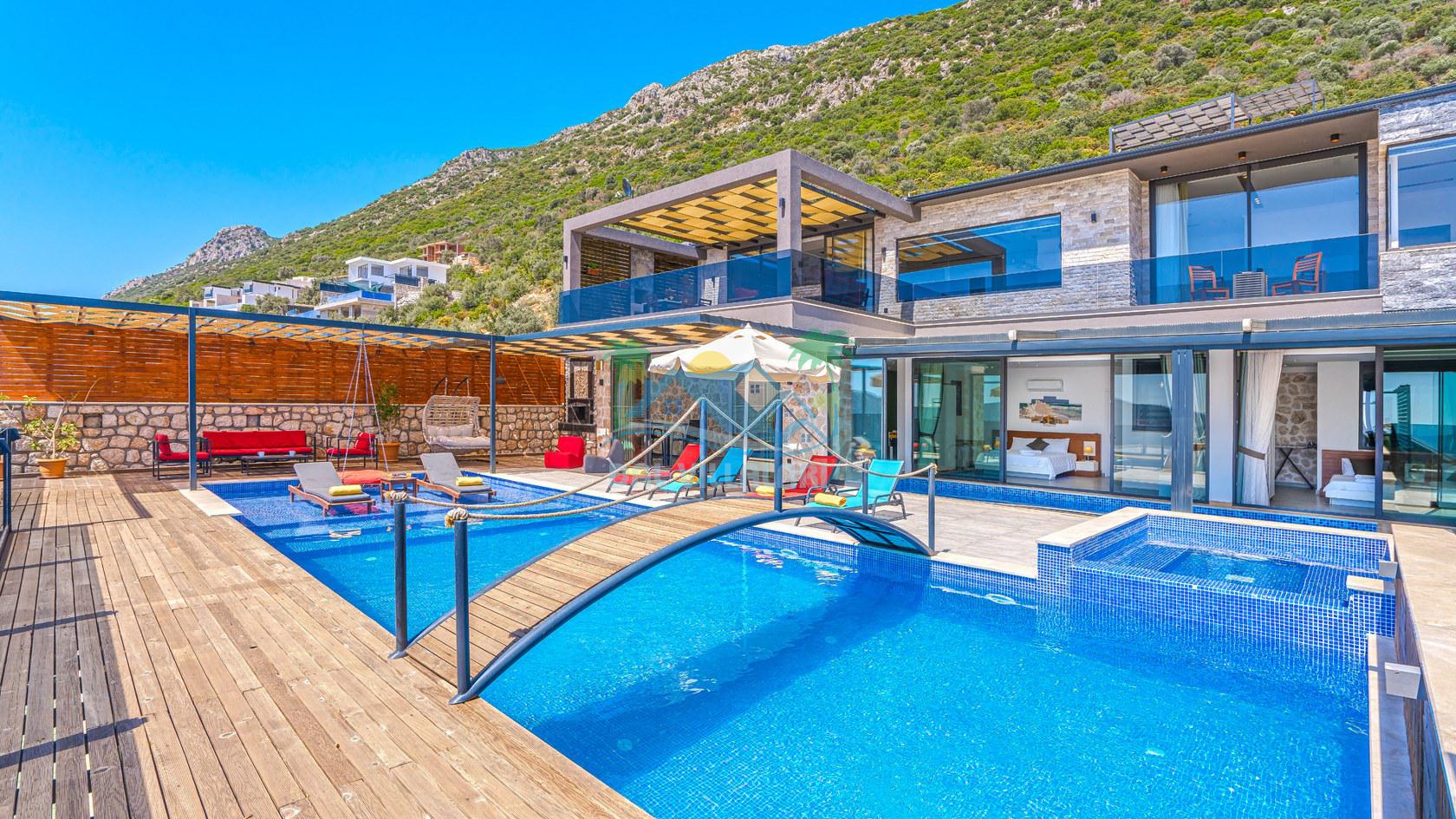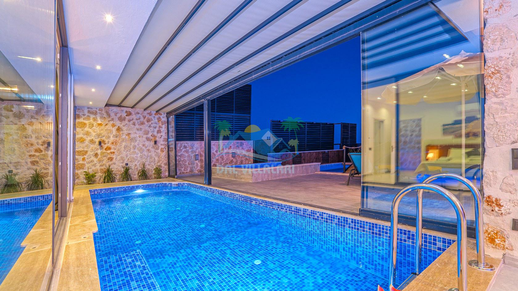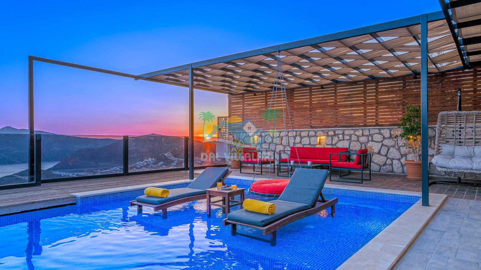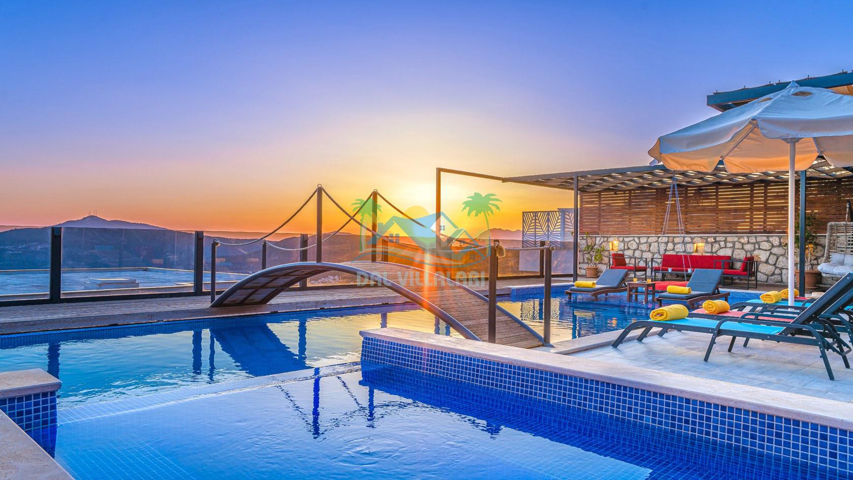 Villa Adalya Duo, Kalkan Kördere mevkiinde konumlanmakta olan eşsiz deniz ve doğa manzarasına hakim kiralık villalarımız arasında yer almaktadır. Modern ve konforlu bir şekilde dizayn edilen yazlık villamızda 3 adet yatak odası bulunmakta olup, 6 kişiye konaklama imkanı sağlamaktadır. Kış aylarında tatil planı yapan misafirlerimiz için jakuzili kapalı ısıtma havuzu, hamam ve sauna yer almaktadır. Havuz ve havuz terası korunaklı hale getirilen kiralık villamızı muhafazakar aileler ve balayı çiftleri rahatlıkla tercih edebilirler. Tatilinizi eğlenceli hale getirebilmek adına langırt, masa tenisi ve bilardo masası yer almaktadır. Aynı zamanda yüzme havuzunun yanında sığ havuz ve çocuk havuzu bulunmaktadır. Çocuk havuzunun içerisinde jakuzi sistemi yer almaktadır. Her bir detayın en ince ayrıntısına kadar düşünüldüğü yazlık villamızda tüm yorgunluğunuzu giderebileceğiniz ve sevdiklerinizle birlikte muhteşem deniz manzarasına karşı keyif yapabileceğiniz bir yazlık villada tatil için Villa Adalya Duo’ yu tercih edebilirsiniz.