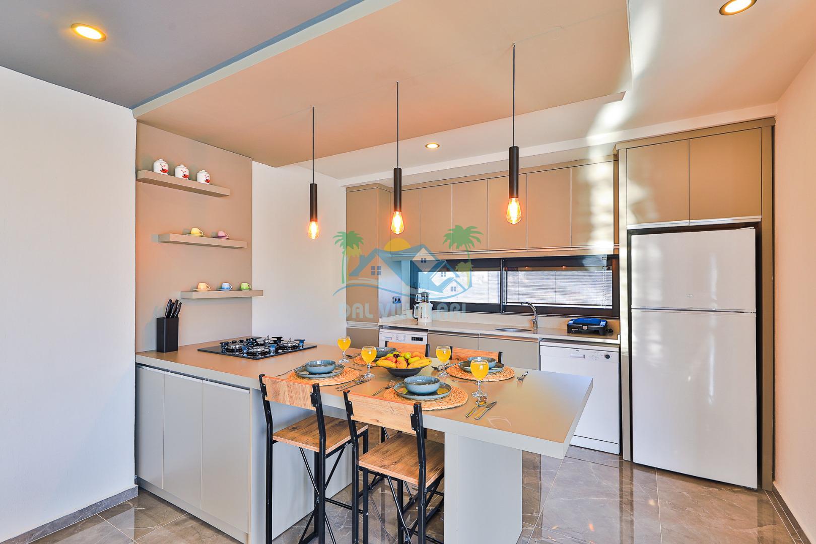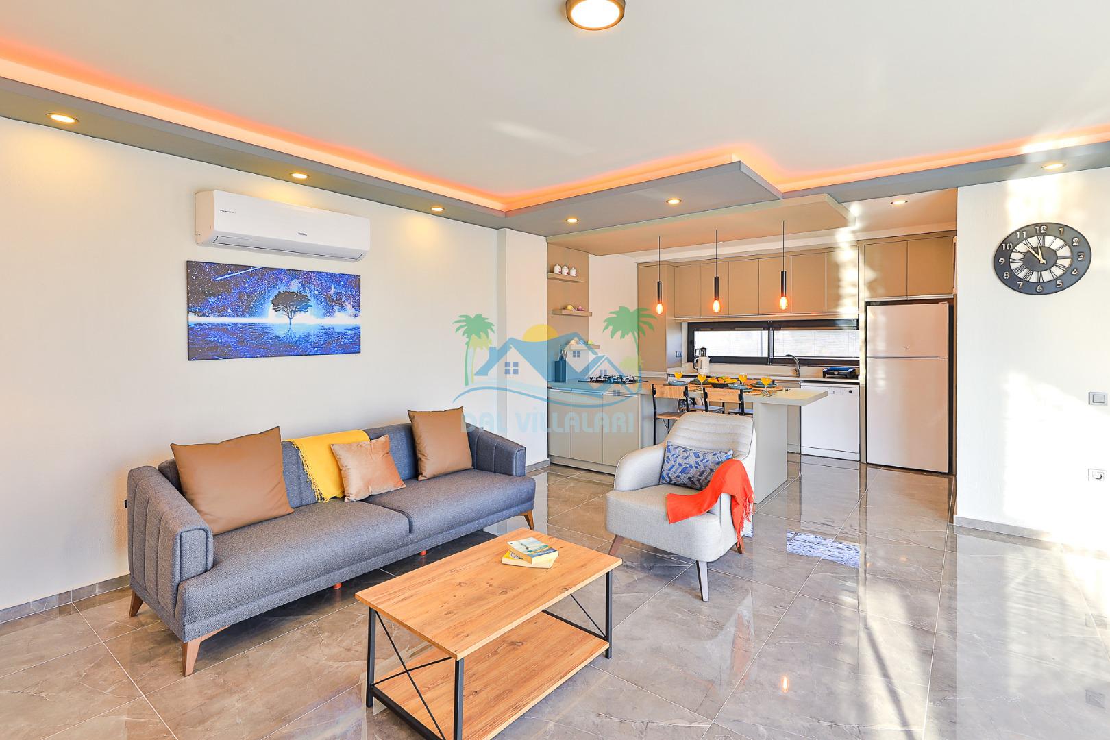 Mutfak: Tam donanımlı modern Amerikan mutfak içerisinde bulaşık makinesi , buzdolabı fırın, ocak, elektrikli su ısıtıcı, kahve makinesi ,mangal ,yemek masası, yemek takımları, çatal ve bıçak takımları, tencere ve tava takımları ve bardaklar bulunmaktadır.