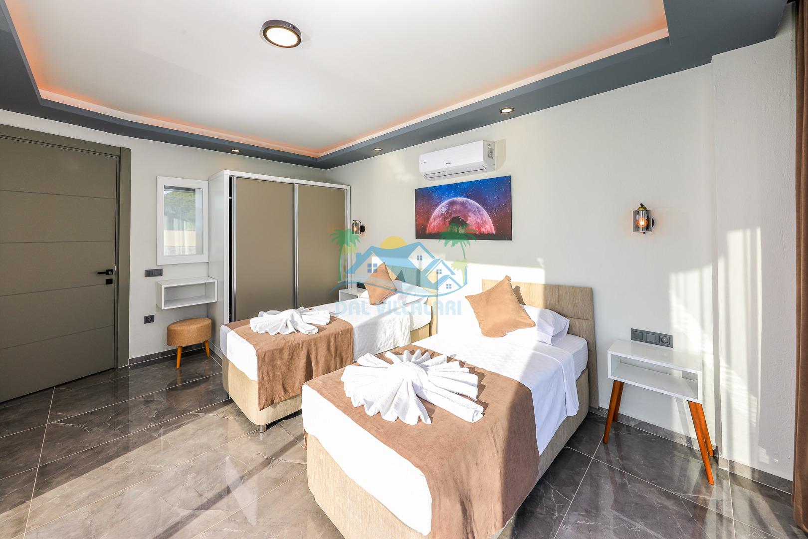 2 Yatak odası: Tek kişilik iki adet yatak, elbise dolabı, komodin, klima, banyo ve tuvalet bulunmaktadır.