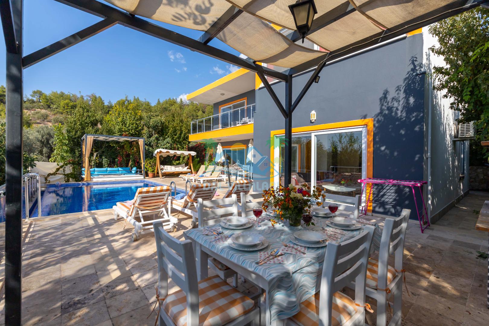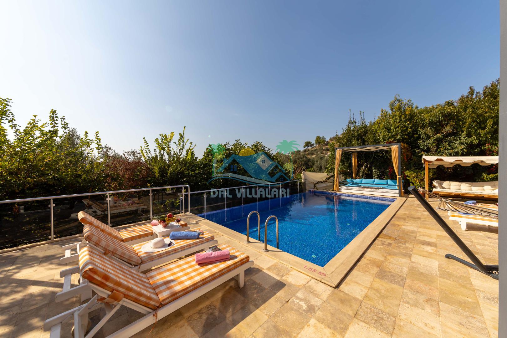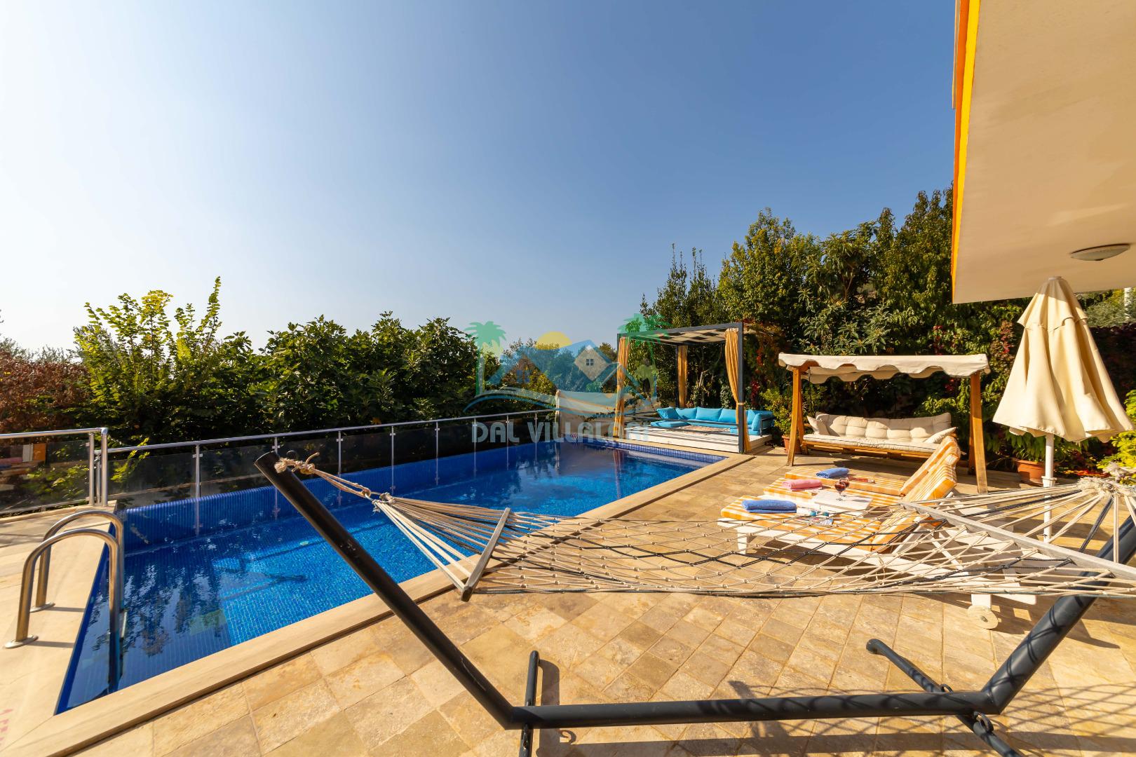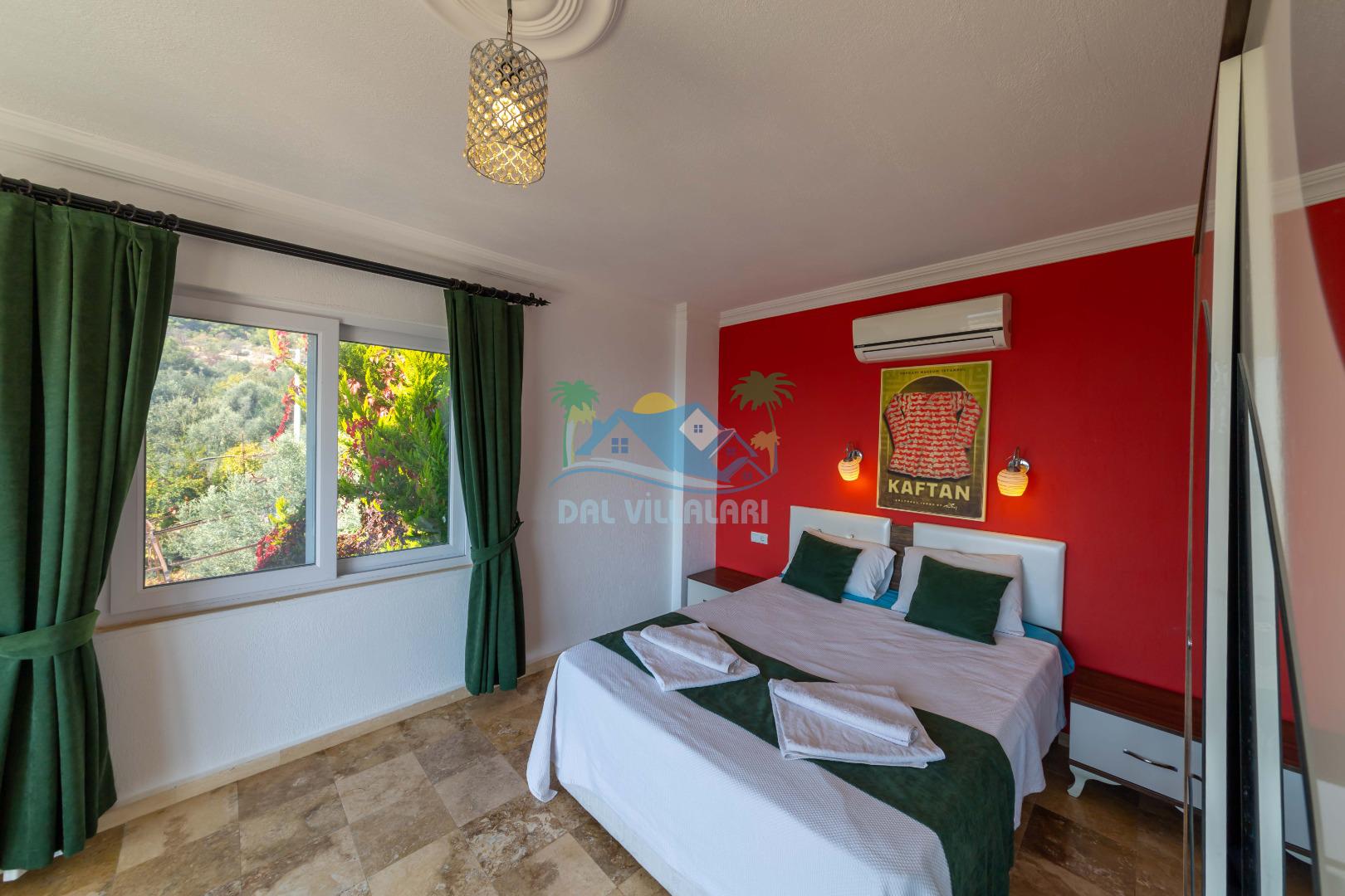 Kalkan, İslamlar´da konumlanmış olan Villa Alya´nın Doğa ve Deniz manzaralı güneşlenme terası ve özel yüzme havuzu dışarıdan görünmediğinden dolayı muhafazakar aileler ve balayı çiftleri için oldukça uygundur. 6 kişiye kadar konaklama imkanına sahip olan villanın 3 geniş yatak odası bulunmaktadır. Villa Alya´nın Master suit yatak odasında oldukça büyük ve güzel bir jakuzi bulunmakta olup, misafirler yılın yorgunluğunu ve stresini kolaylıkla atacaklardır. Kalkan merkeze olan uzaklığı 8 km. dir ve aracınızla 10 -12 dakikada villaya ulaşabilirsiniz. Bahçe terasında; şezlonglar, mangal, çardak, masa, sandalyeler, duş yer almaktadır. Villanın çevresi üzüm bağları, zeytin ağaçları ve çeşitli yeşilliklerle doğal olarak süslenmiştir.