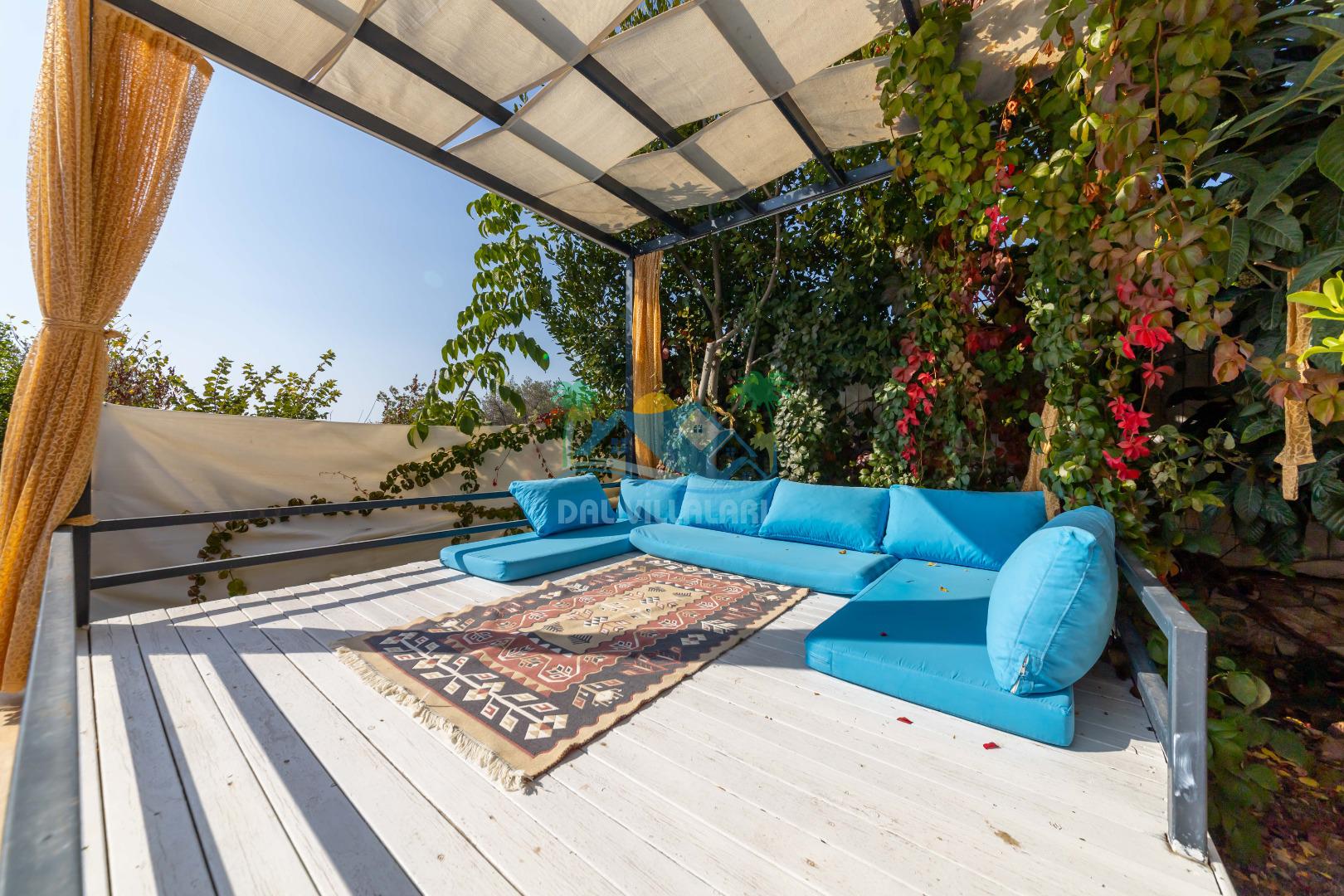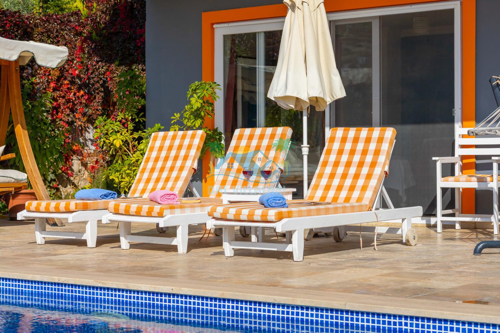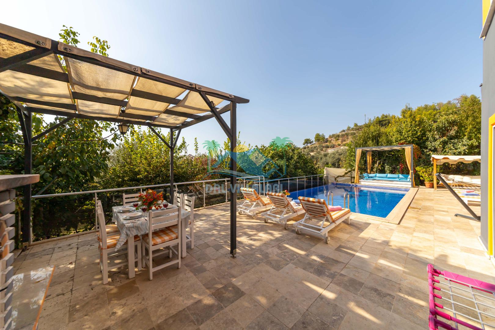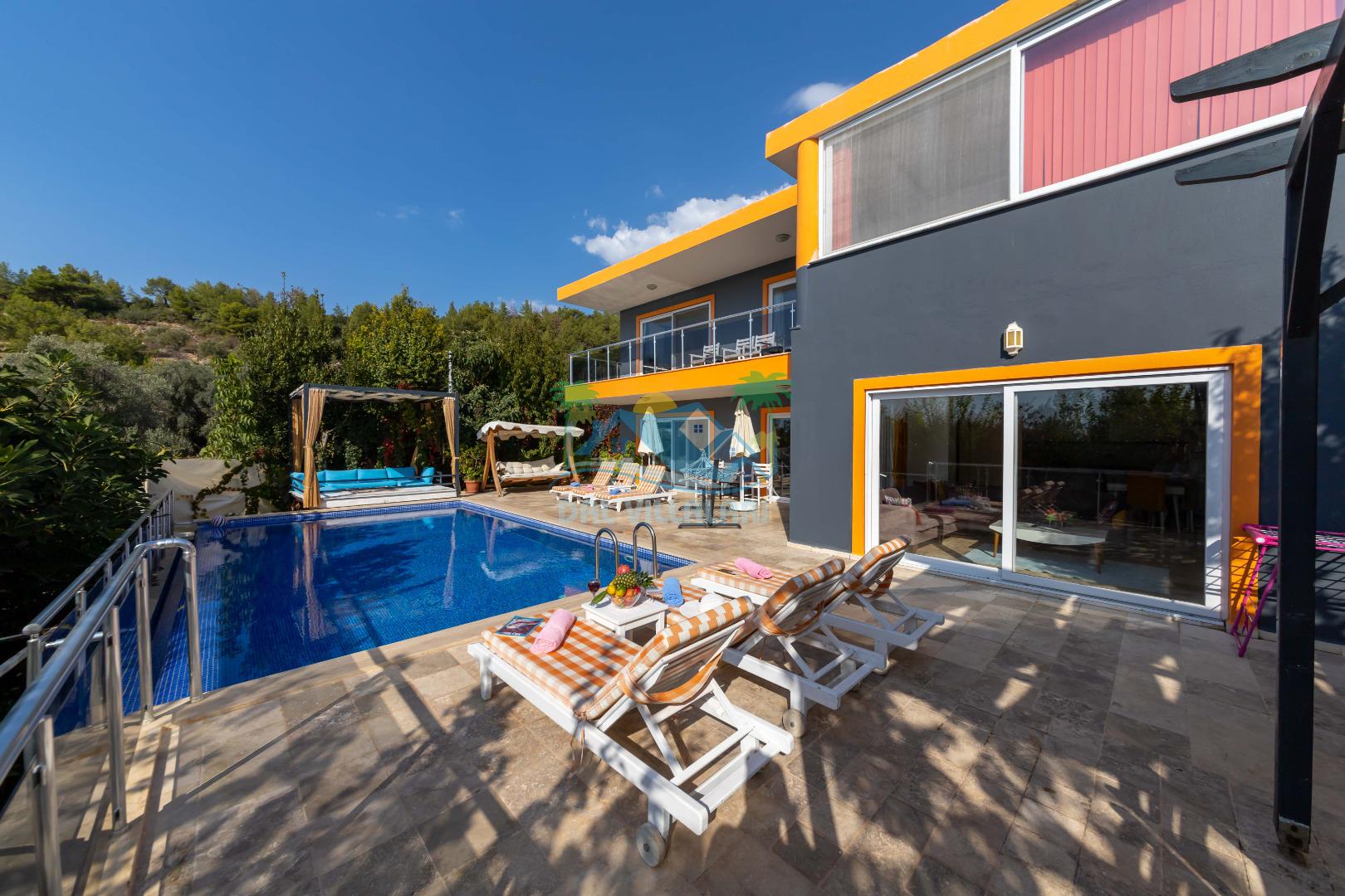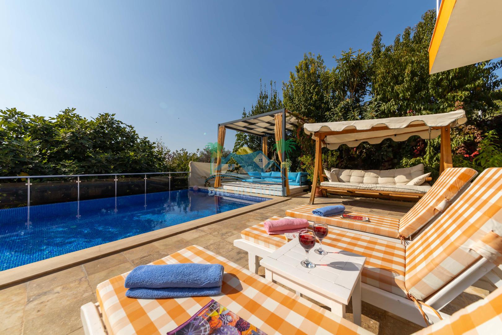 Kalkan, İslamlar´da konumlanmış olan Villa Alya´nın Doğa ve Deniz manzaralı güneşlenme terası ve özel yüzme havuzu dışarıdan görünmediğinden dolayı muhafazakar aileler ve balayı çiftleri için oldukça uygundur. 6 kişiye kadar konaklama imkanına sahip olan villanın 3 geniş yatak odası bulunmaktadır. Villa Alya´nın Master suit yatak odasında oldukça büyük ve güzel bir jakuzi bulunmakta olup, misafirler yılın yorgunluğunu ve stresini kolaylıkla atacaklardır. Kalkan merkeze olan uzaklığı 8 km. dir ve aracınızla 10 -12 dakikada villaya ulaşabilirsiniz. Bahçe terasında; şezlonglar, mangal, çardak, masa, sandalyeler, duş yer almaktadır. Villanın çevresi üzüm bağları, zeytin ağaçları ve çeşitli yeşilliklerle doğal olarak süslenmiştir.