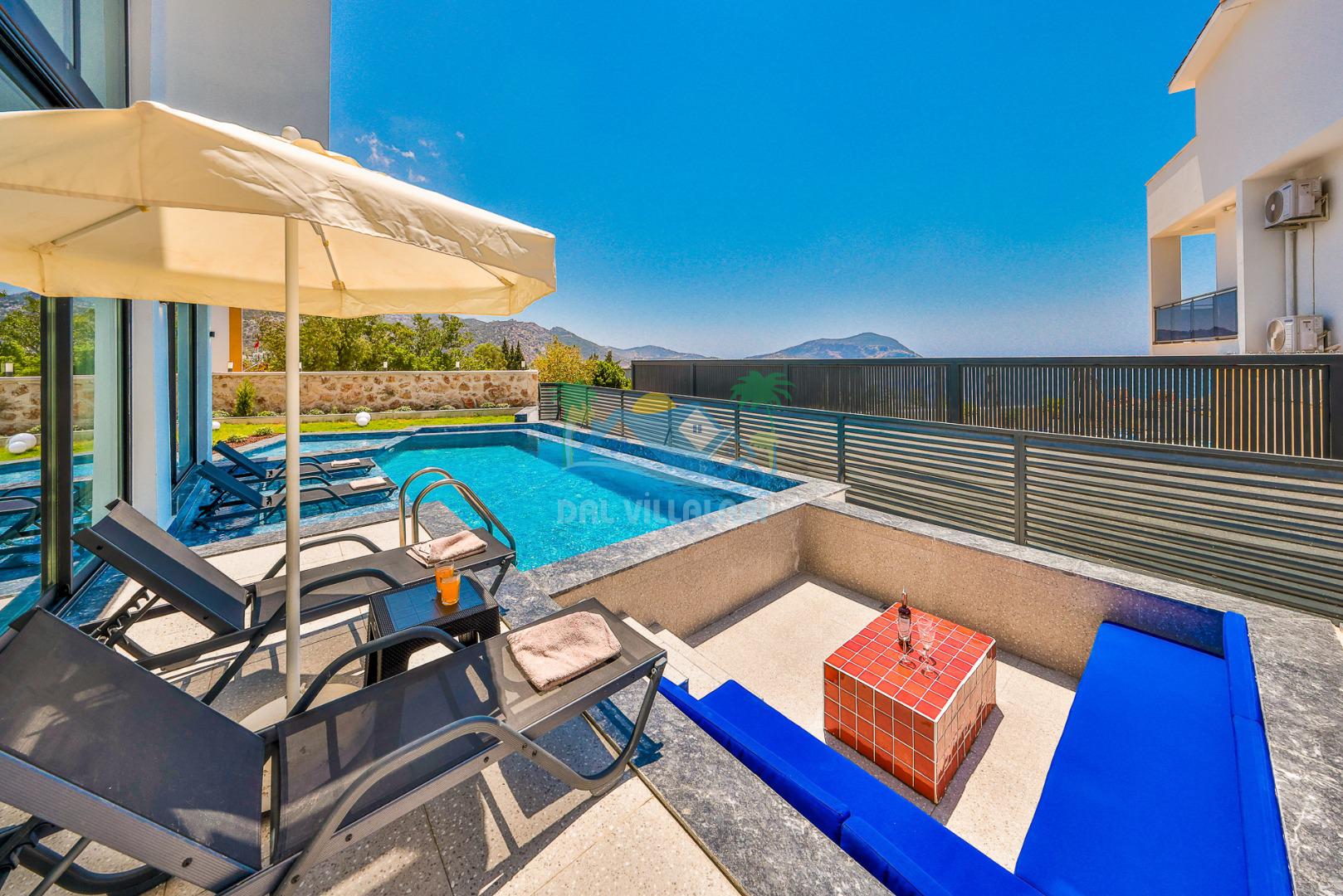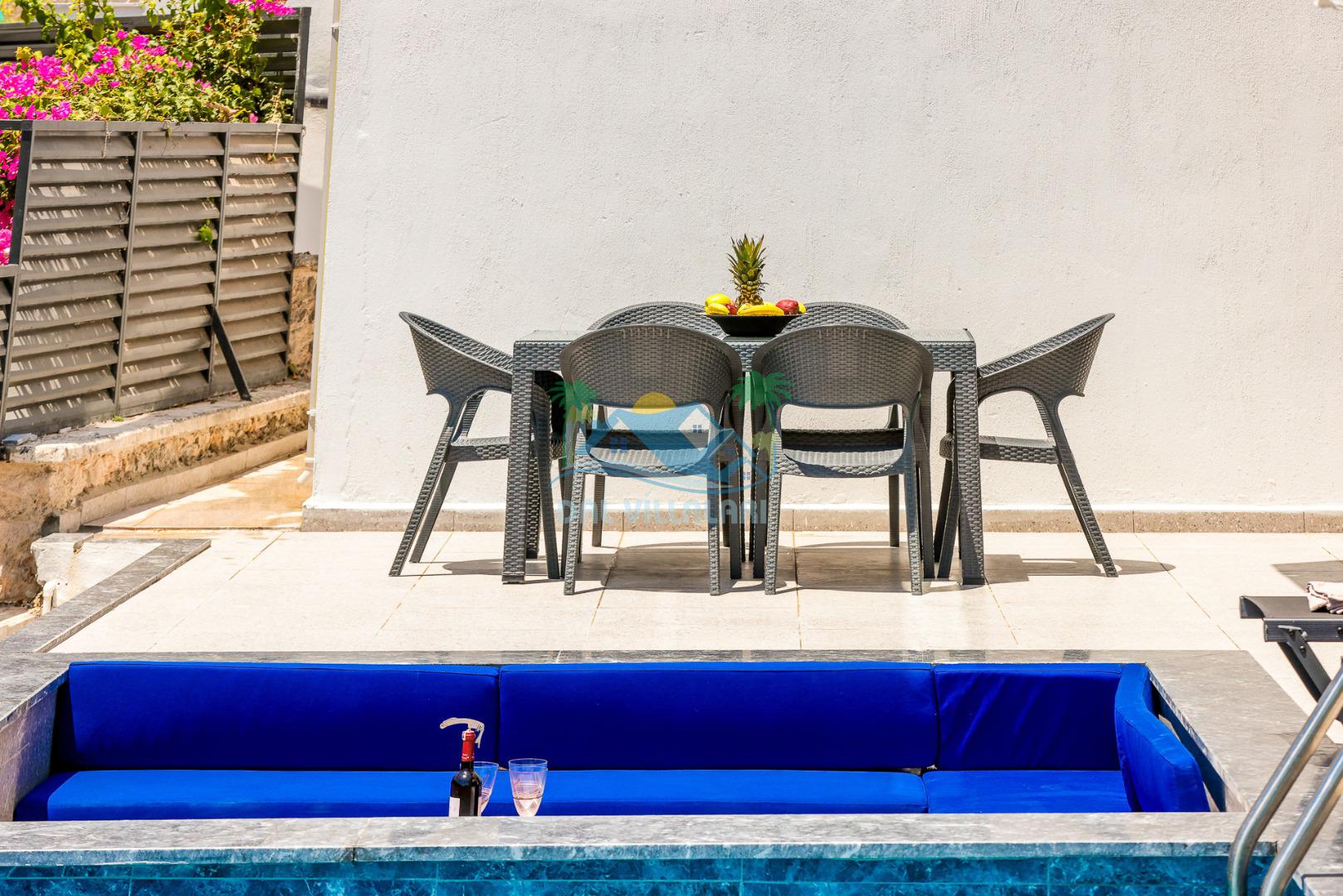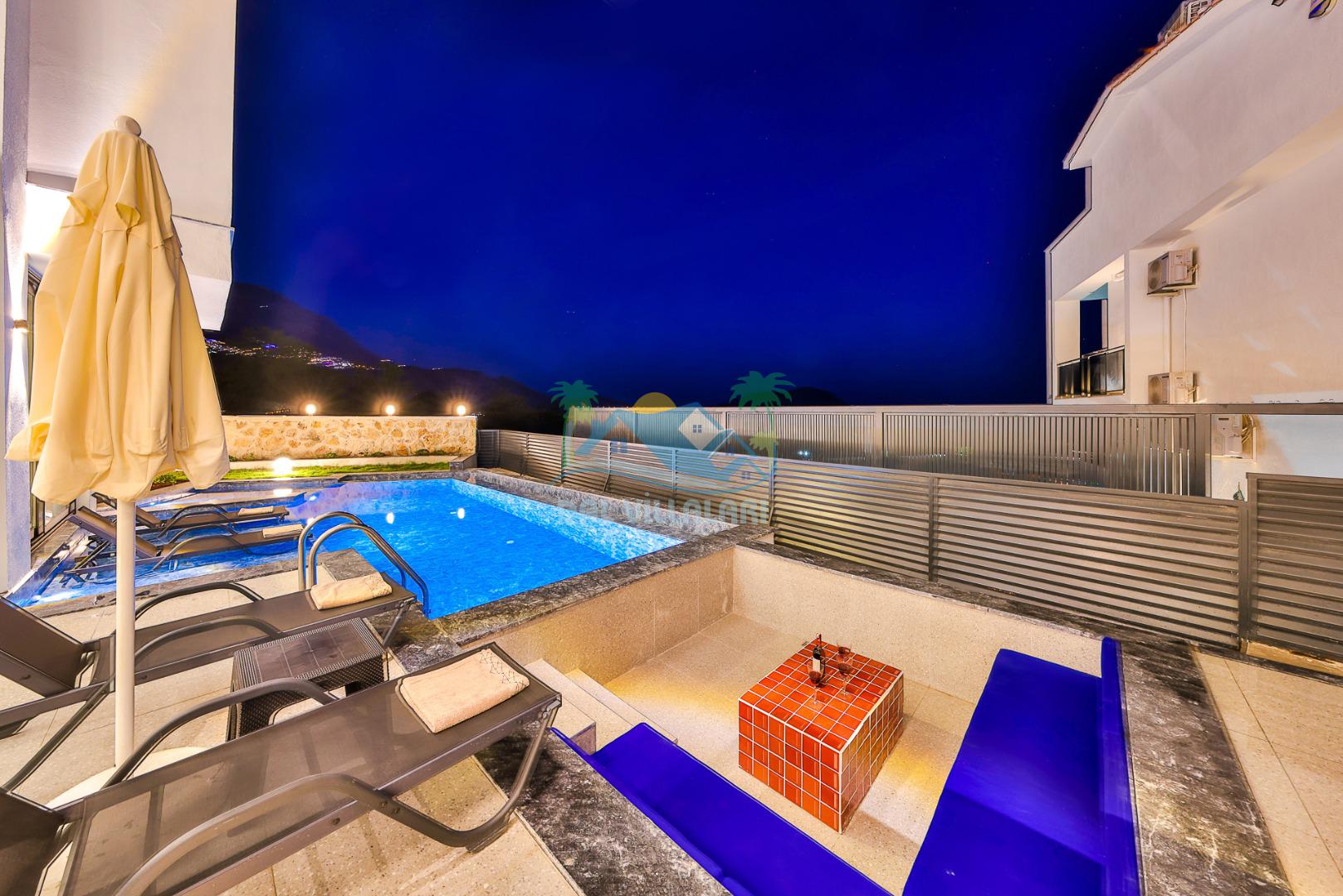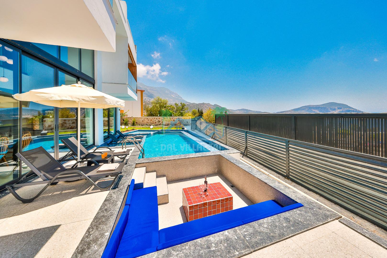 Kalkan merkezde balayı çiftleri ya da çekirdek aileler için uygun olan villamız, 2 yatak odası ile 4 kişilik konaklama kapasitesine sahiptir. Deniz manzaralı villalar ve jakuzili villalar kategorisindeki villamız denize ve merkeze yürüme mesafesinde olup, muhteşem bir deniz manzarasına sahiptir. Modern bir mimariye sahip olan villamızda denize karşı jakuzi keyfini sürebileceğiniz huzur dolu bir tatil sizleri bekliyor.
