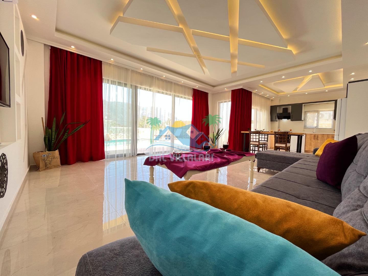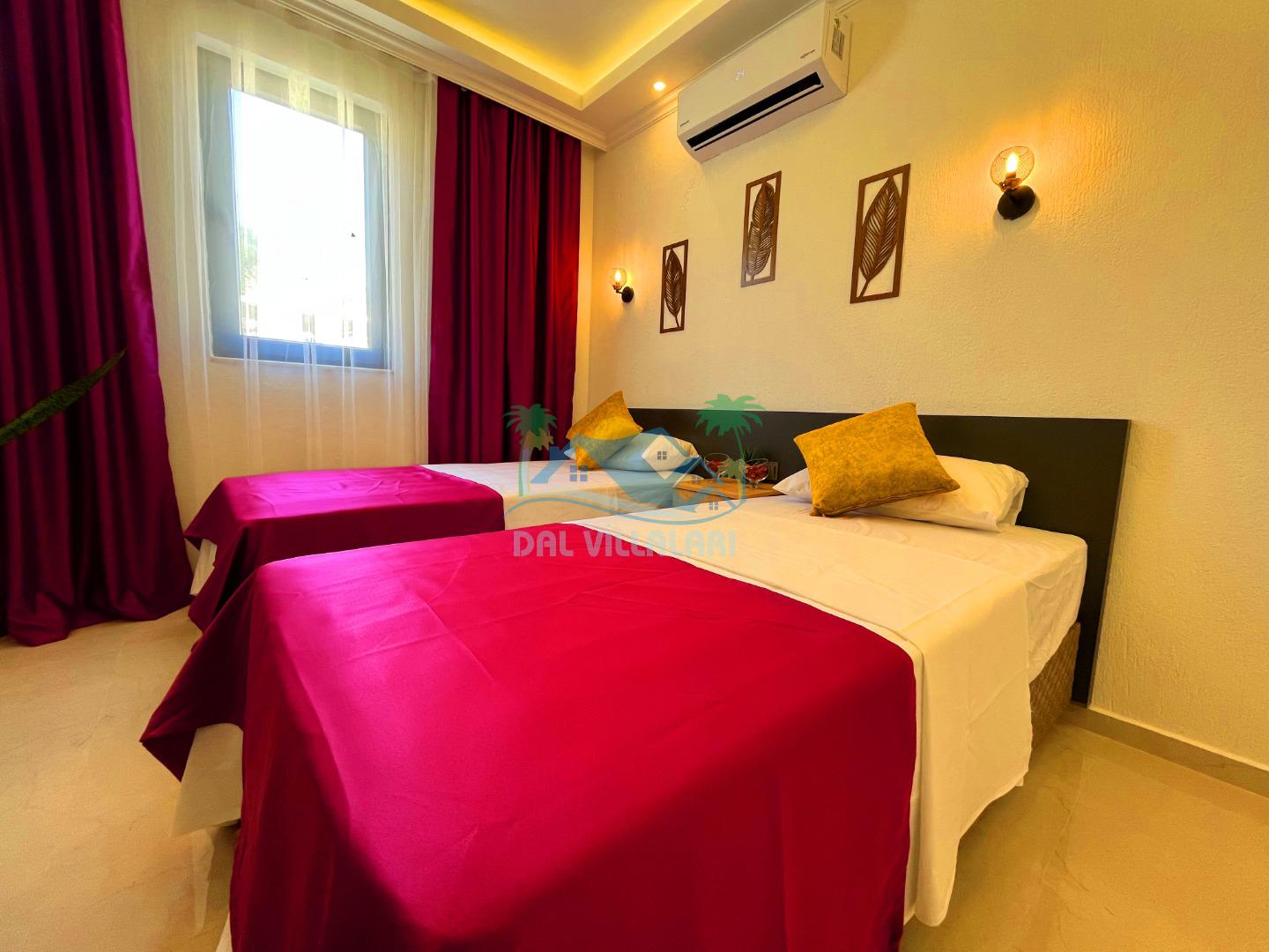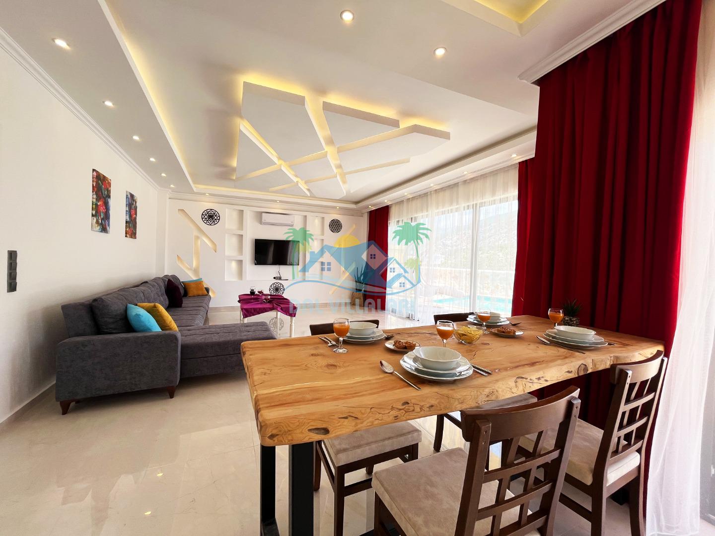 Villa Berrak, modern ve şık dekorasyonuyla dikkat çekerken, geniş ve ferah yaşam alanları ile misafirlere rahat bir konaklama imkanı sağlar. Villanın iç mekanında, kaliteli mobilyalarla donatılmış bir oturma odası, tam donanımlı bir mutfak ve şık yemek alanı bulunmaktadır. İki adet yatak odası, her biri konforlu yataklar ve seçilmiş seçilmiş tekstil ürünleriyle donatılmış olup, misafirlerin dinlenebileceği alanlar sunar.