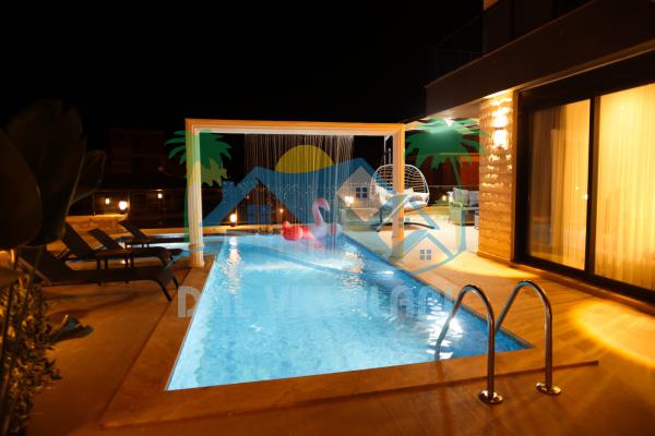 Villanın dış alanında yer alan özel yüzme havuzu, gün boyu serinlemeniz ve tatilin tadını çıkarmanız için idealdir. Güneşlenme alanı, oturma köşeleri ve bahçe düzeni sayesinde doğa ile iç içe huzurlu bir atmosfer sunar.
