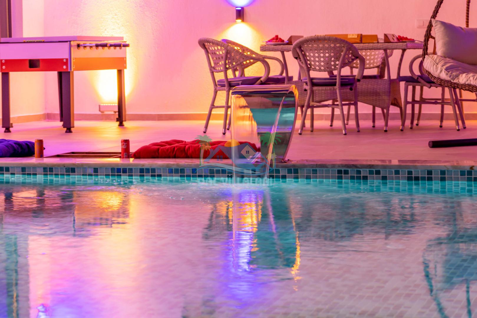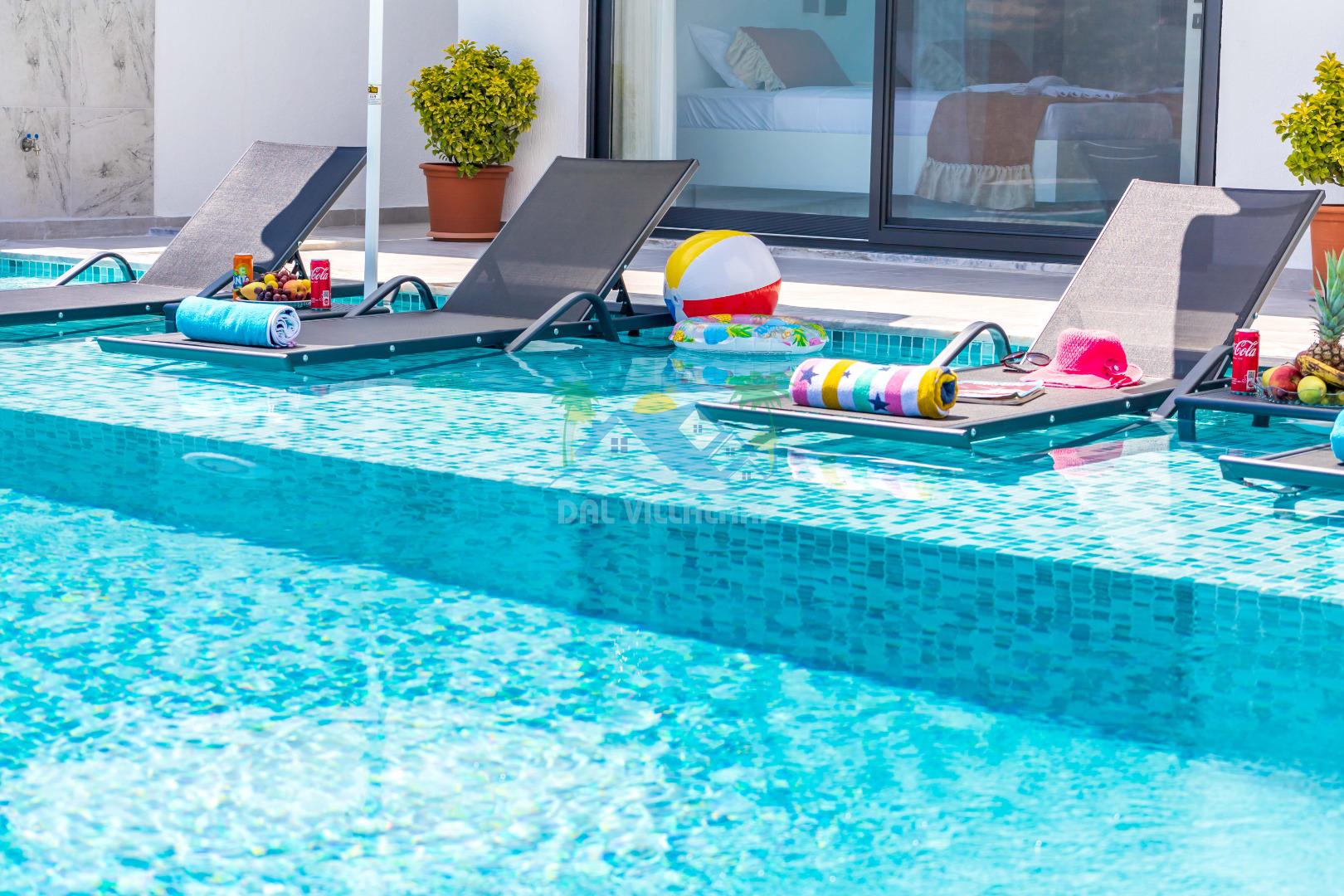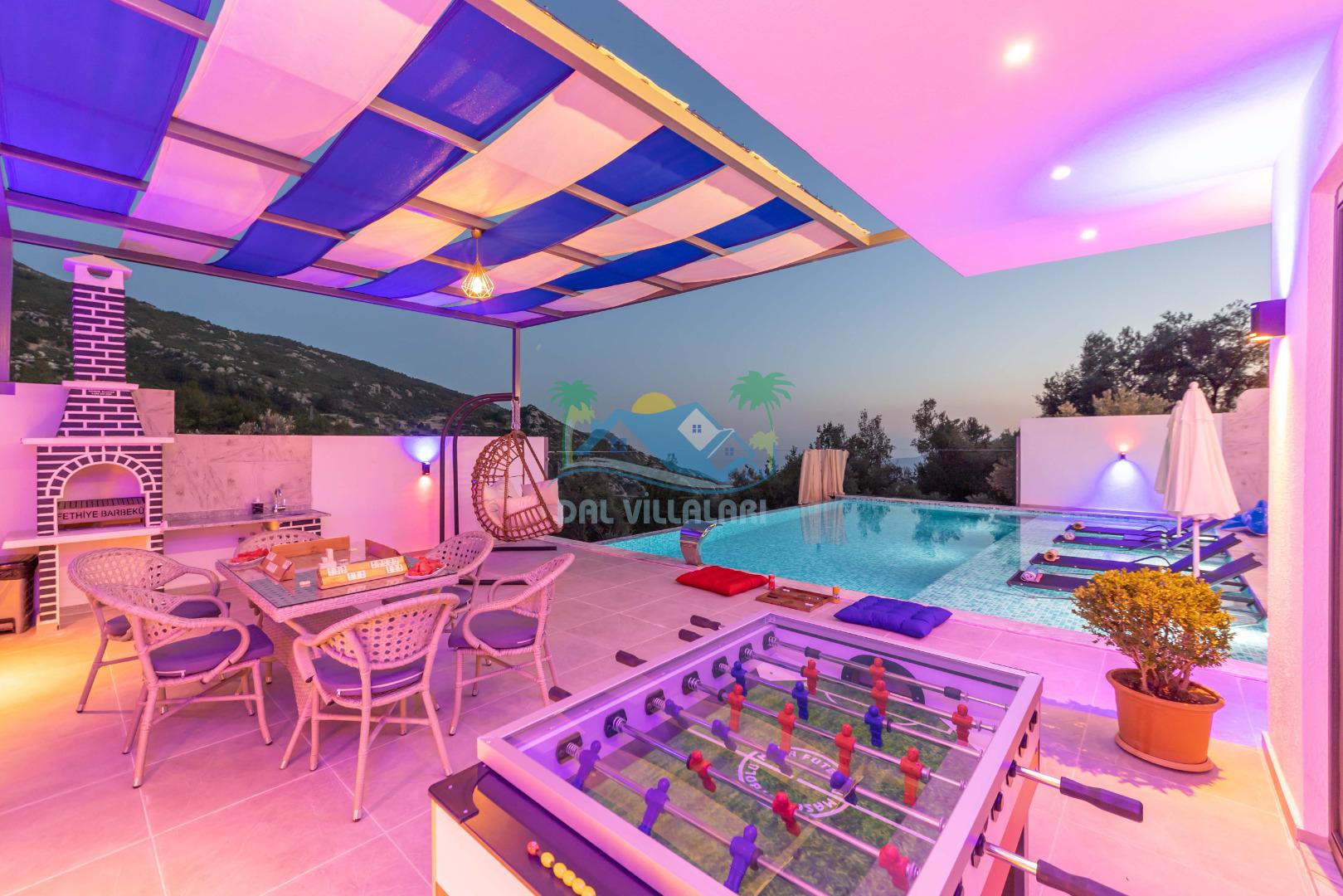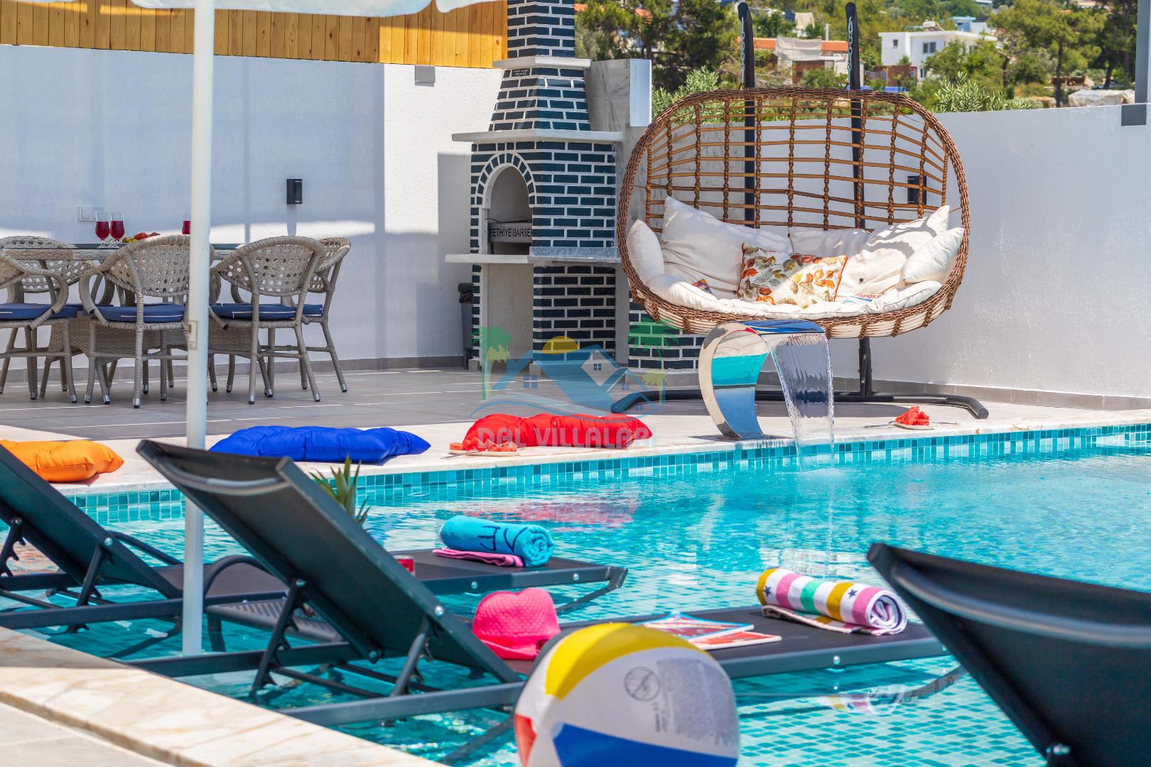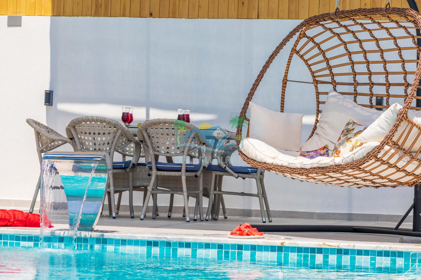Villanın geniş bahçesinde size özel korunaklı yüzme havuzu bulunmaktadır. Ayrıca çocukların güvenle vakit geçirebileceği çocuk havuzu da mevcuttur. Bahçe alanında barbekü, langırt ve dinlenme alanları bulunur. Bu sayede hem yetişkinler hem de çocuklar için keyifli bir tatil ortamı sunulmaktadır.