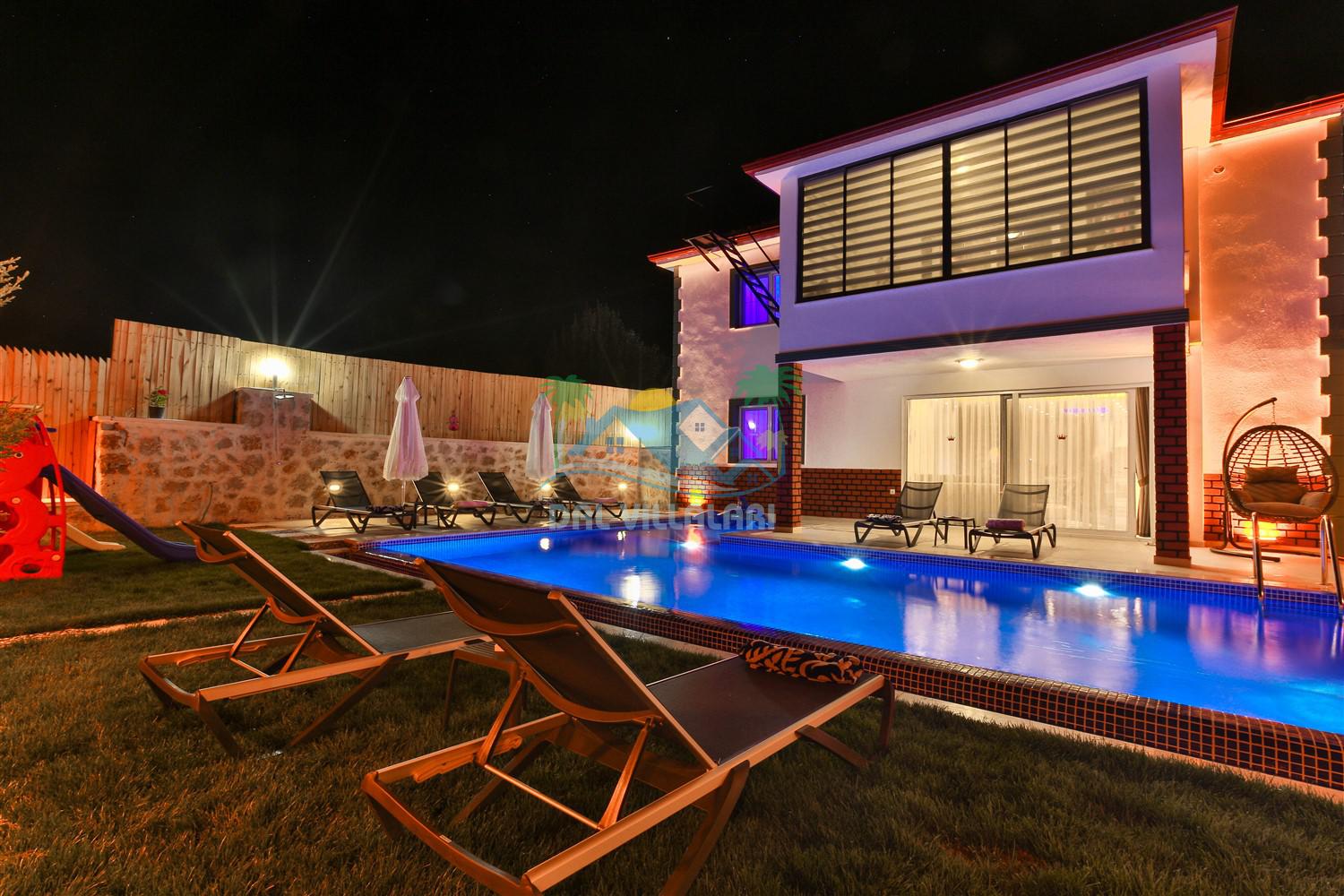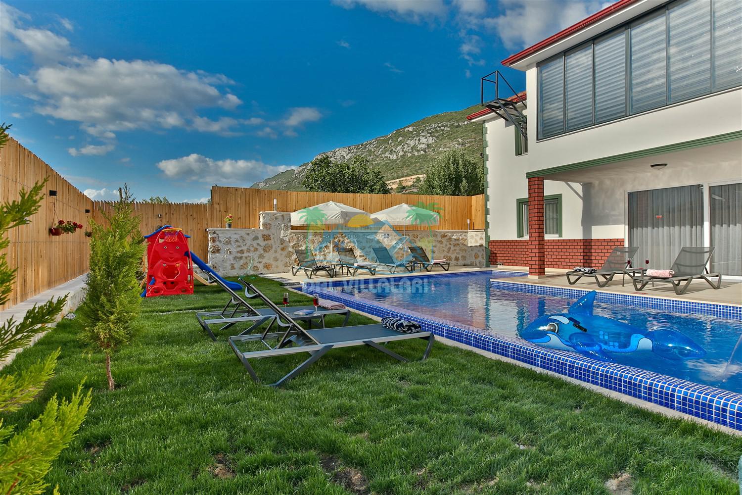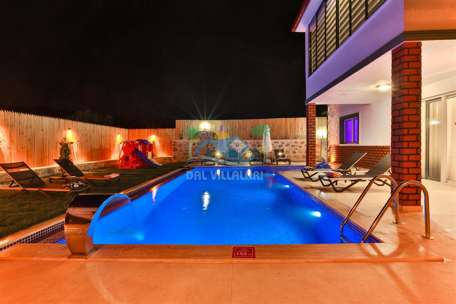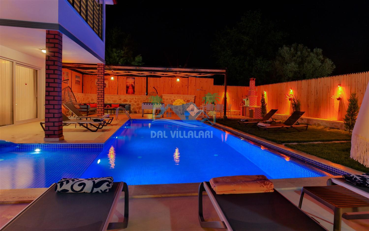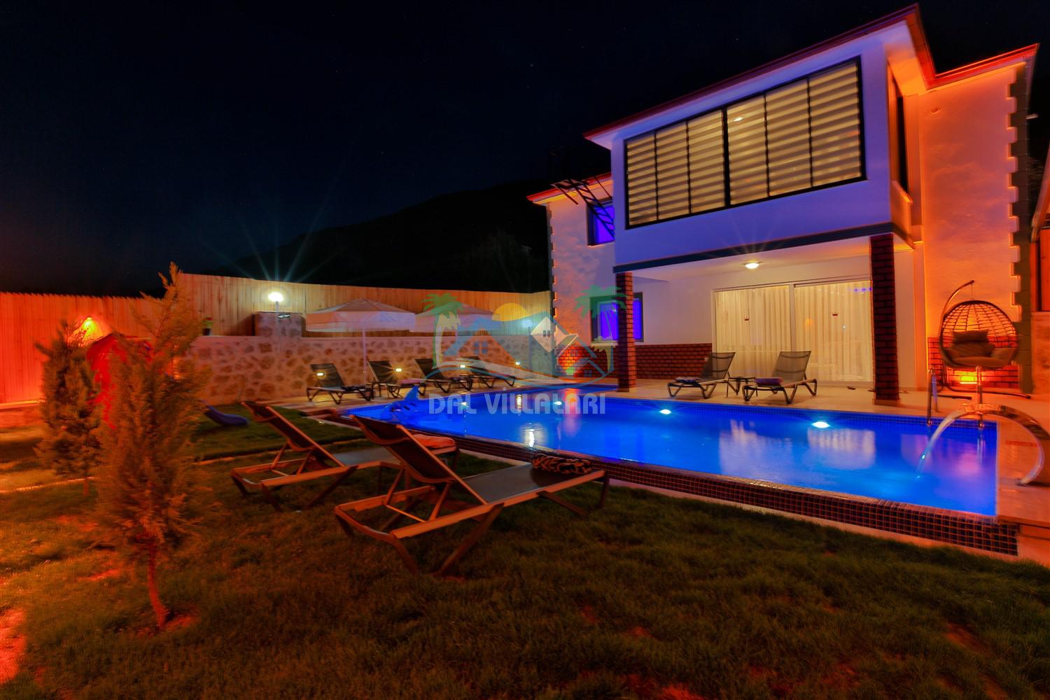 Kalkan Bezirgan köyünde bulunan kiralık balayı villası, doğa içinde, sesszi sakin bir konumda tatil isteyen ailelerimiz için oldukça uygun bir seçenektir. Muhafazakar villalar ve sinema salonlu villalar kategorisinde yer alan villamız, 4 yatak odası ile 8 kişilik konaklama kapasitesine sahiptir. Havuzu korunaklı ve bahçesi dışarıdan görünmeyen Villa Dağhan, mahremiyete önem veren ailelerimiz ve arkadaş grupları için huzur dolu bir tatil fırsatı sunuyor. Ayrıca havuz terasından yemyeşil bir bahçesi, masa tenisi, basketbol sahası, çocuklar için çocuk havuzu ve oyun parkı bulunan villamızda oldukça eğlenceli bir tatil geçirebilirsiniz.