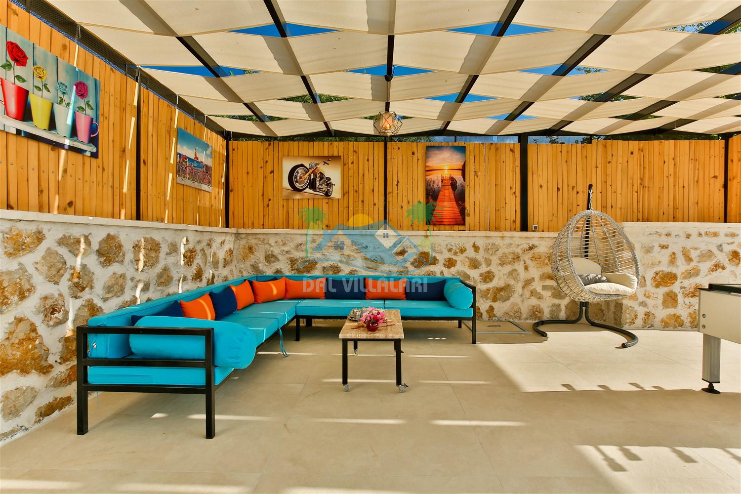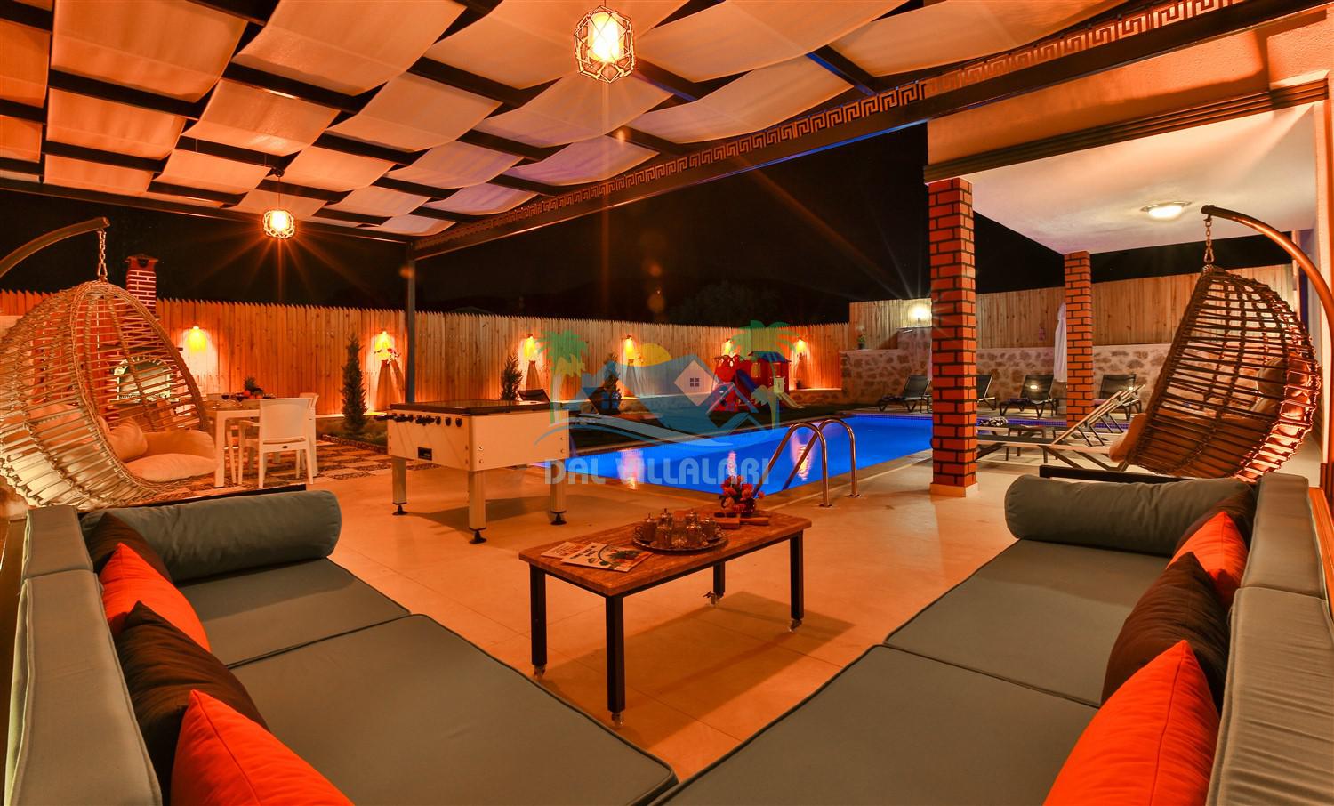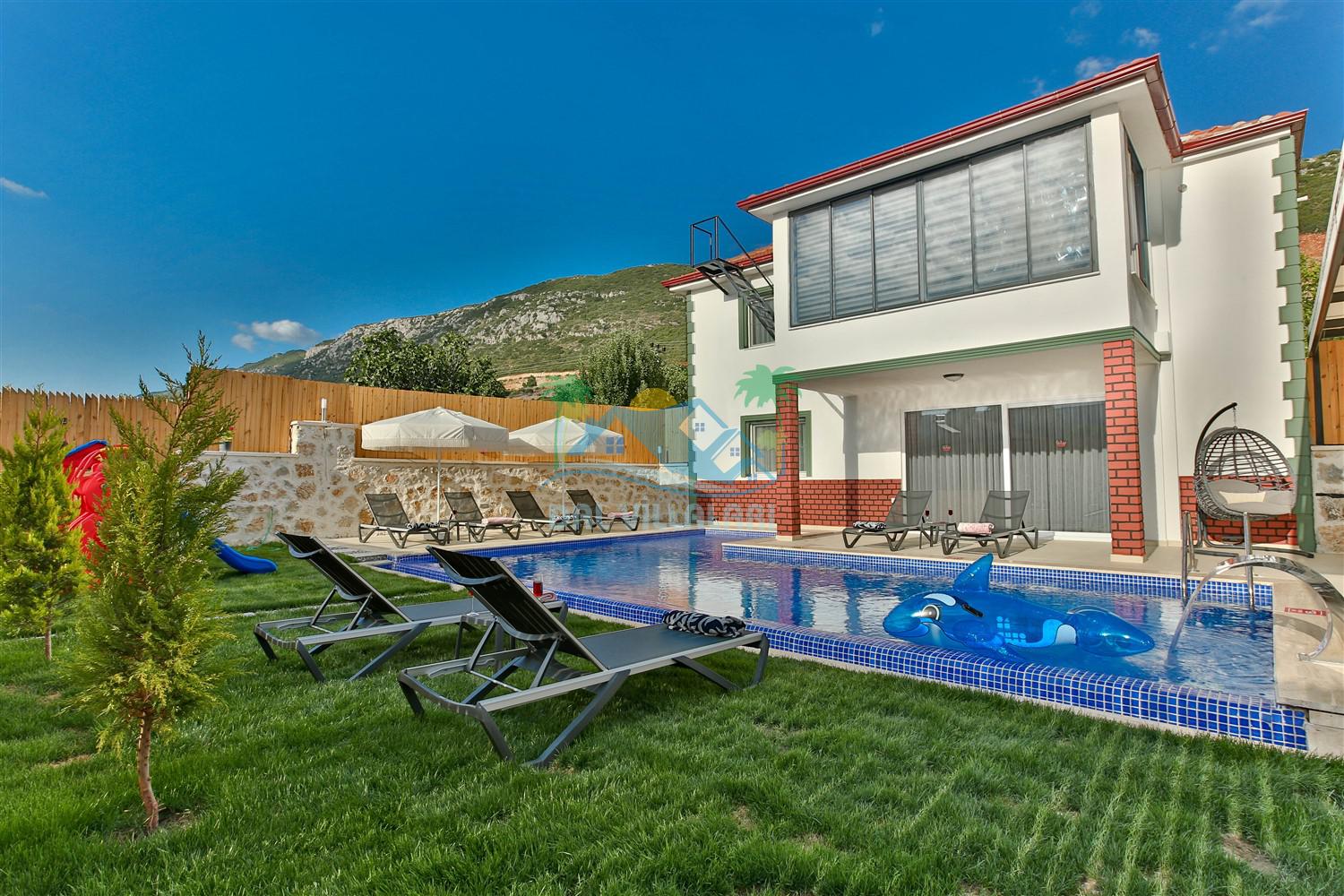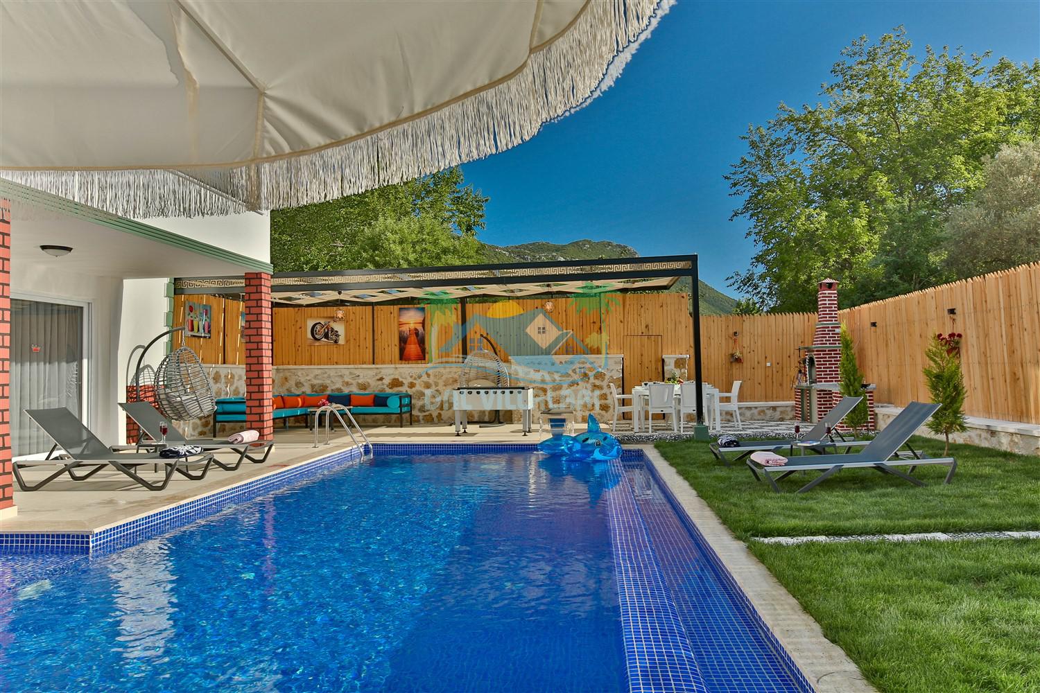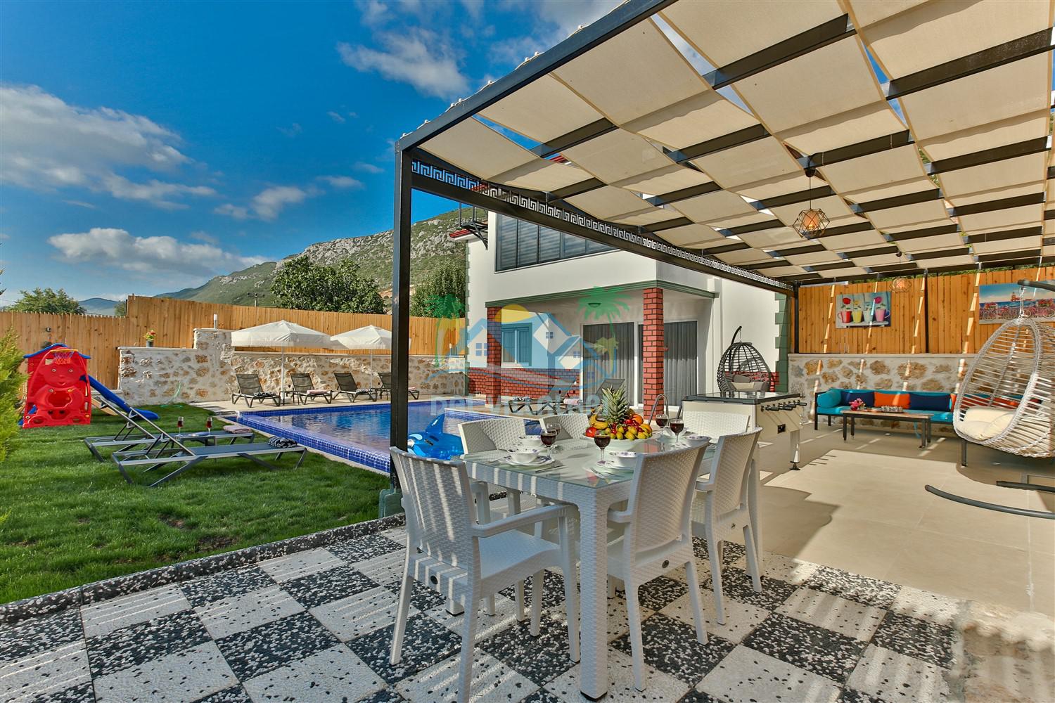 Kalkan Bezirgan köyünde bulunan kiralık balayı villası, doğa içinde, sesszi sakin bir konumda tatil isteyen ailelerimiz için oldukça uygun bir seçenektir. Muhafazakar villalar ve sinema salonlu villalar kategorisinde yer alan villamız, 4 yatak odası ile 8 kişilik konaklama kapasitesine sahiptir. Havuzu korunaklı ve bahçesi dışarıdan görünmeyen Villa Dağhan, mahremiyete önem veren ailelerimiz ve arkadaş grupları için huzur dolu bir tatil fırsatı sunuyor. Ayrıca havuz terasından yemyeşil bir bahçesi, masa tenisi, basketbol sahası, çocuklar için çocuk havuzu ve oyun parkı bulunan villamızda oldukça eğlenceli bir tatil geçirebilirsiniz.