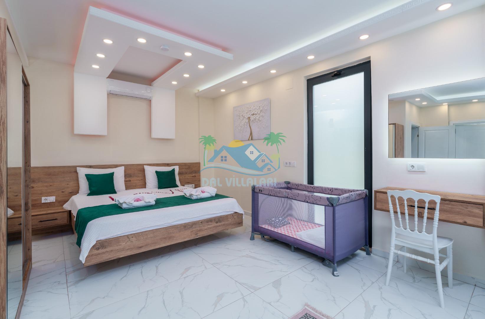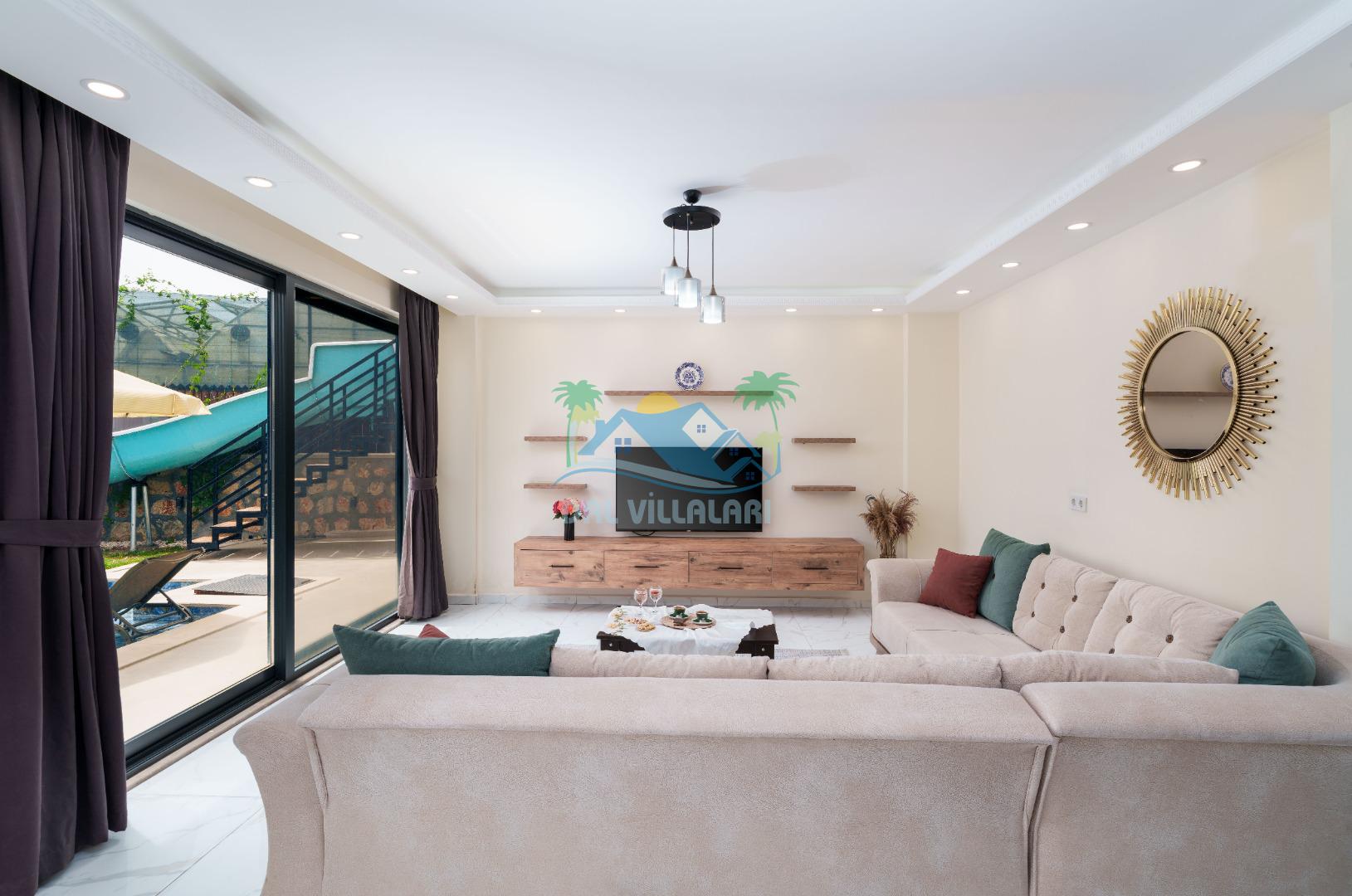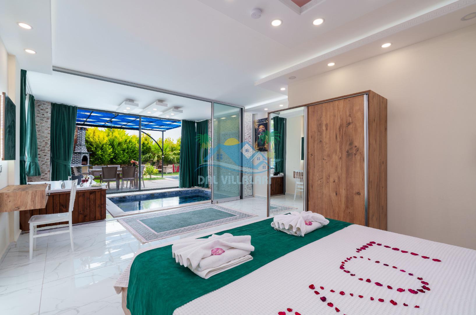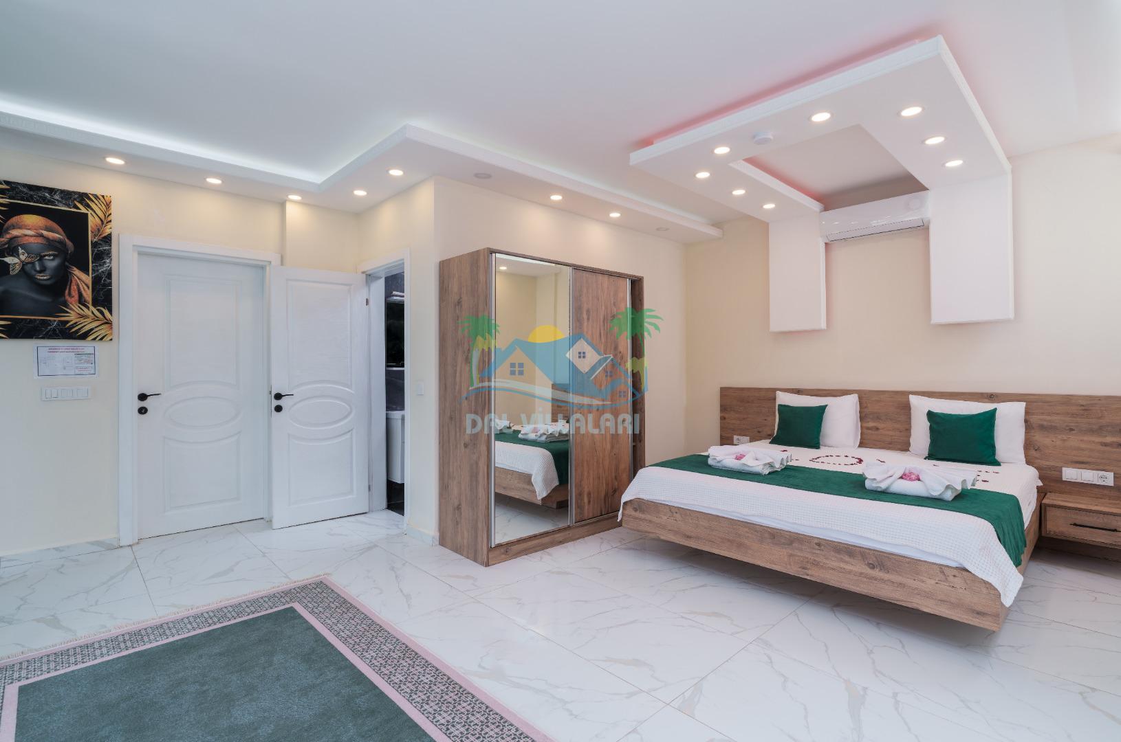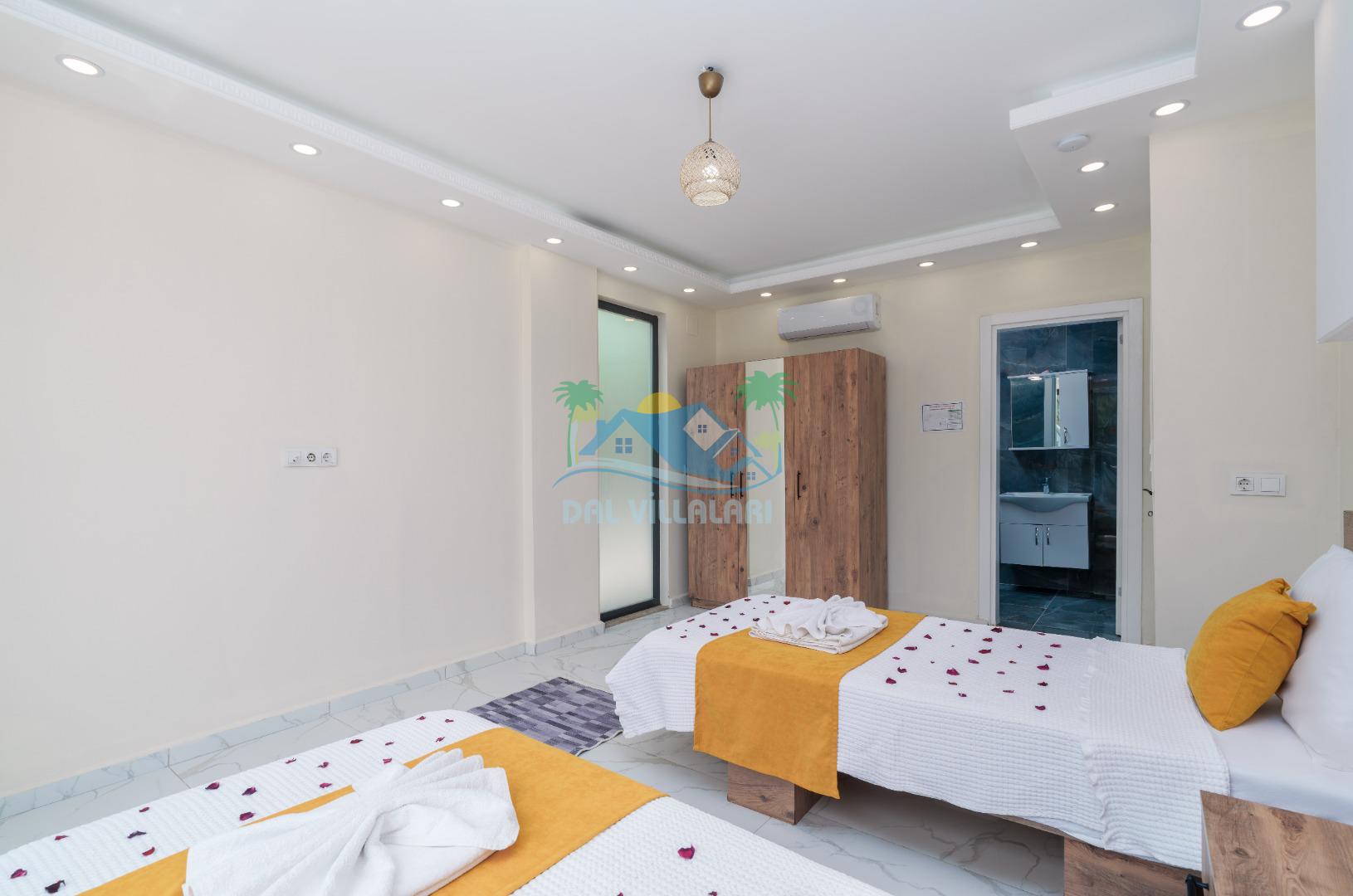 Villamız iki yatak odalıdır. Birinci yatak odasında çift kişilik yatak, klima, banyo ve jakuzi; İkinci odada ise iki tek kişilik yatak, klima ve banyo bulunmaktadır. Salon içerisinde mutfak, oturma grubu, televizyon ve klima mevcuttur.
