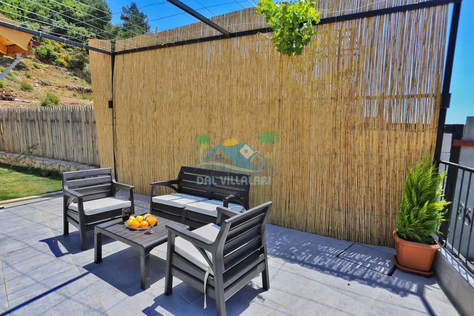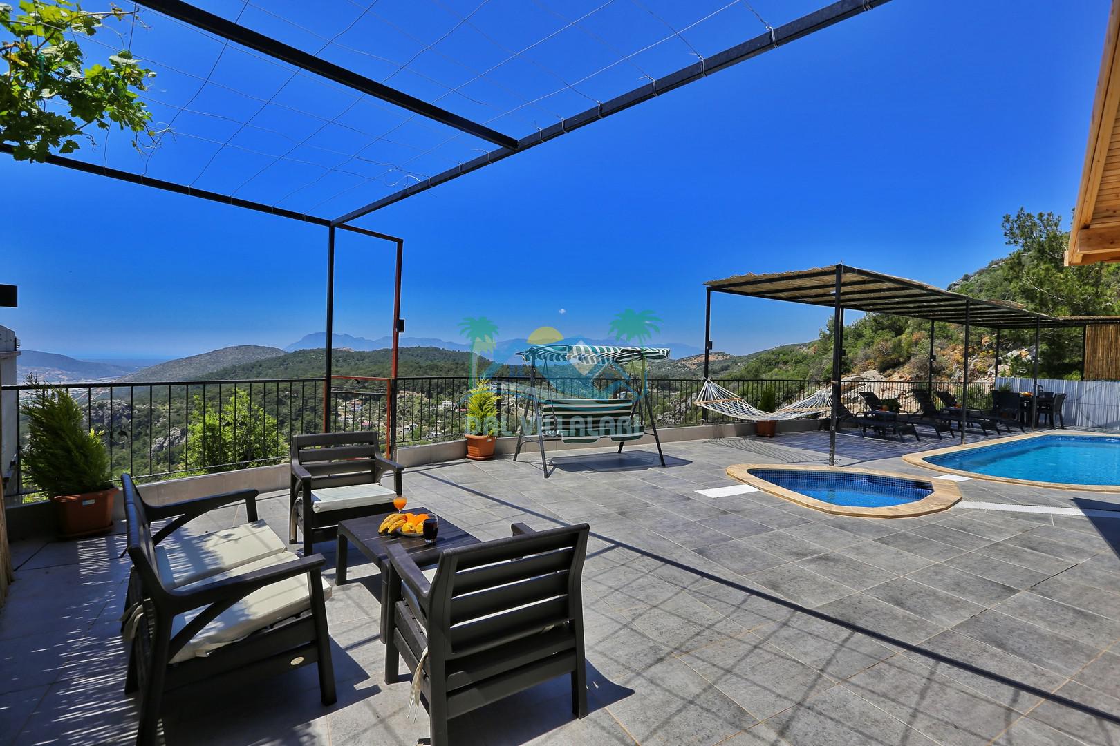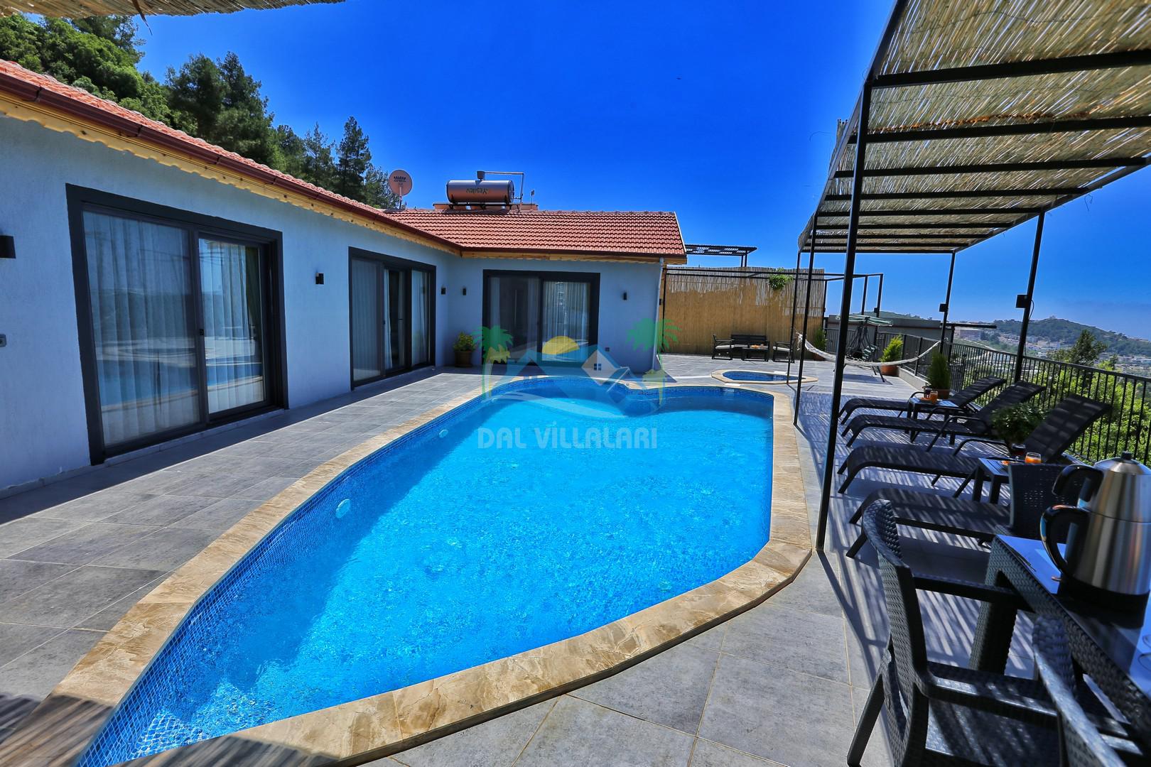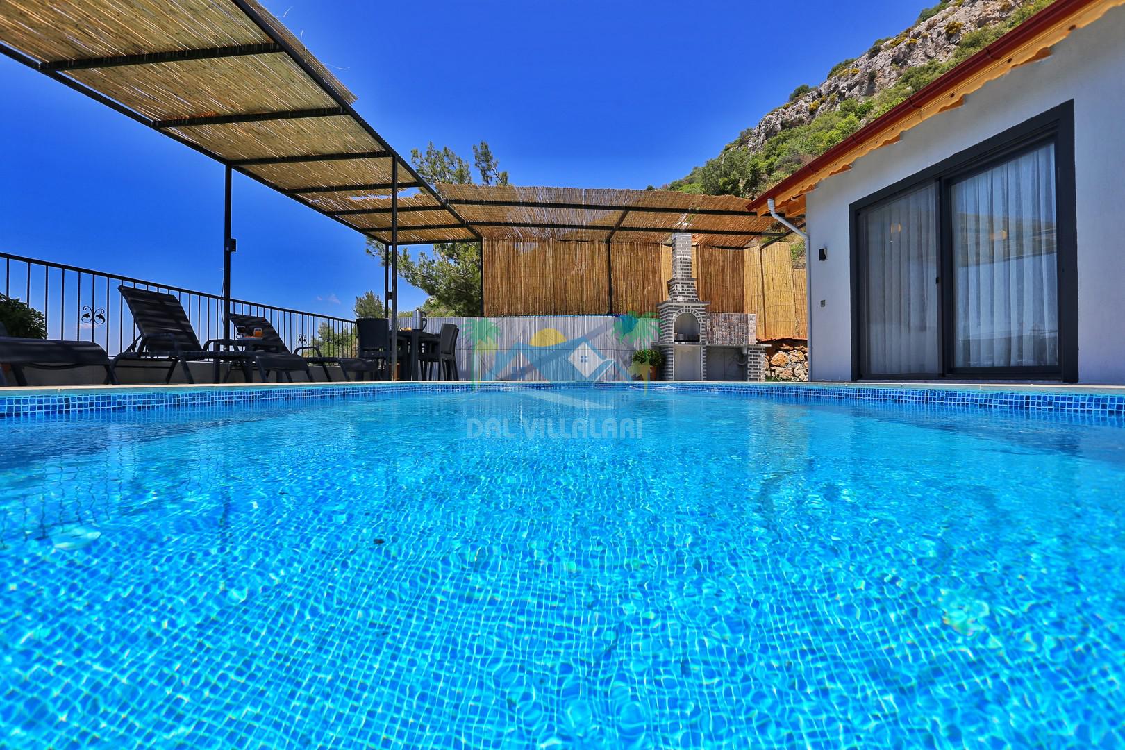 Villamızın verandası etkileyici doğa manzarasına hakim olup günün her saatinde huzurlu bir ortam sağlar. Korunaklı özel yüzme havuzu ise gözlerden uzak tatil geçirmek isteyen muhafazakâr misafirler için büyük avantajdır.
