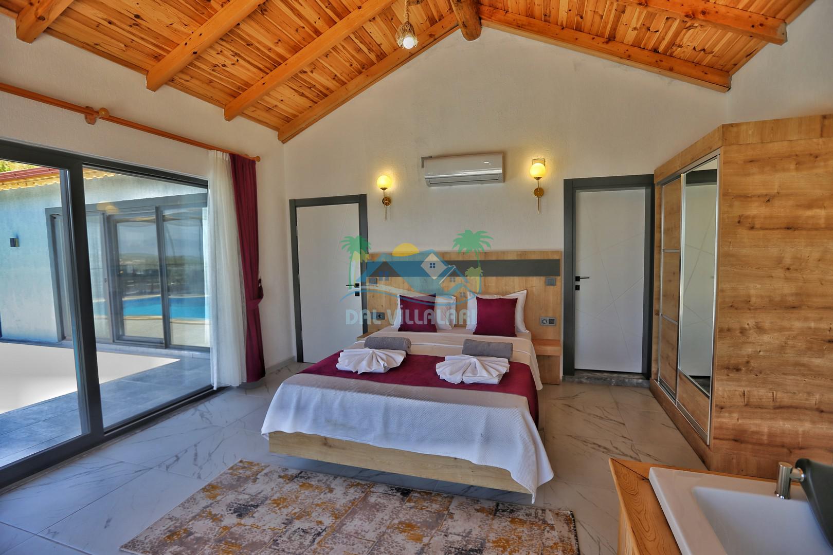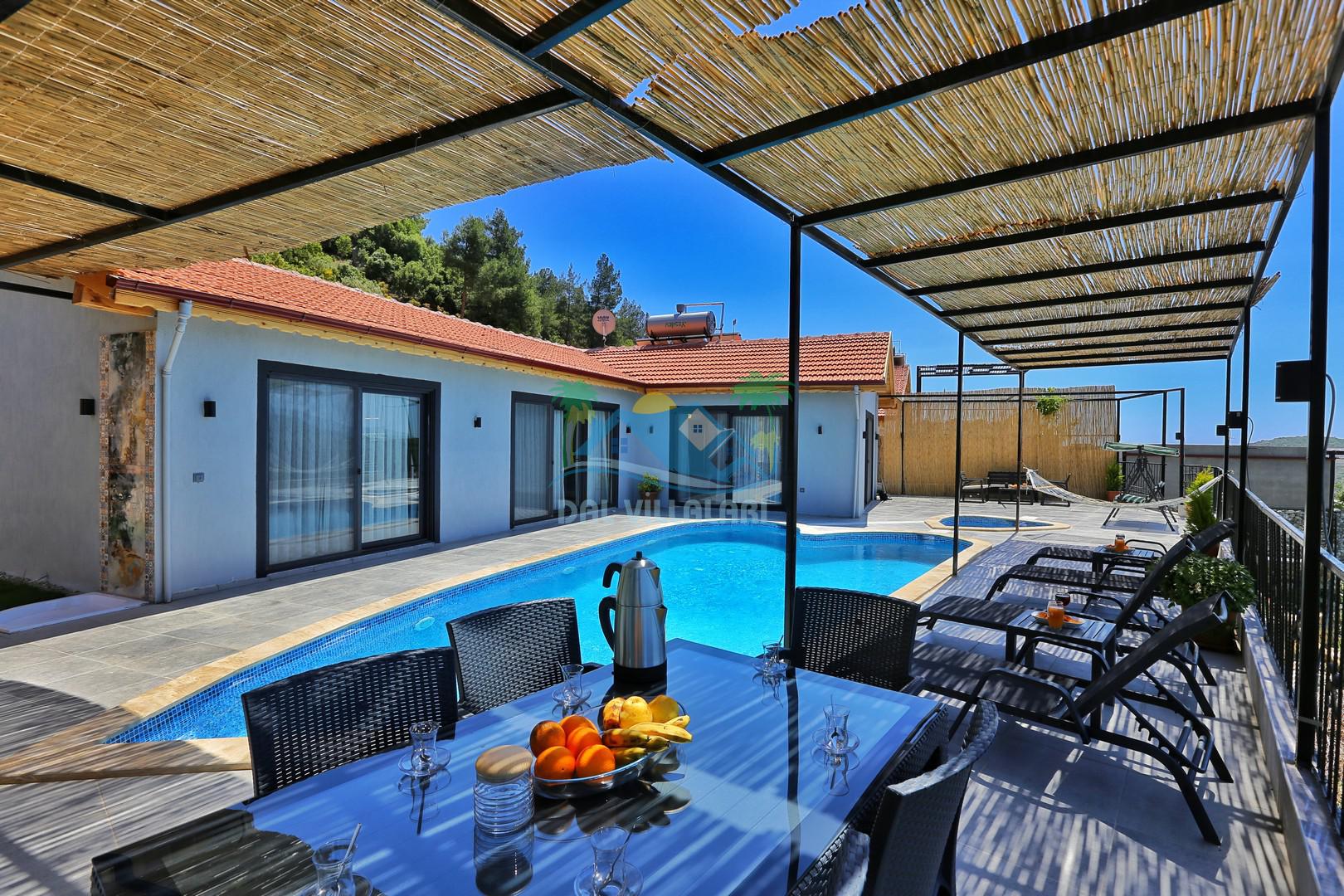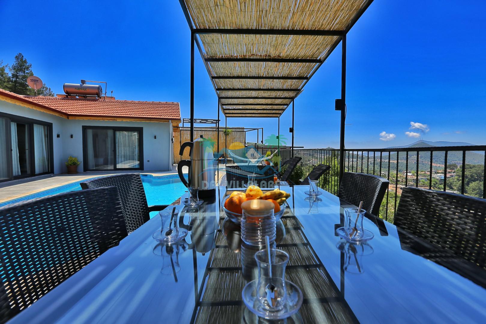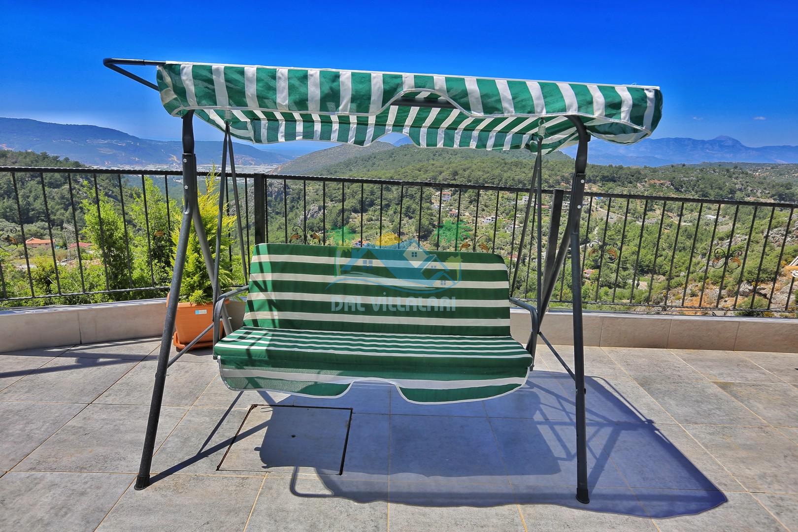 Villamızın verandası etkileyici doğa manzarasına hakim olup günün her saatinde huzurlu bir ortam sağlar. Korunaklı özel yüzme havuzu ise gözlerden uzak tatil geçirmek isteyen muhafazakâr misafirler için büyük avantajdır.