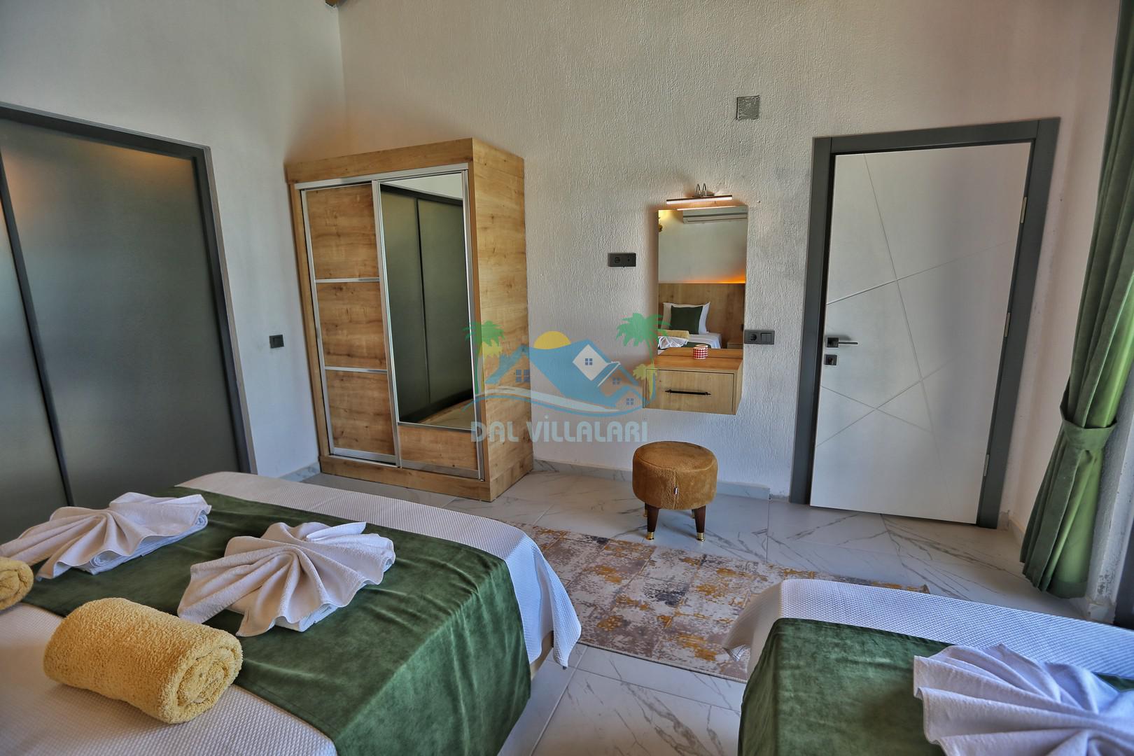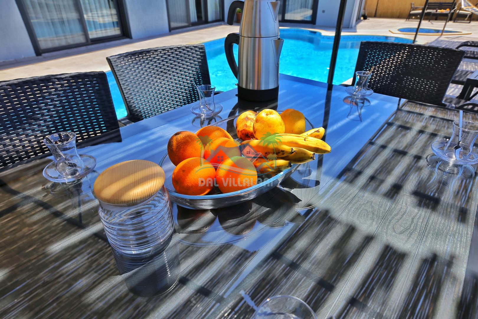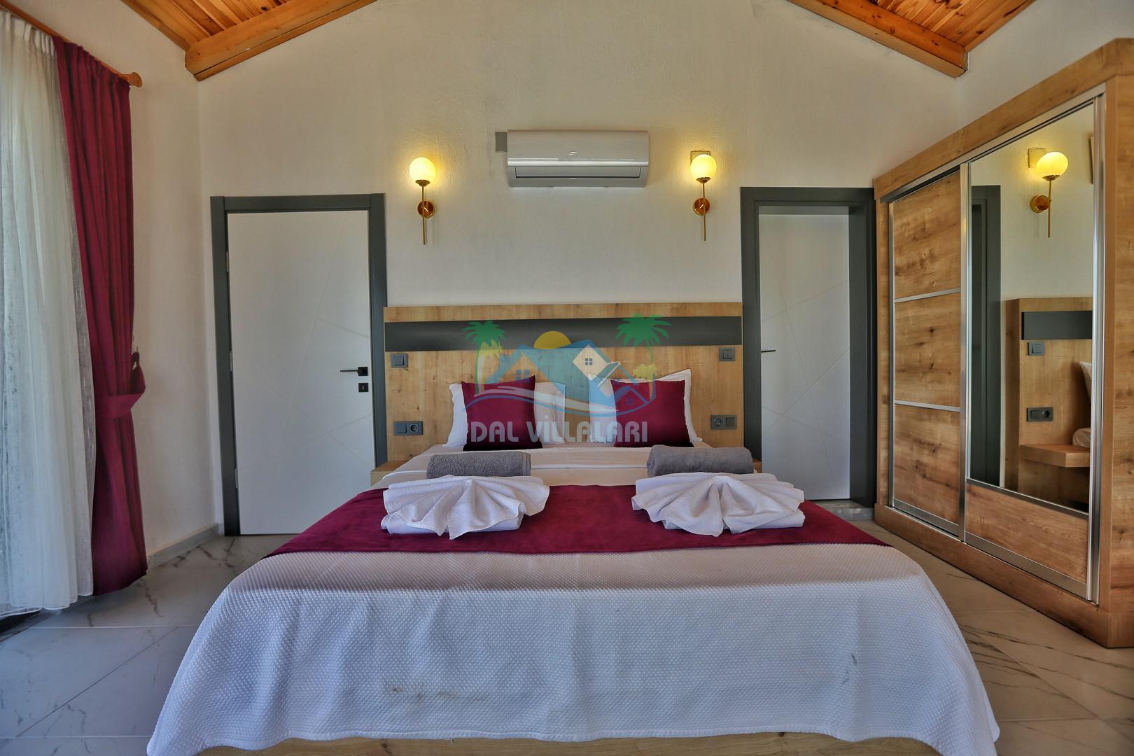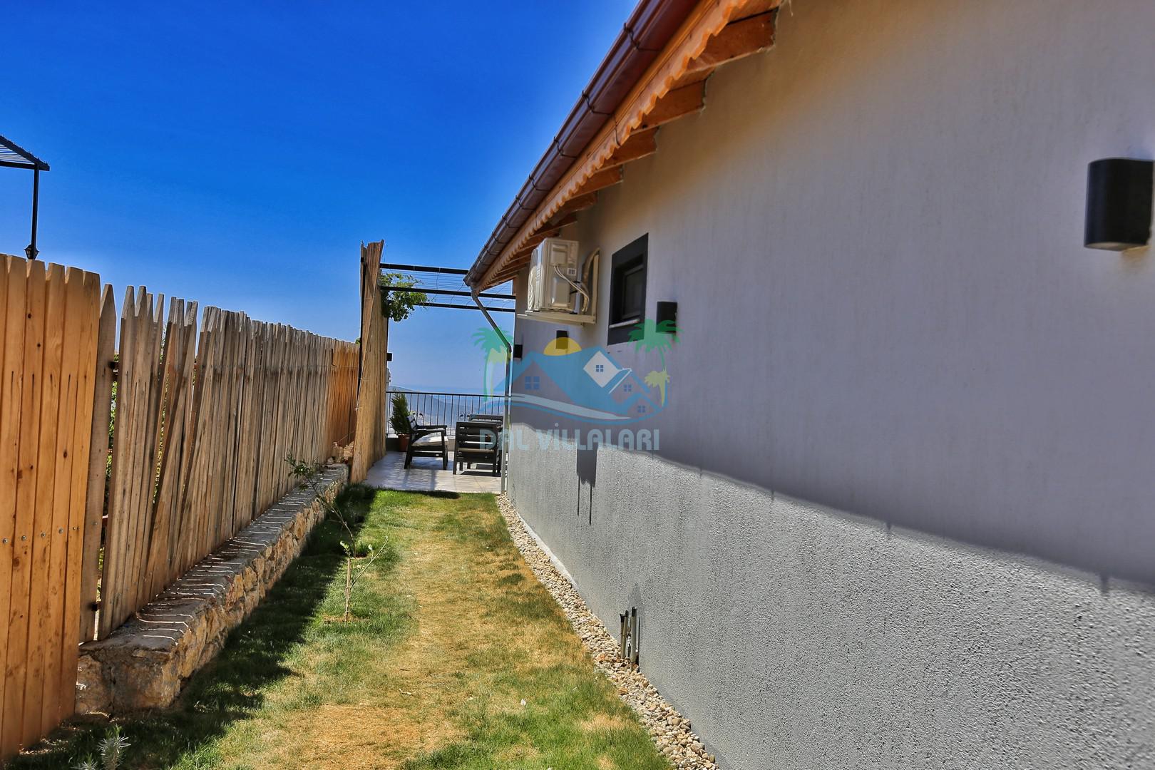 Villamızın verandası etkileyici doğa manzarasına hakim olup günün her saatinde huzurlu bir ortam sağlar. Korunaklı özel yüzme havuzu ise gözlerden uzak tatil geçirmek isteyen muhafazakâr misafirler için büyük avantajdır.