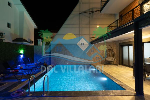 Merkezi noktalara rahat olaşabileceğiniz, sevdiklerinizle birlikte güvenli ve huzurlu bir tatilin keyfini sürebileceğiniz, güneşin ve temiz havanın tadına doyacağınız villanın havuz terasında şezlong takımı, oturma grubu, salıncak ve barbekü alanı bulunmaktadır. Yine havuz terasına açılan konforlu oturma odası ve açık mutfağı; birinci yatak odasında çift kişilik yatak, ebeveyn banyosu, ikinci yatak odasında çift kişilik yatak ve banyo, diğer odasında ise iki tek kişilik yatak ve ebeveyn banyosu bulunmaktadır.