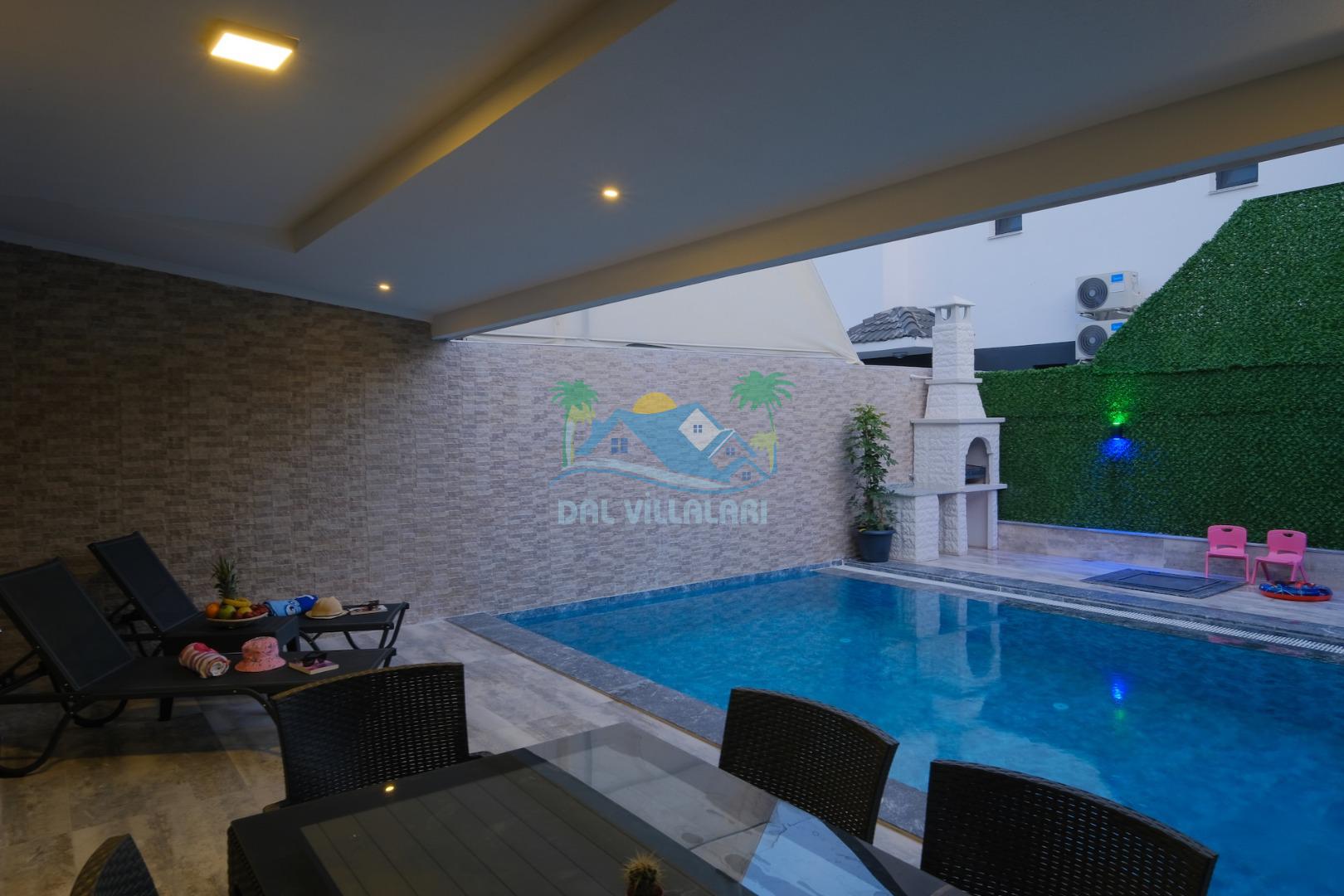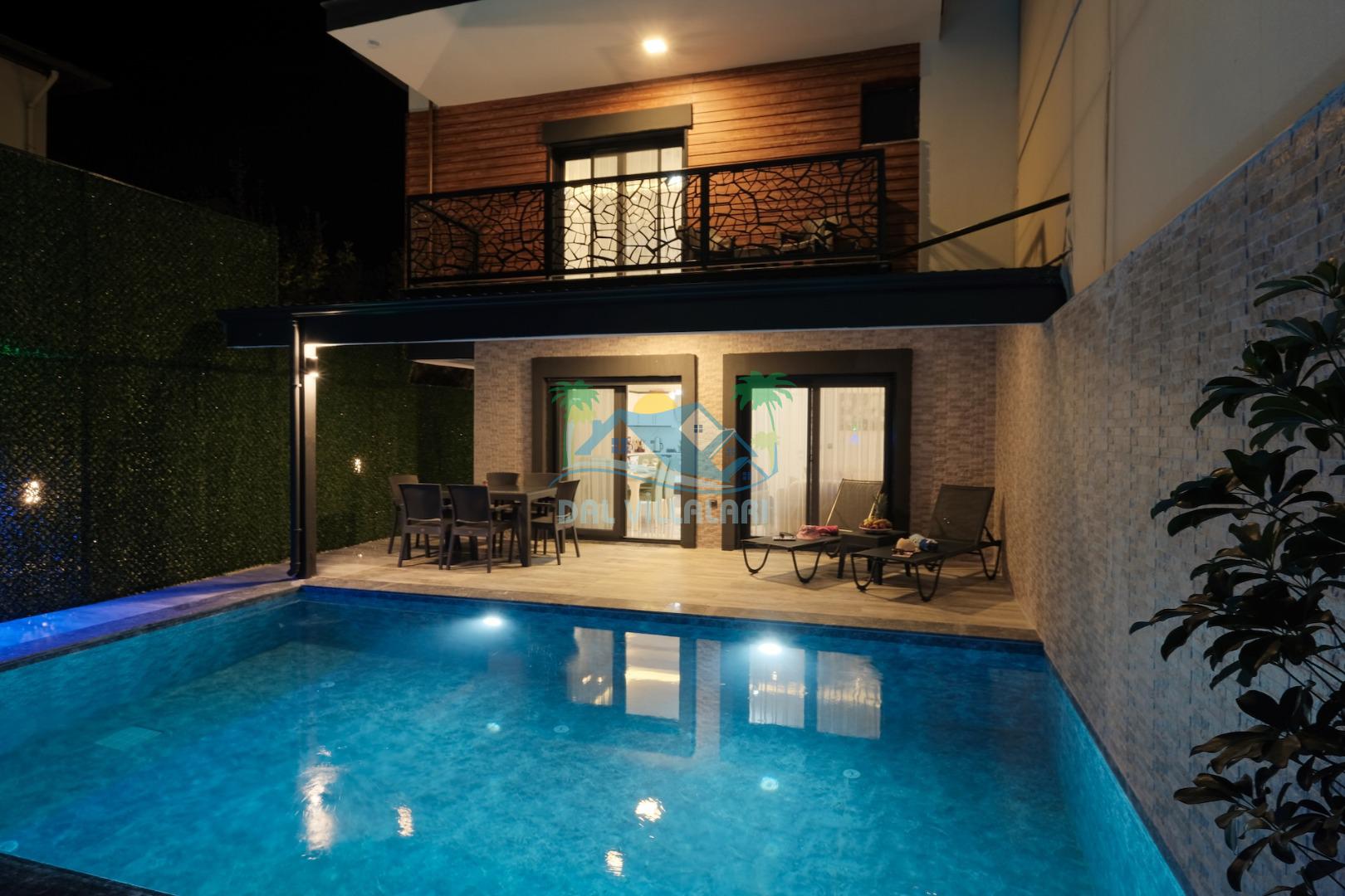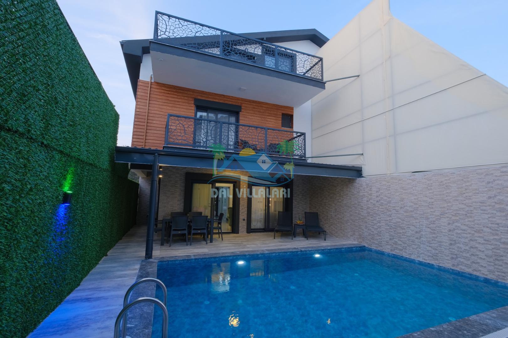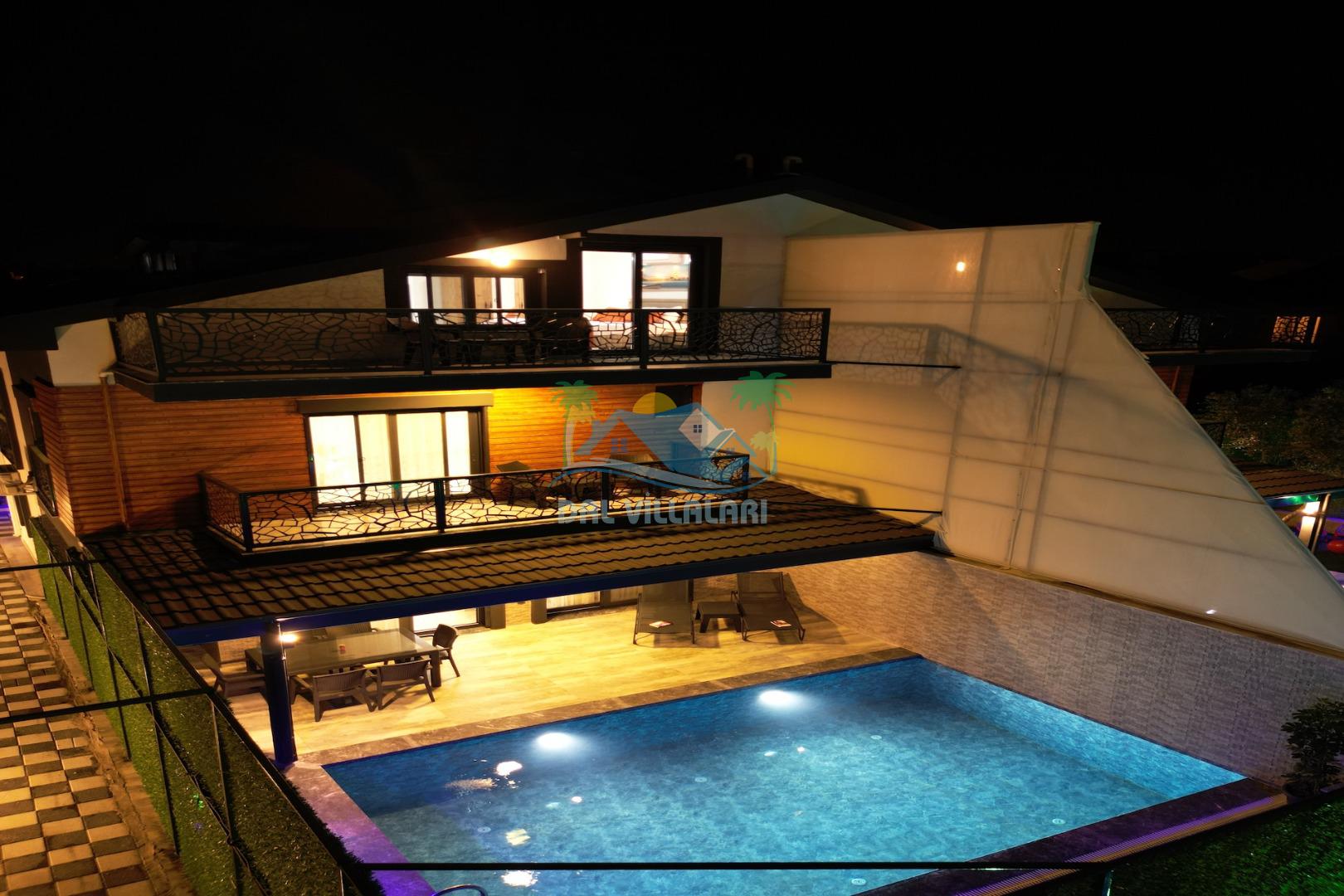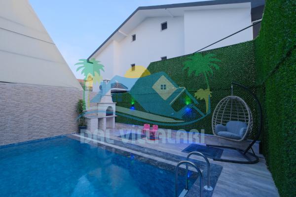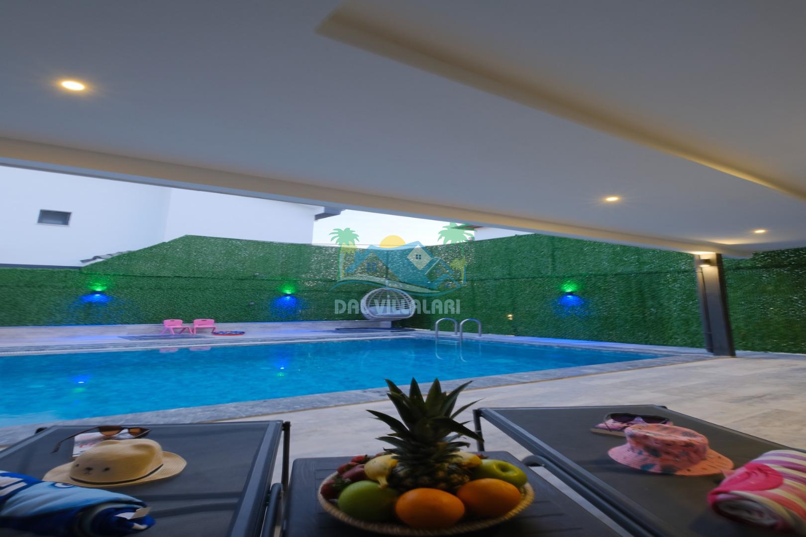 Merkezi noktalara rahat olaşabileceğiniz, sevdiklerinizle birlikte güvenli ve huzurlu bir tatilin keyfini sürebileceğiniz, güneşin ve temiz havanın tadına doyacağınız villanın havuz terasında şezlong takımı, oturma grubu, salıncak ve barbekü alanı bulunmaktadır. Yine havuz terasına açılan konforlu oturma odası ve açık mutfağı; birinci yatak odasında çift kişilik yatak, ebeveyn banyosu, ikinci yatak odasında çift kişilik yatak ve banyo, diğer odasında ise iki tek kişilik yatak ve ebeveyn banyosu bulunmaktadır.