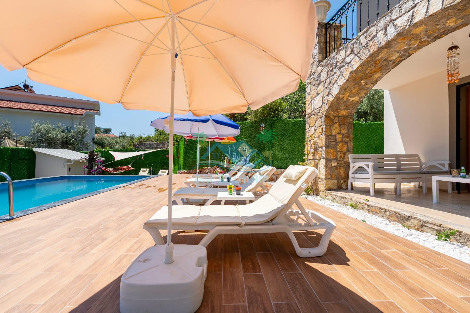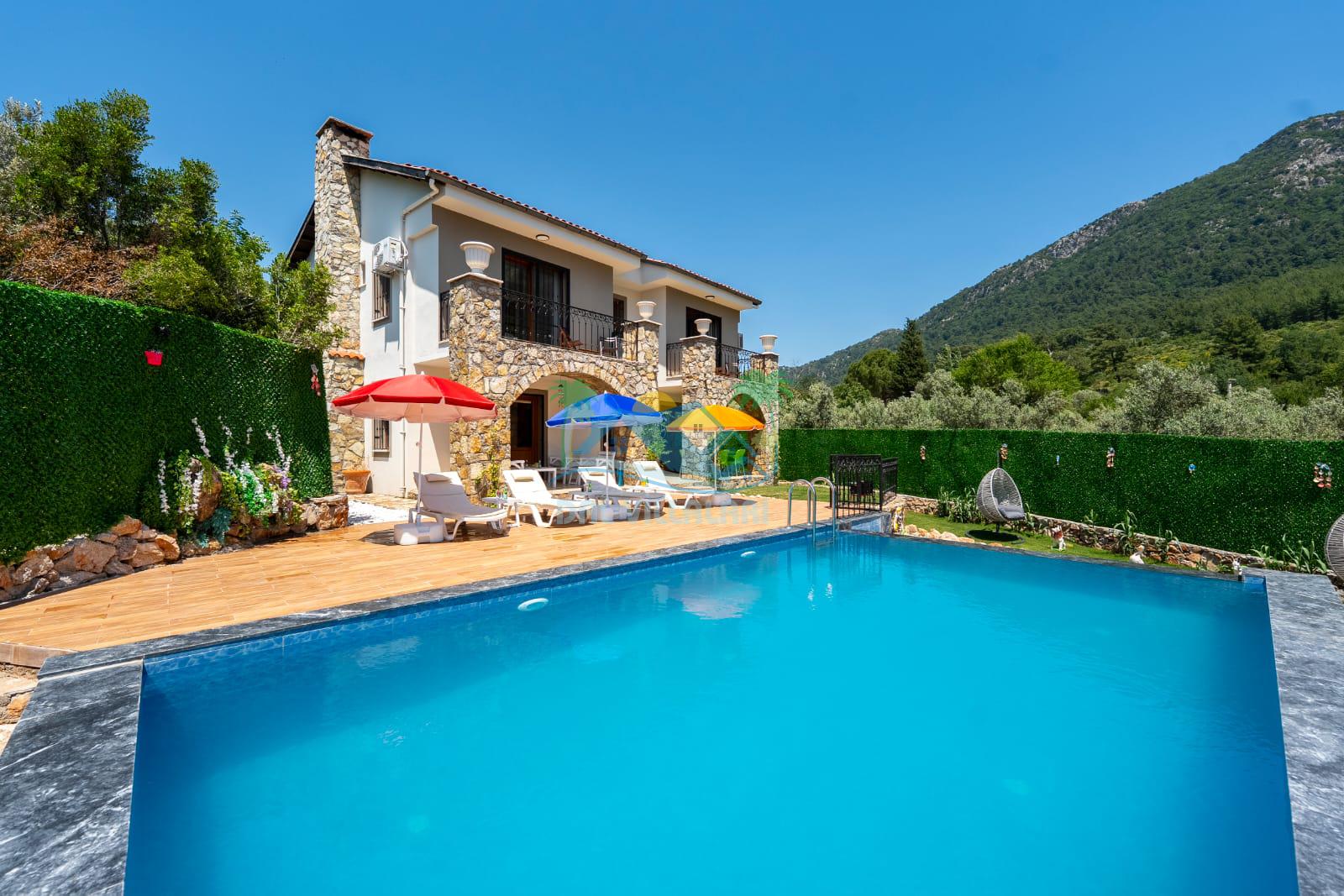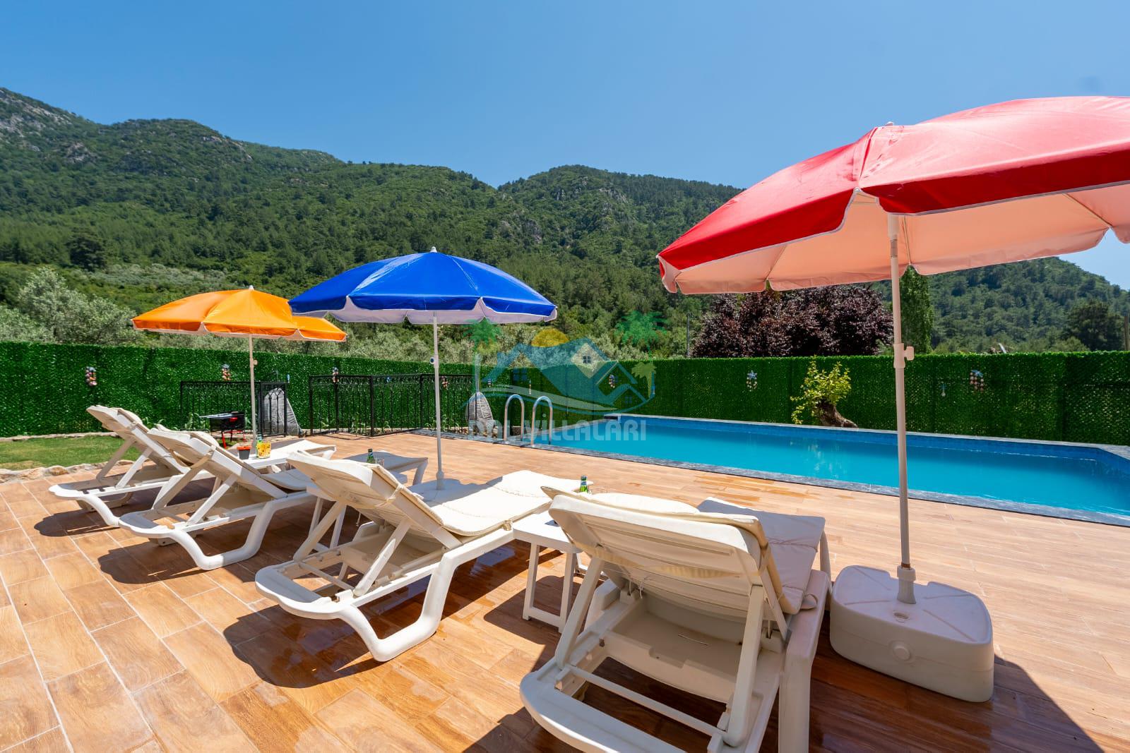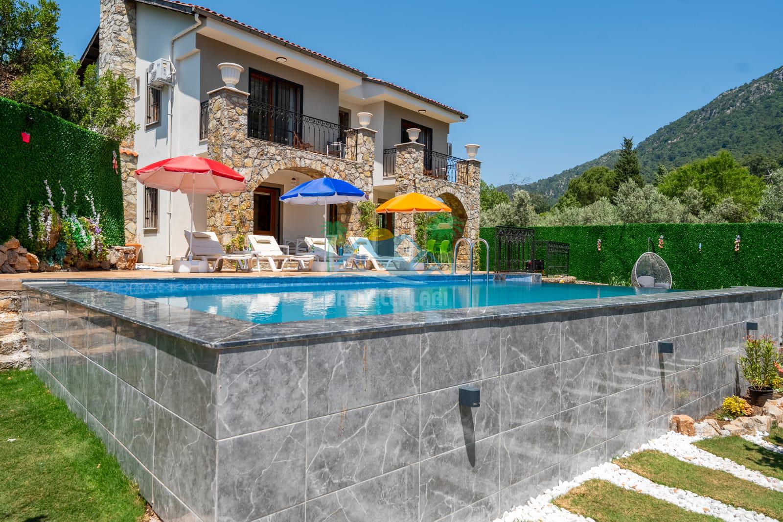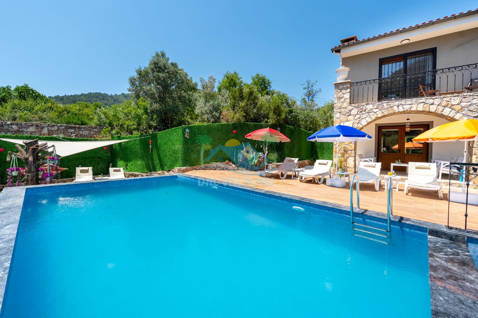 Geniş havuz alanı, konforlu oturma grubu ve özel barbekü alanına sahip olup iç mekanı da oldukça keyifli ve konforlu detaylar barındırmaktadır; oturma odası, donanımlı mutfağı; bir yatak odasında çift kişilik yatak; ikinci yatak odasında çift kişilik yatak;üçüncü yatak odasında ise bir adet iki kişilik ranza bulunan villa doğada güvenle ve huzurla planladığınız Fethiye tatiline ev sahipliği yapacaktır. Konforunuz döz önünde bulundurularak dizayn edilmiş bahçe alanı geniş havuz terasında sahiptir ve havuz bahçe alanında doğanın ve gökyüzünün tadını çıkarabileceğiniz bir havuz alanı bulunmaktadır. Geniş bahçe alanında keyifli zaman geçireceğiniz villa da havuz keyfinize doyamayacağız anlar geçireceksiniz.