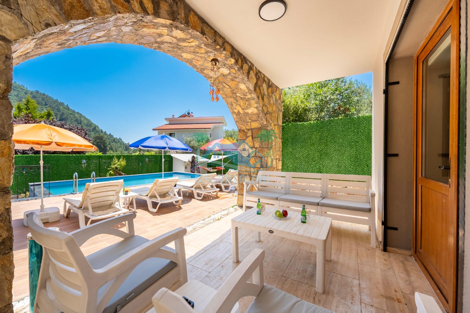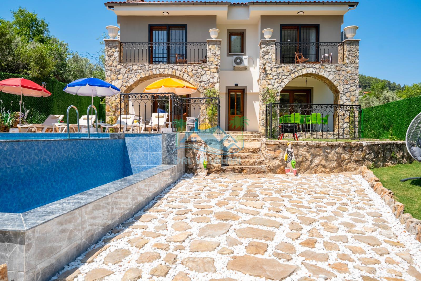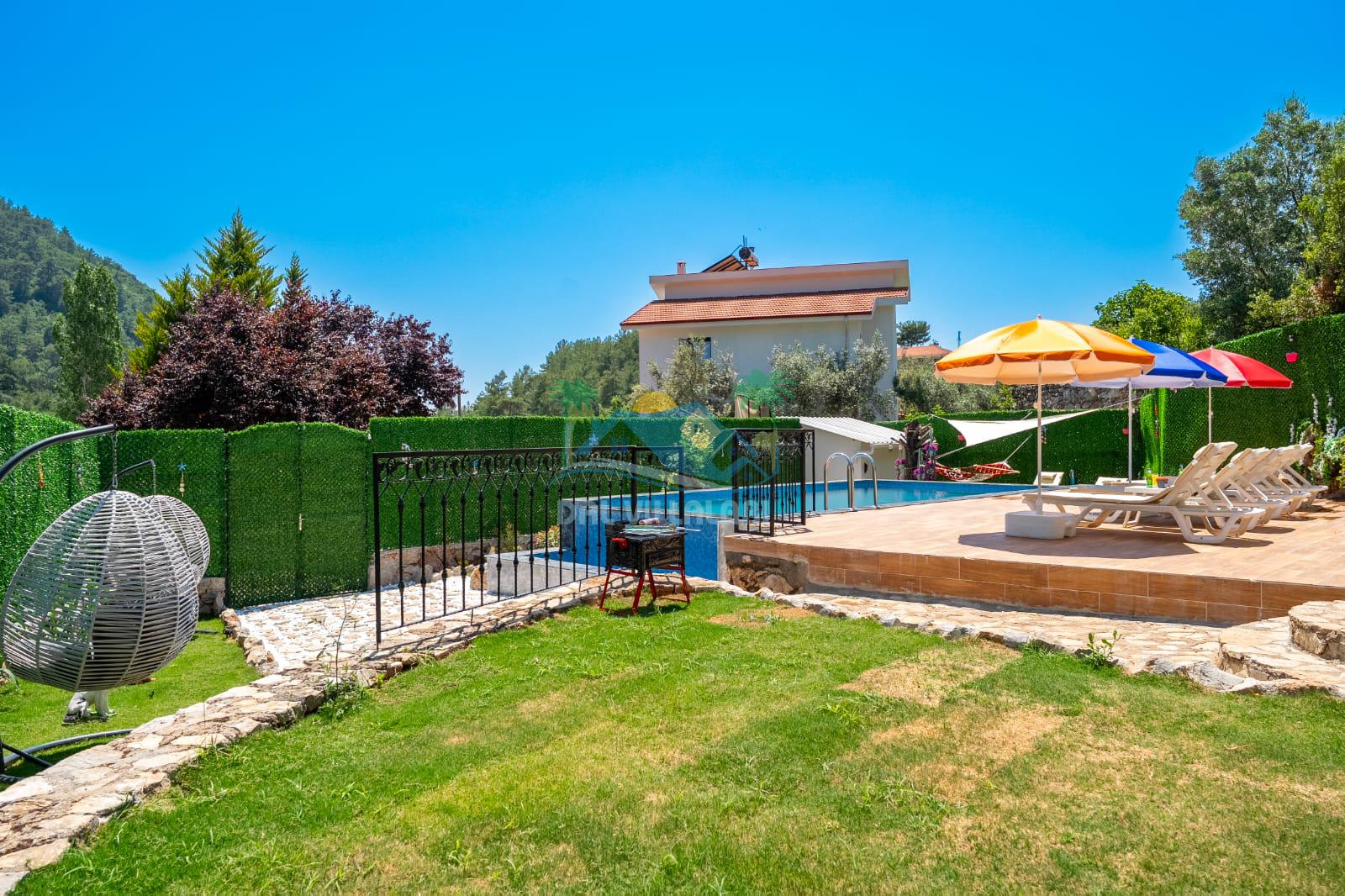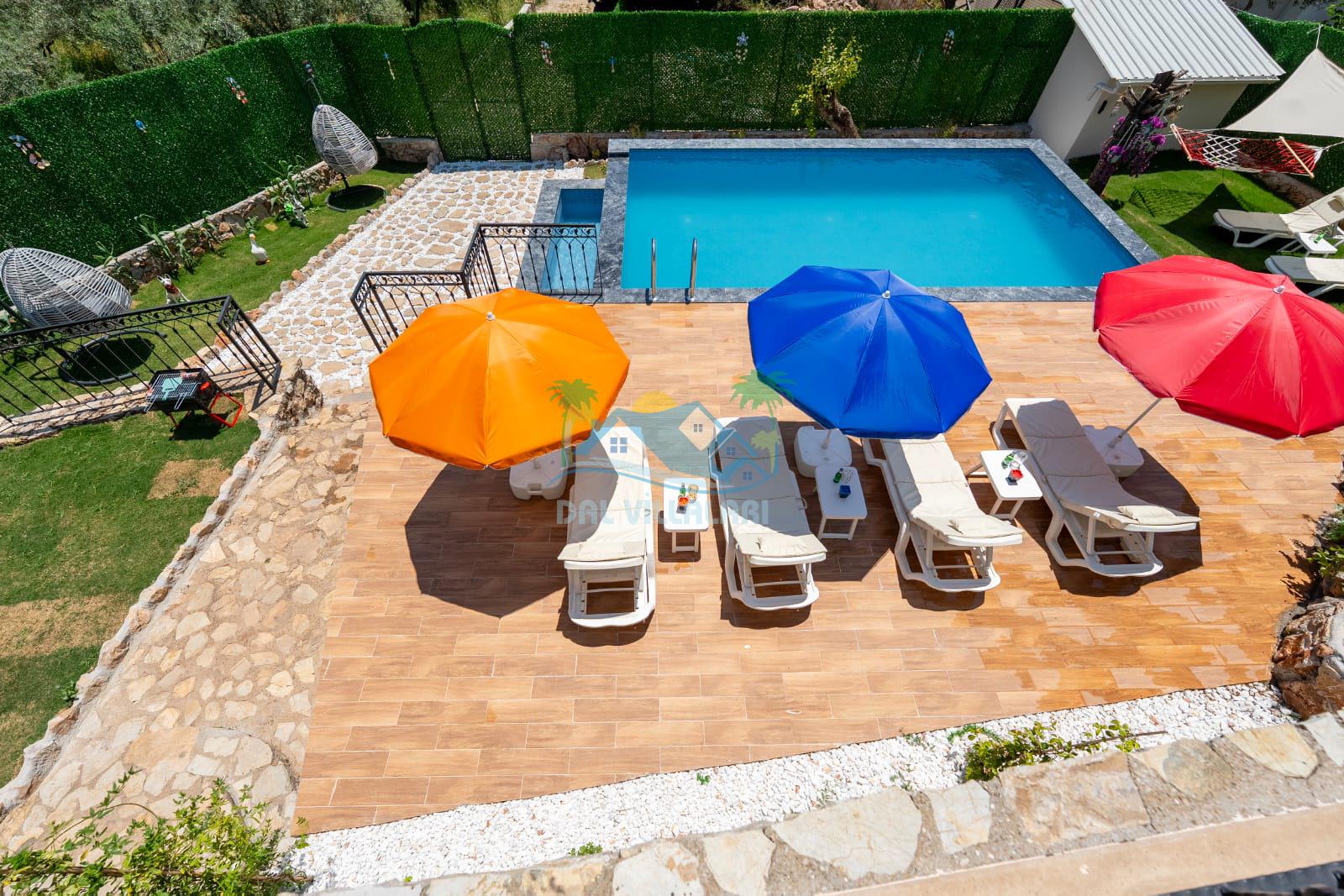 Geniş havuz alanı, konforlu oturma grubu ve özel barbekü alanına sahip olup iç mekanı da oldukça keyifli ve konforlu detaylar barındırmaktadır; oturma odası, donanımlı mutfağı; bir yatak odasında çift kişilik yatak; ikinci yatak odasında çift kişilik yatak;üçüncü yatak odasında ise bir adet iki kişilik ranza bulunan villa doğada güvenle ve huzurla planladığınız Fethiye tatiline ev sahipliği yapacaktır. Konforunuz döz önünde bulundurularak dizayn edilmiş bahçe alanı geniş havuz terasında sahiptir ve havuz bahçe alanında doğanın ve gökyüzünün tadını çıkarabileceğiniz bir havuz alanı bulunmaktadır. Geniş bahçe alanında keyifli zaman geçireceğiniz villa da havuz keyfinize doyamayacağız anlar geçireceksiniz.