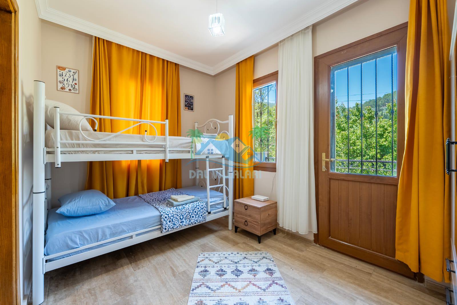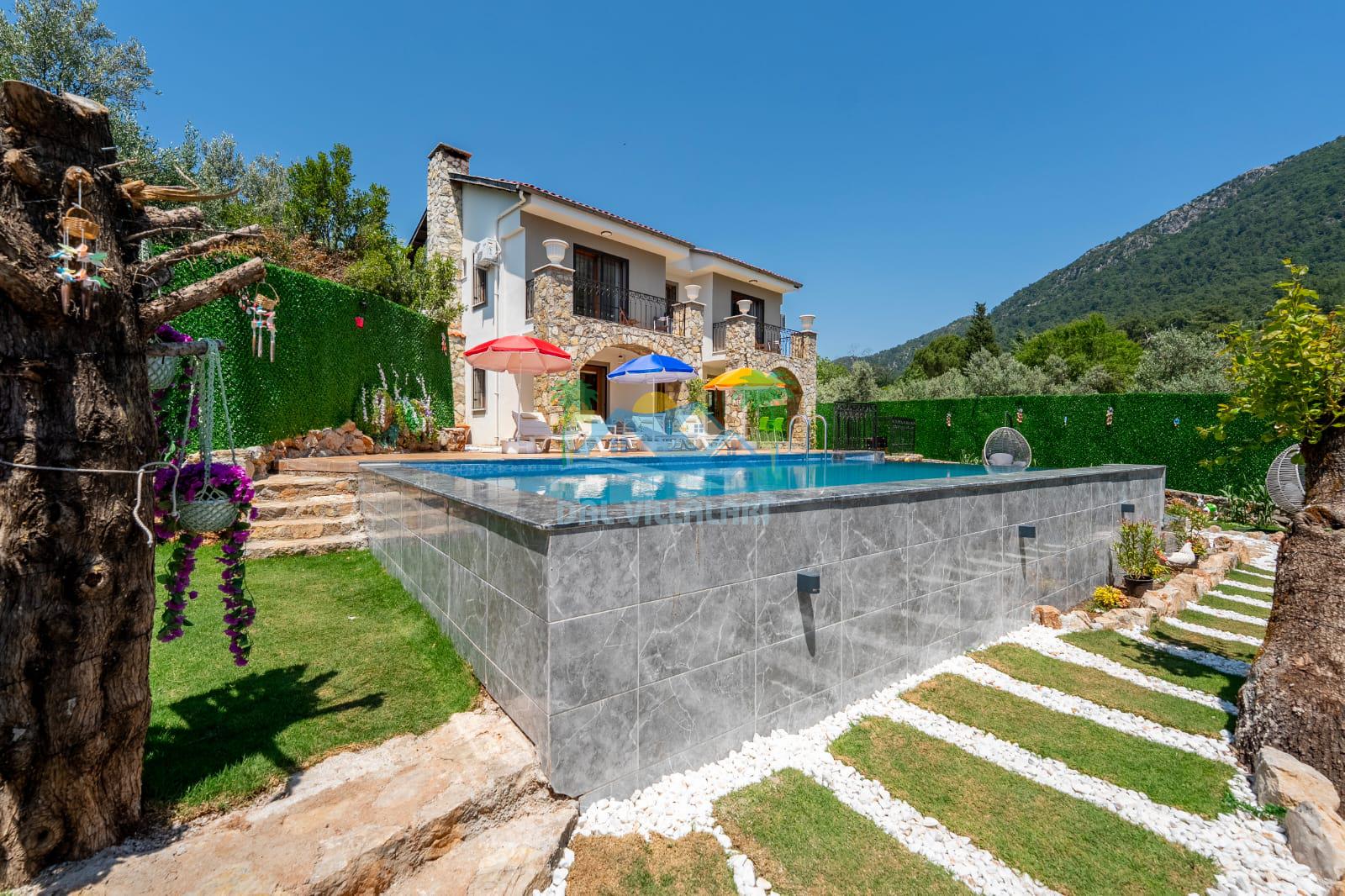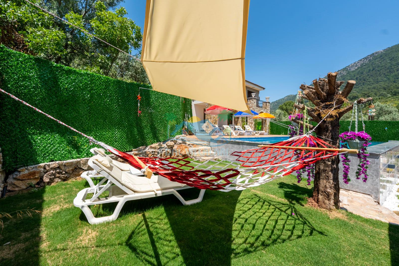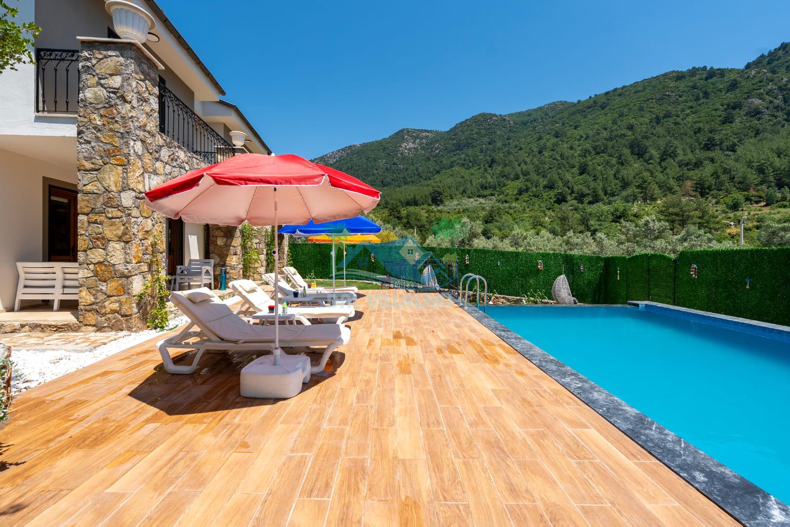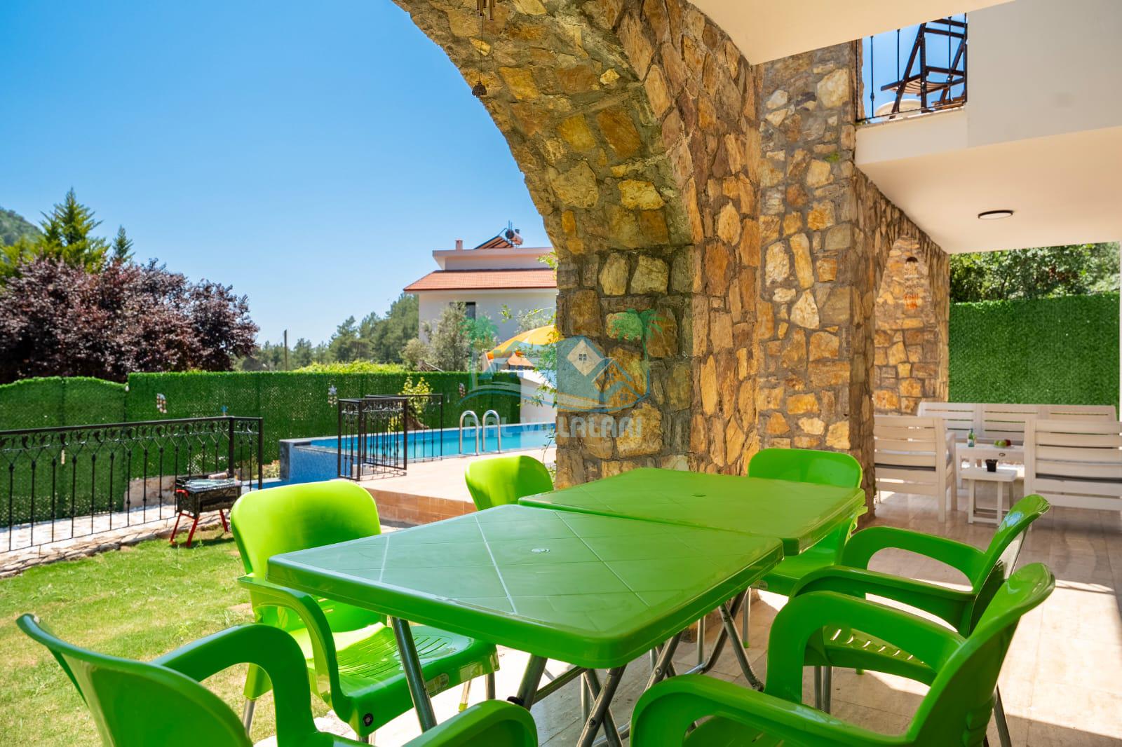 Geniş havuz alanı, konforlu oturma grubu ve özel barbekü alanına sahip olup iç mekanı da oldukça keyifli ve konforlu detaylar barındırmaktadır; oturma odası, donanımlı mutfağı; bir yatak odasında çift kişilik yatak; ikinci yatak odasında çift kişilik yatak;üçüncü yatak odasında ise bir adet iki kişilik ranza bulunan villa doğada güvenle ve huzurla planladığınız Fethiye tatiline ev sahipliği yapacaktır. Konforunuz döz önünde bulundurularak dizayn edilmiş bahçe alanı geniş havuz terasında sahiptir ve havuz bahçe alanında doğanın ve gökyüzünün tadını çıkarabileceğiniz bir havuz alanı bulunmaktadır. Geniş bahçe alanında keyifli zaman geçireceğiniz villa da havuz keyfinize doyamayacağız anlar geçireceksiniz.