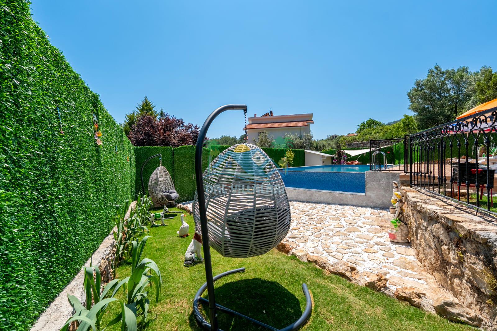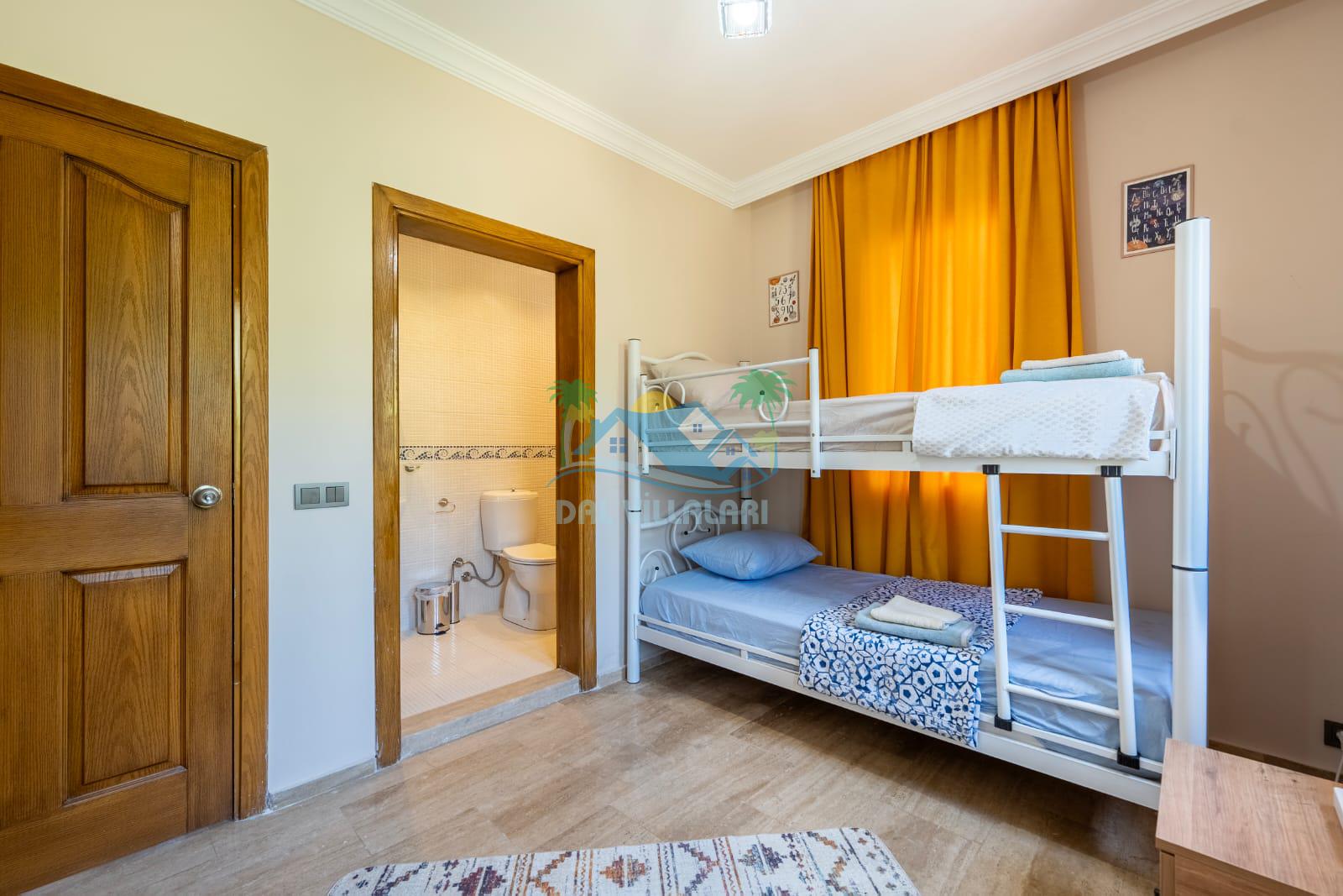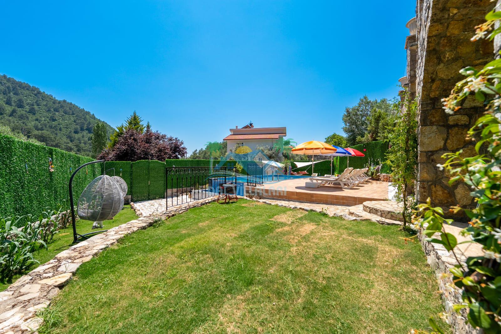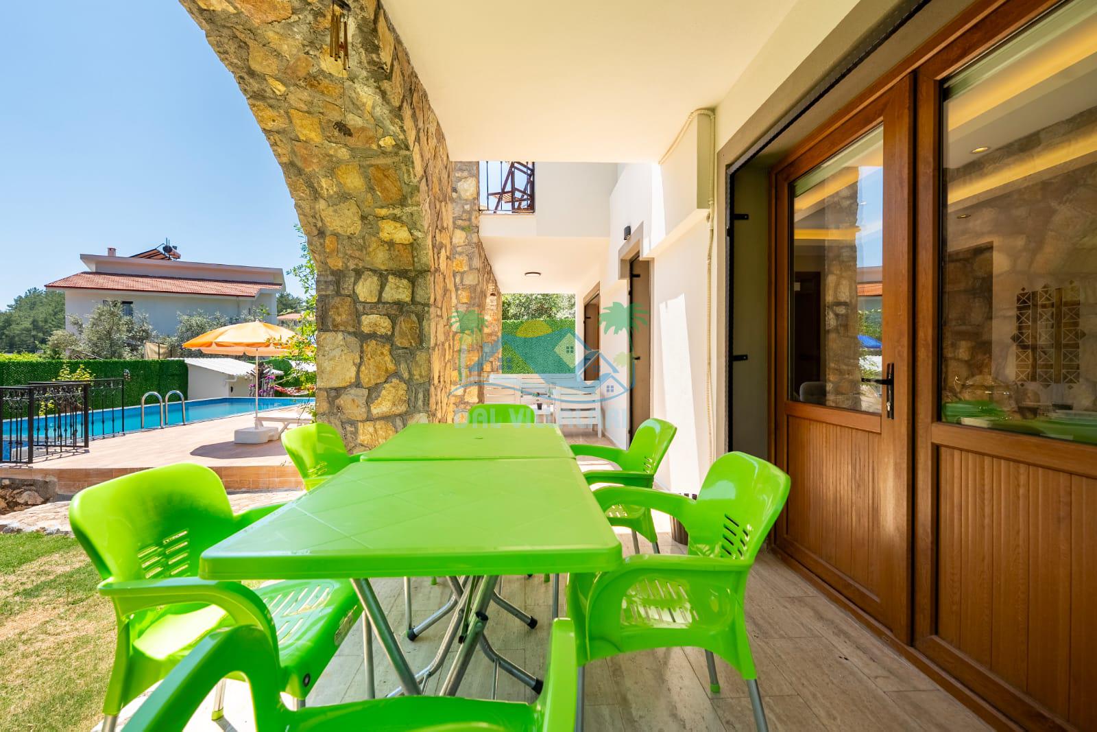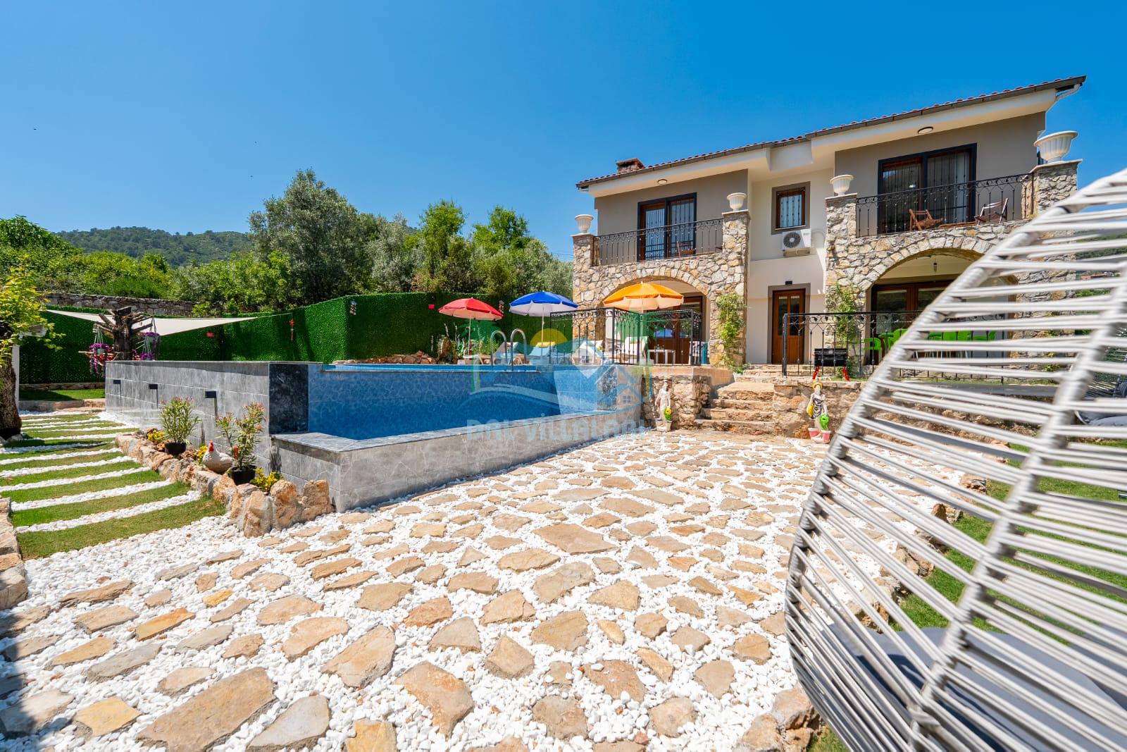 Geniş havuz alanı, konforlu oturma grubu ve özel barbekü alanına sahip olup iç mekanı da oldukça keyifli ve konforlu detaylar barındırmaktadır; oturma odası, donanımlı mutfağı; bir yatak odasında çift kişilik yatak; ikinci yatak odasında çift kişilik yatak;üçüncü yatak odasında ise bir adet iki kişilik ranza bulunan villa doğada güvenle ve huzurla planladığınız Fethiye tatiline ev sahipliği yapacaktır. Konforunuz döz önünde bulundurularak dizayn edilmiş bahçe alanı geniş havuz terasında sahiptir ve havuz bahçe alanında doğanın ve gökyüzünün tadını çıkarabileceğiniz bir havuz alanı bulunmaktadır. Geniş bahçe alanında keyifli zaman geçireceğiniz villa da havuz keyfinize doyamayacağız anlar geçireceksiniz.