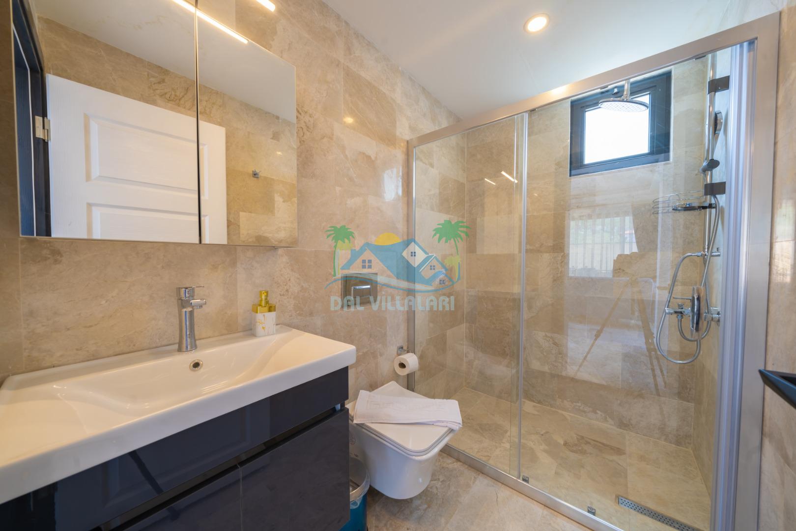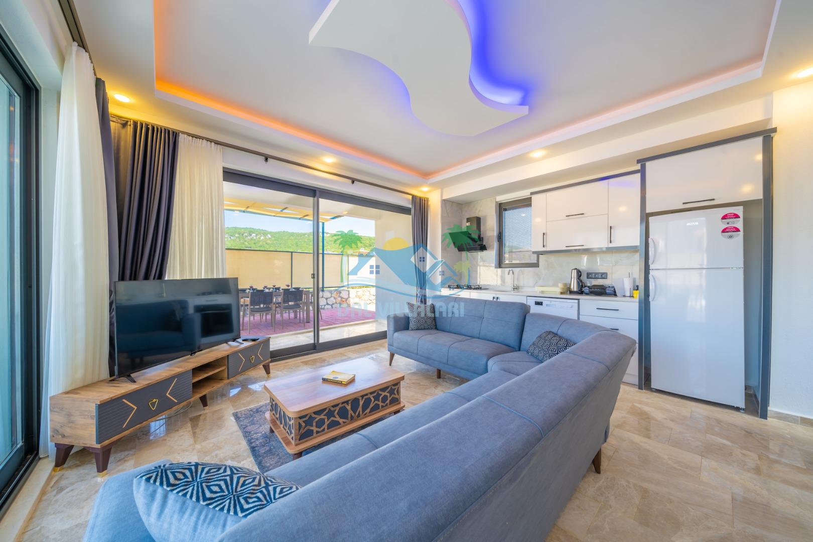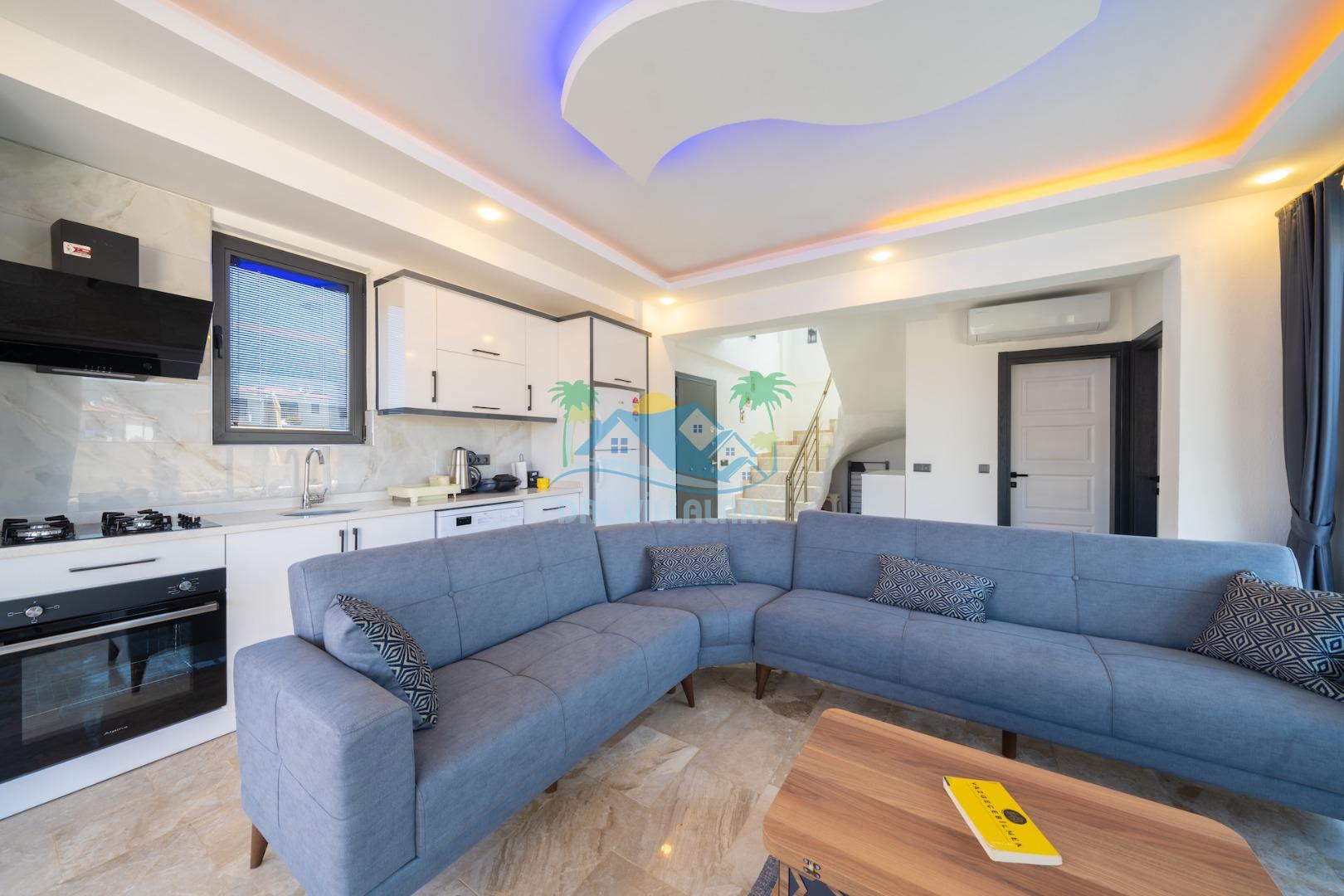 Villanın geniş ve ferah salonu, şık mobilyaları ve rahat oturma düzenlemeleriyle dikkat çekilirken, tam donanımlı mutfağı, yemek pişirme süreci hem kolay hem de keyifli hale gelir. Mutfakta bulunan modern aletler ve geniş tezgah alanları, her türlü yemek hazırlığı için idealdir.