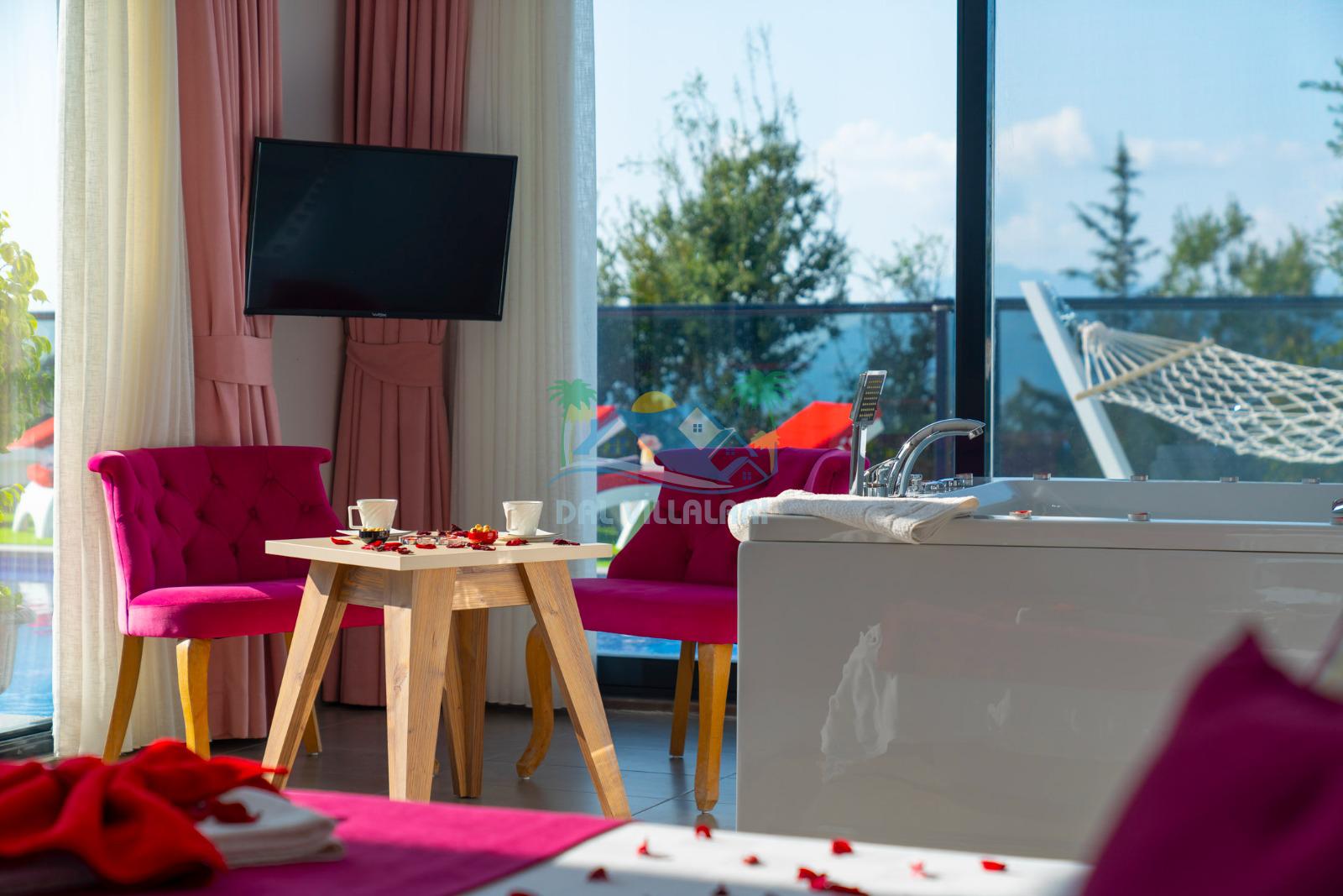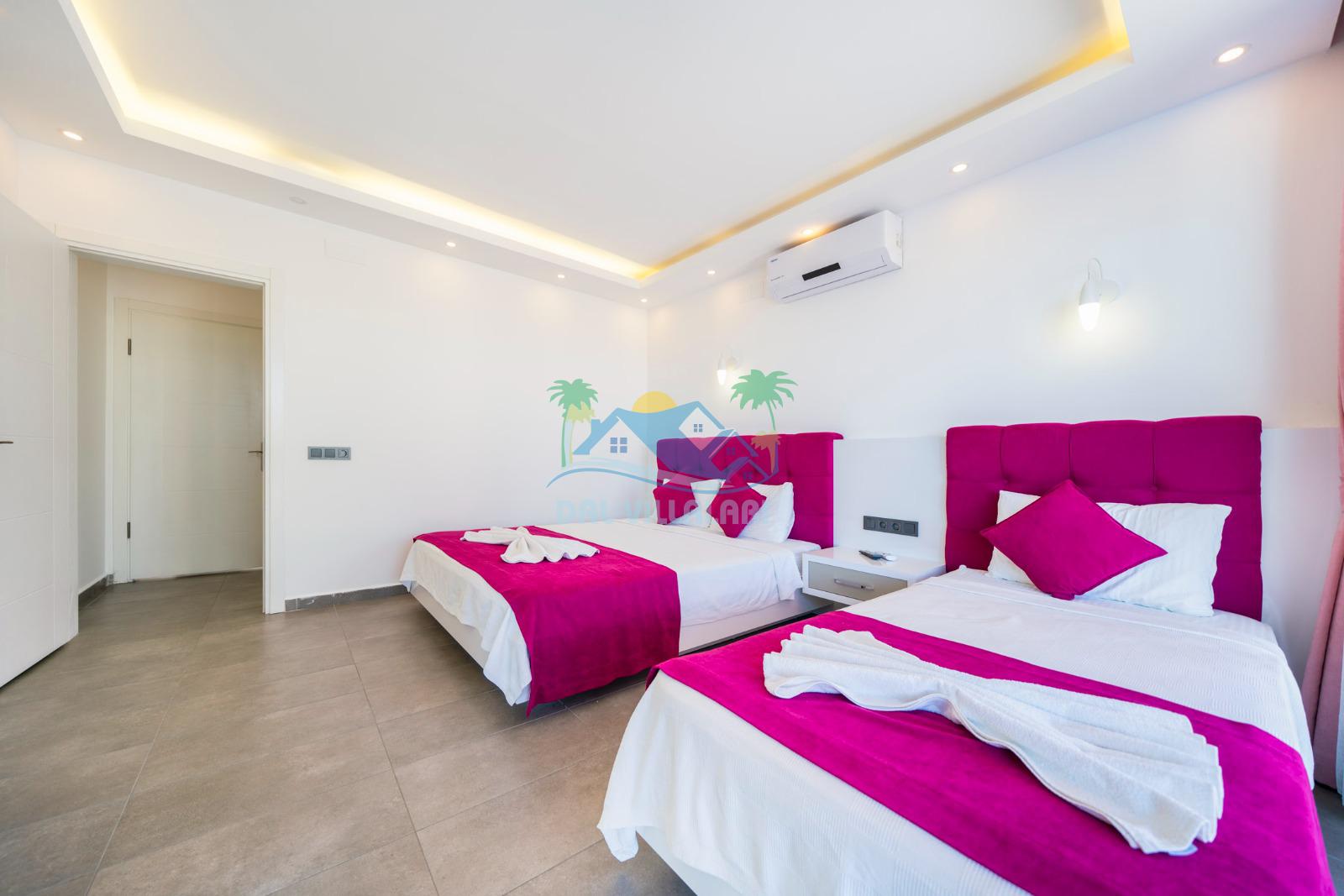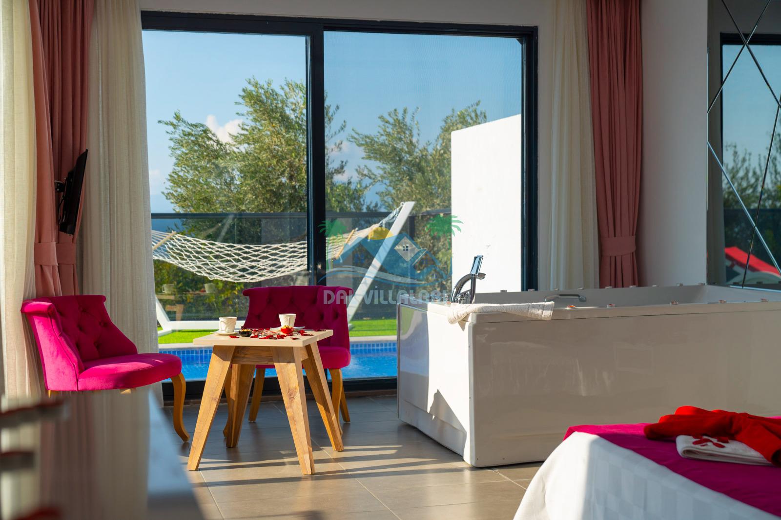 İhtiyaçlarınıza karşılık verecek konforlu oturma odası, tam donanımlı açık mutfağı bulunan villanın, birinci yatak odasında çift kişilik yatak,ebeveyn banyosu ve jakuzi; ikinci yatak odasında da çift kişilik yatak, tek kişilik yatak ve ebeveyn banyosu bulunmaktadır.