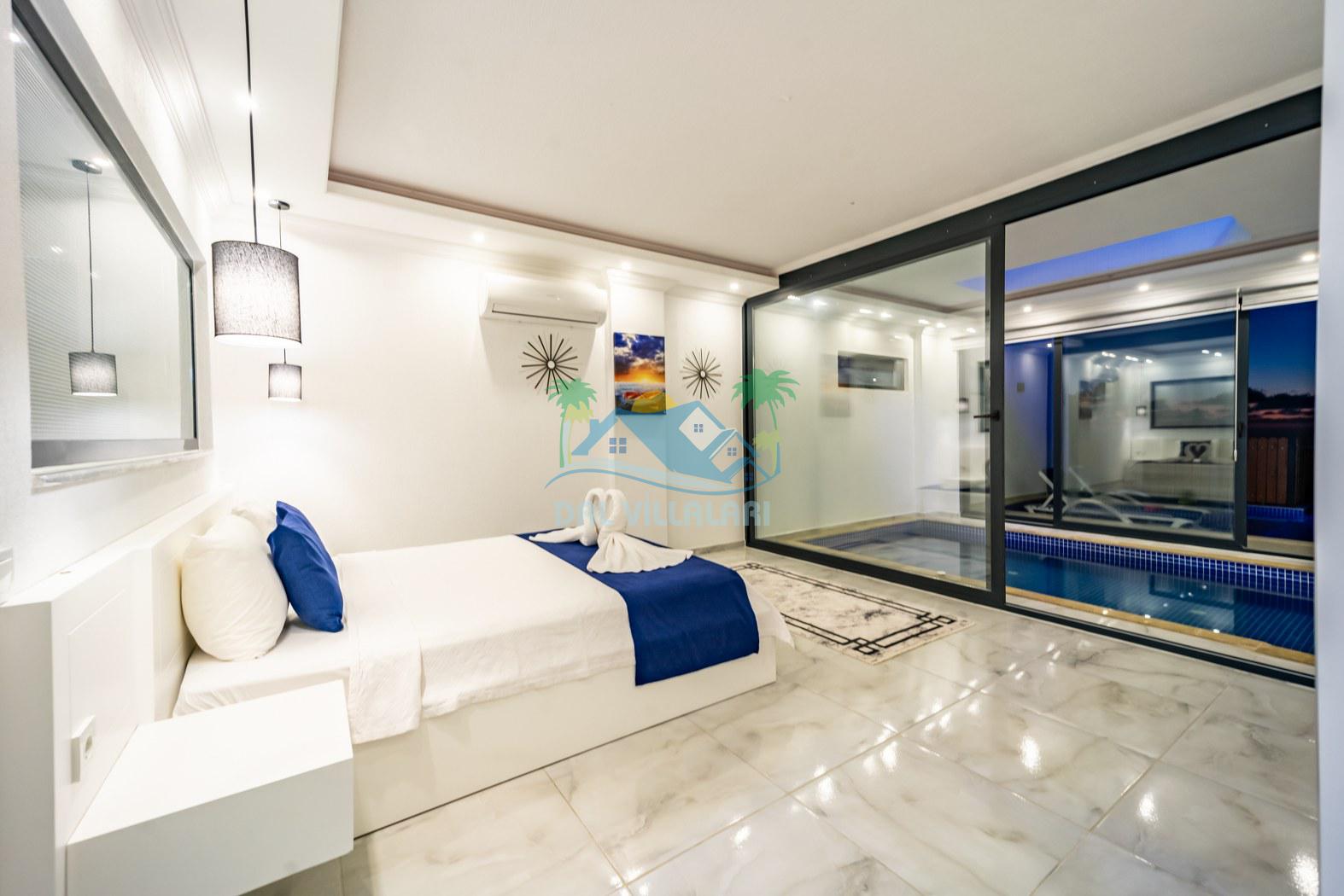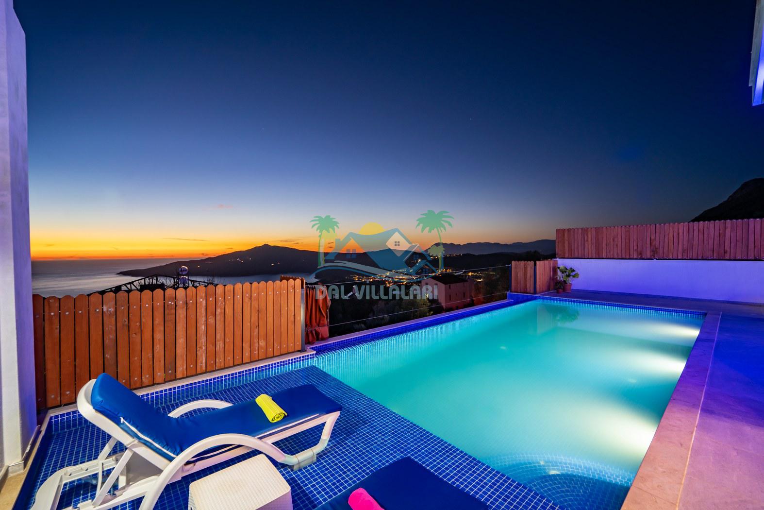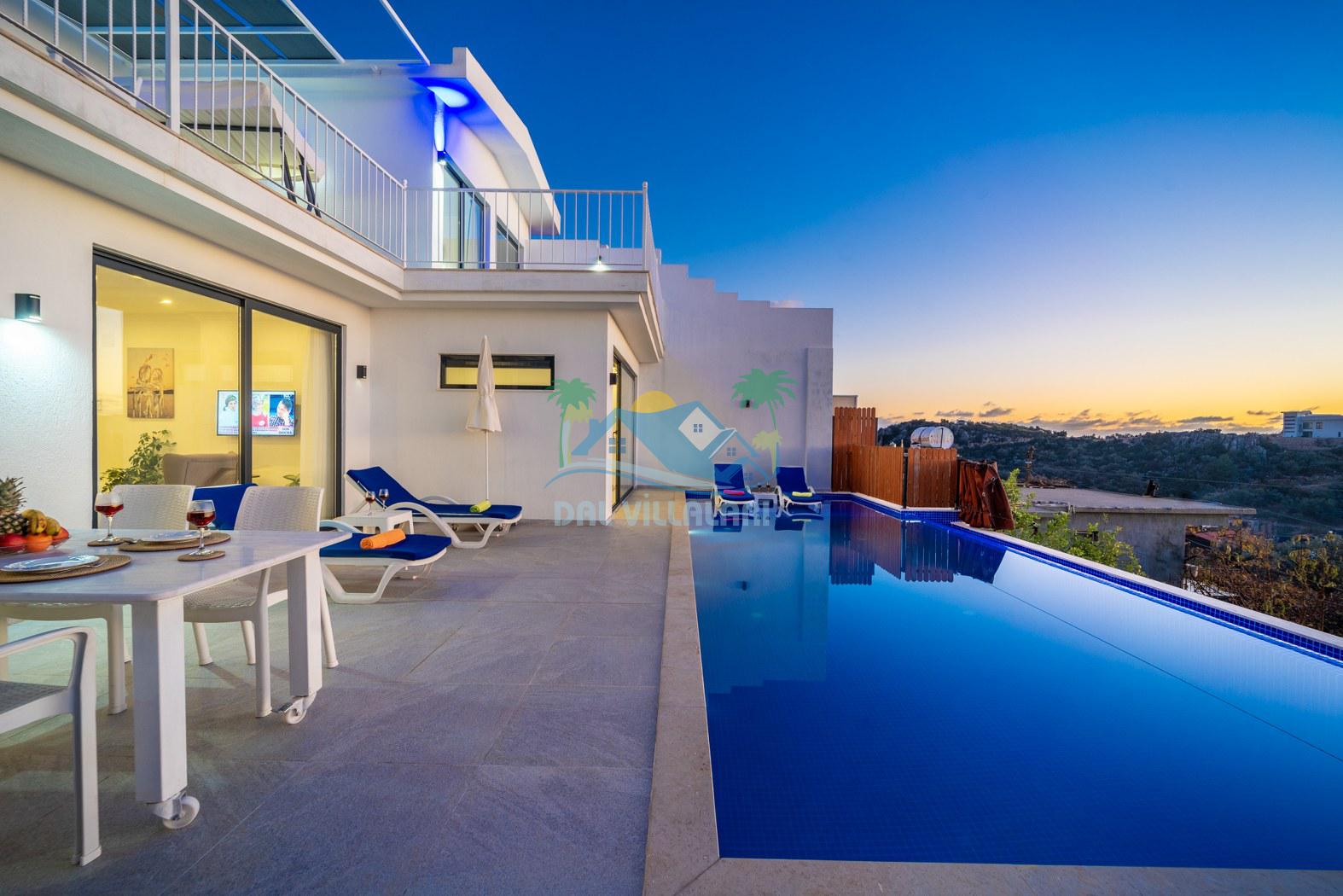Kalkan Kördere mevkiinde konumlanmakta olan Villa Fantastik, deniz ve doğa manzarasına sahip kiralık villalarımız arasında yer almaktadır. Modern ve konforlu bir şekilde dekore edilen yazlık villamızda 2 adet yatak odası bulunmakta olup, 4 kişiye konaklama imkanı sağlamaktadır. Yatak odalarından bir tanesinin içerisinde tüm yılın vermiş olduğu yorgunluğu giderebileceğiniz jakuzi bulunmaktadır. Aynı zamanda kış aylarında da tatil planı yapan misafirlerimiz için kiralık villamızda jakuzili kapalı ısıtma havuzu yer almaktadır. Villamızın dış özel yüzme havuzuna entegre sığ havuz mevcuttur. Havuz ve havuz terası korunaklı hale getirilen kiralık villamızı muhafazakar aileler ve balayı çiftleri rahatlıkla tercih edebililer. Sessizlik ve sakinlik çerisinde hayallerinizin de ötesinde keyif dolu bir yazlık villada tatil için Villa Fantastik' i tercih edebilirsiniz.