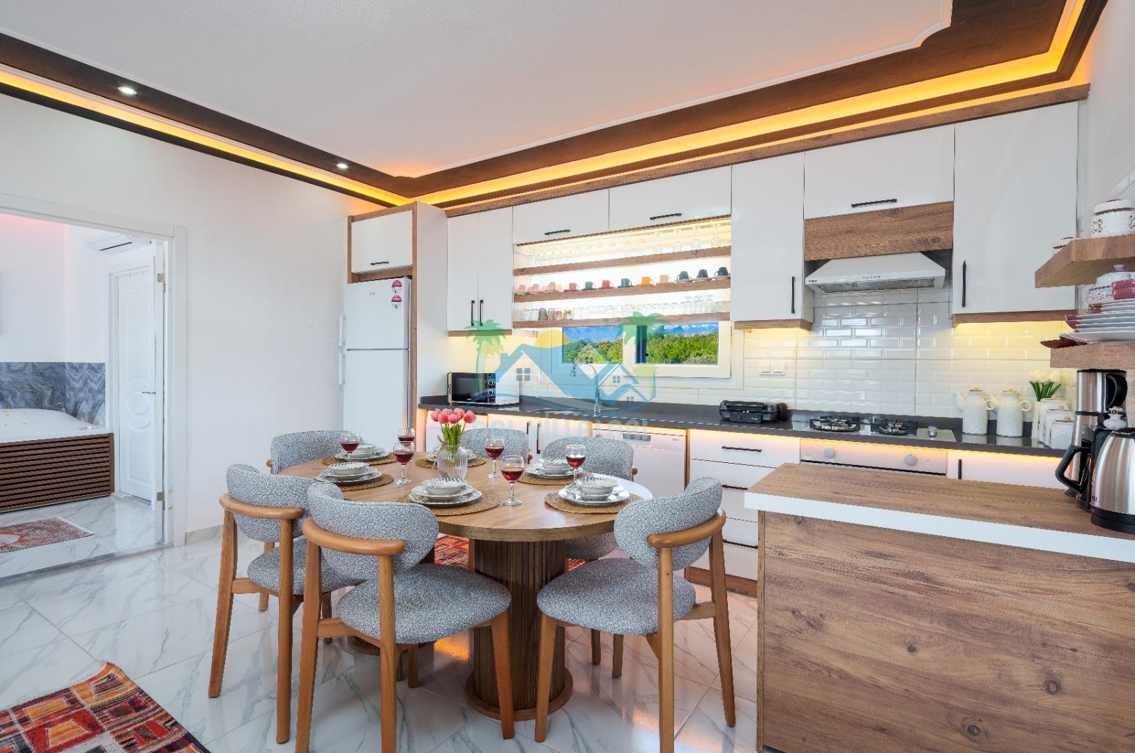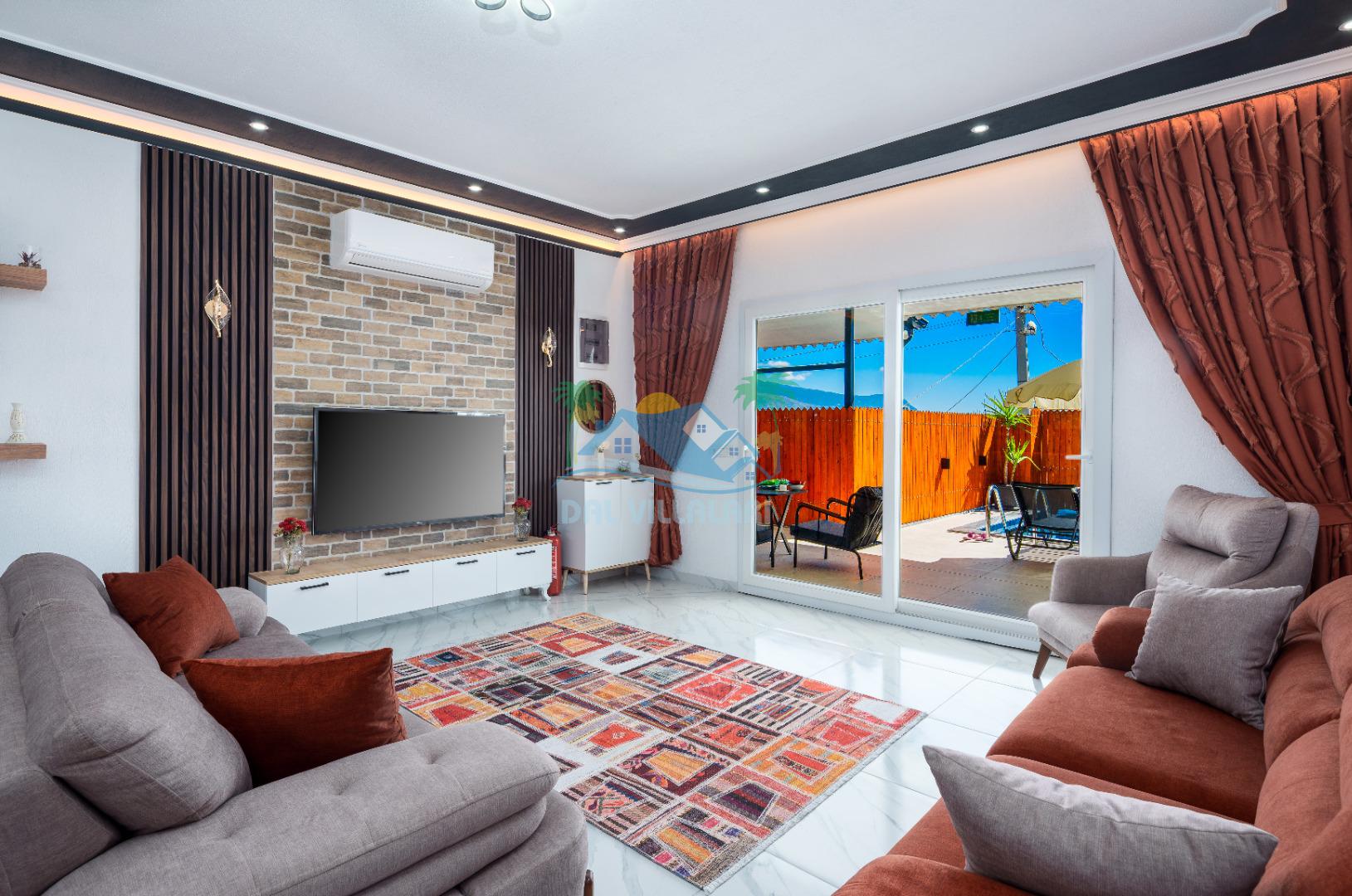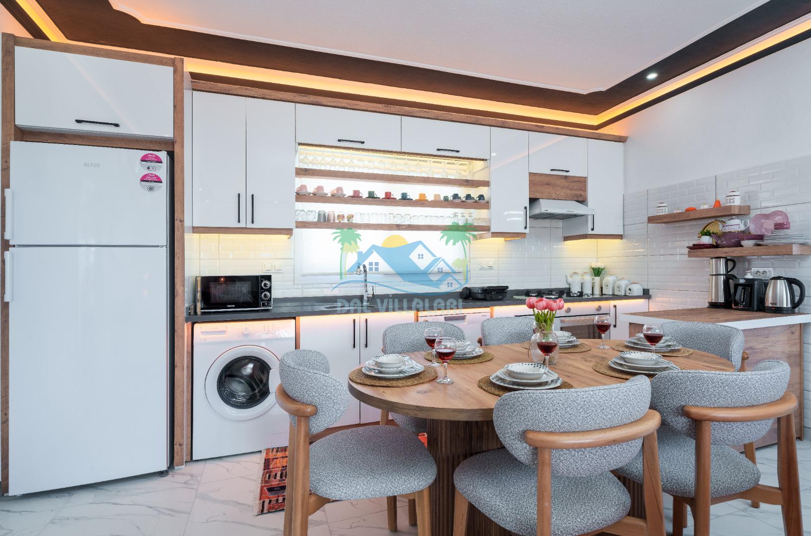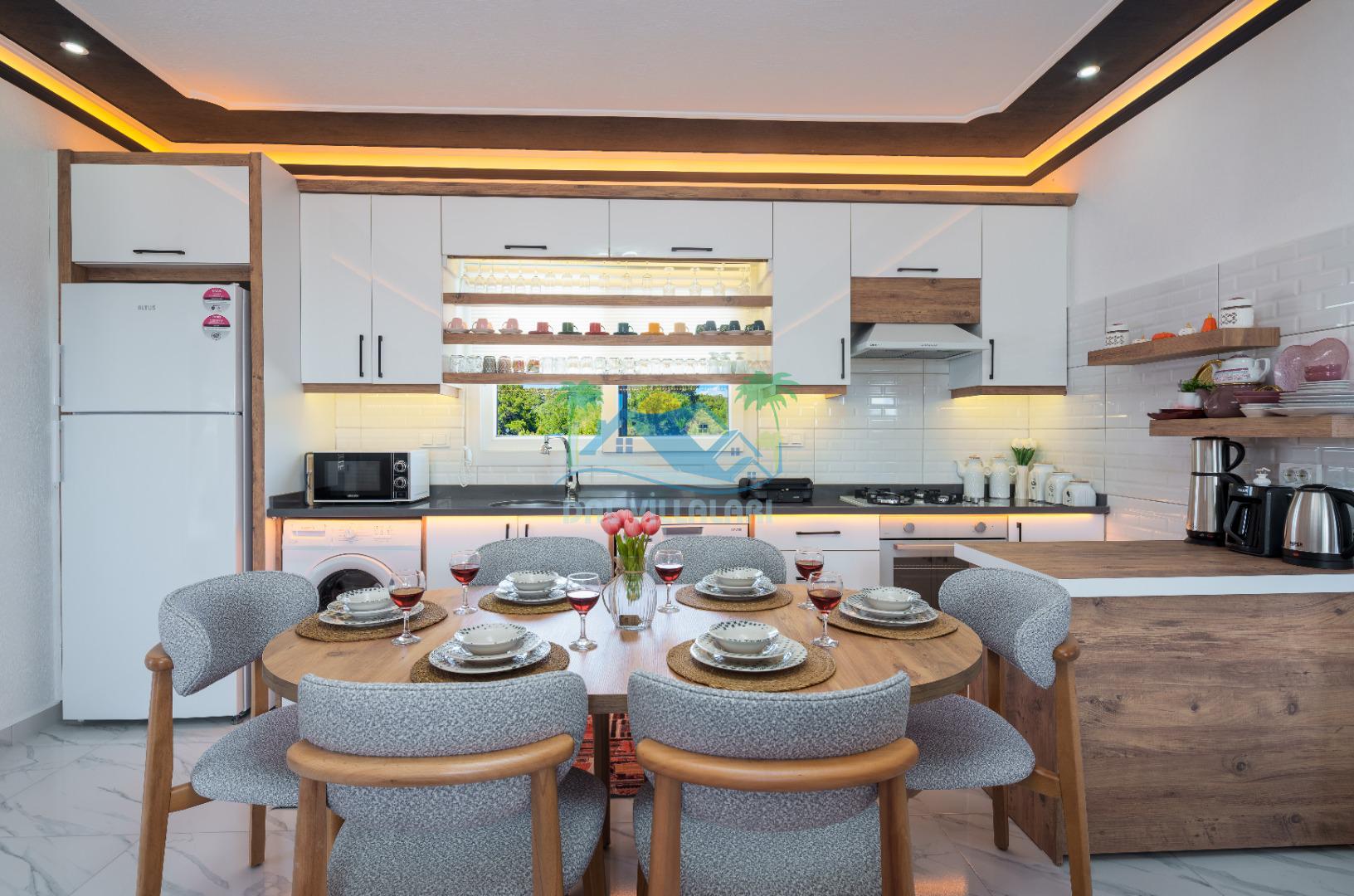 Modern detaylarla dizayn edilen villa iç mekânı, konforlu bir tatil için ihtiyaç duyulan tüm donanımlara sahiptir. Geniş salon, kullanışlı mutfak ve rahat yatak odaları sayesinde misafirlerimiz ev konforunda bir konaklama deneyimi yaşayabilirler.