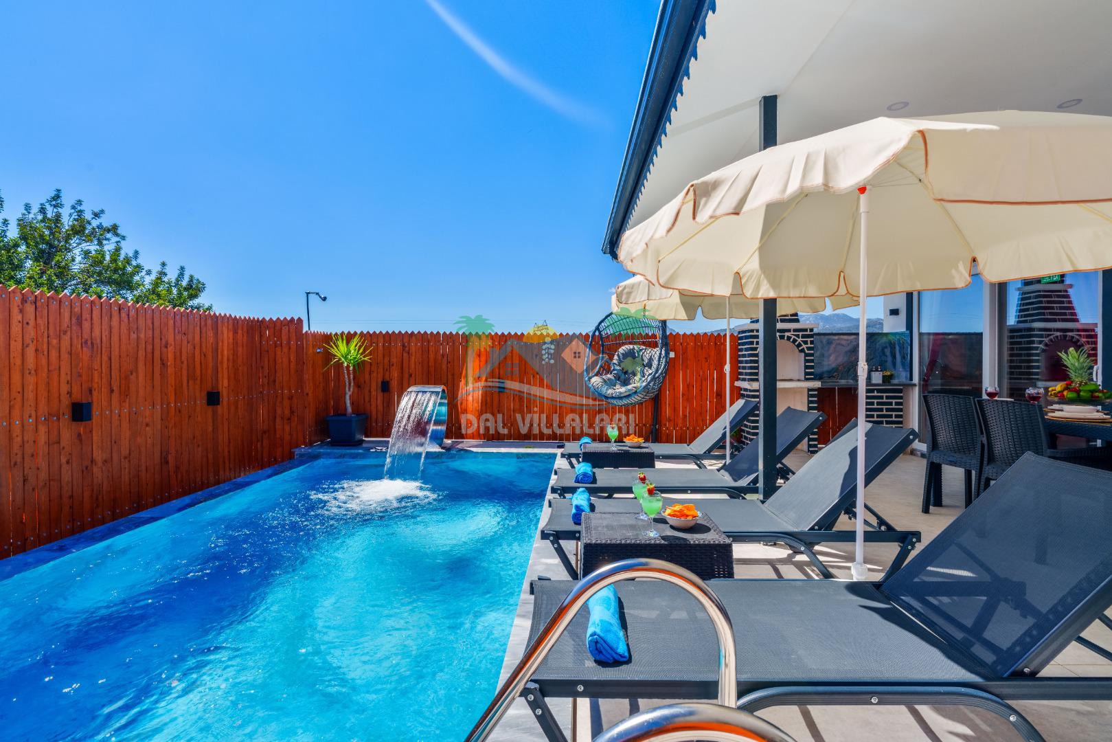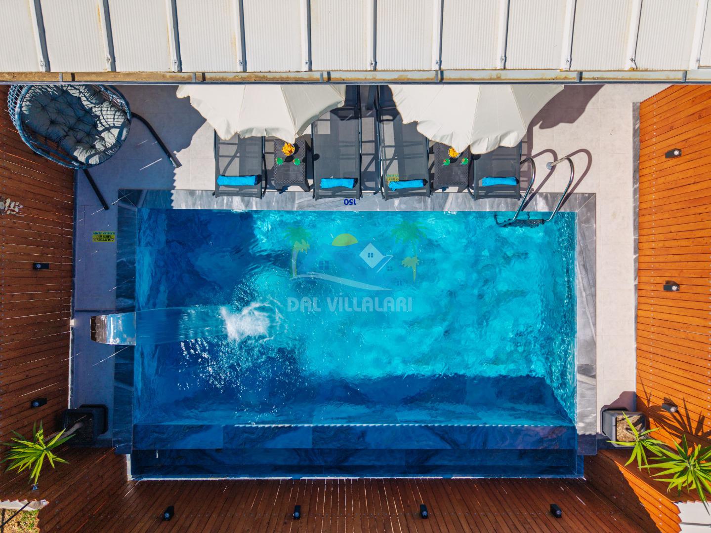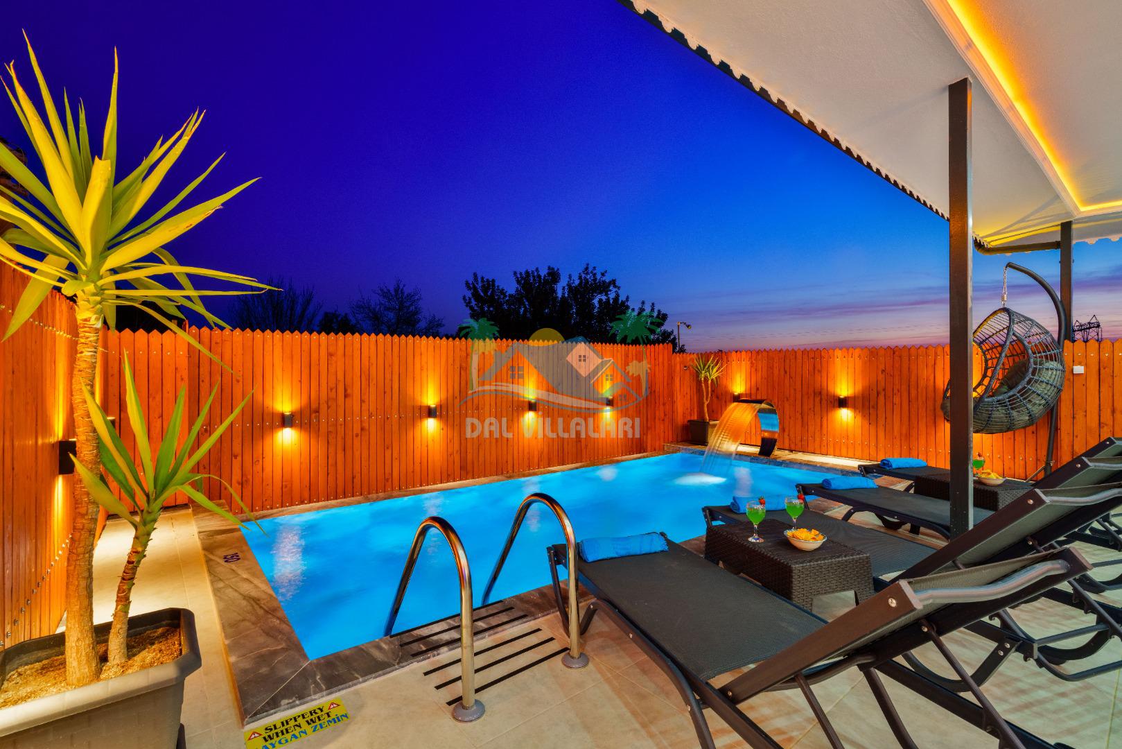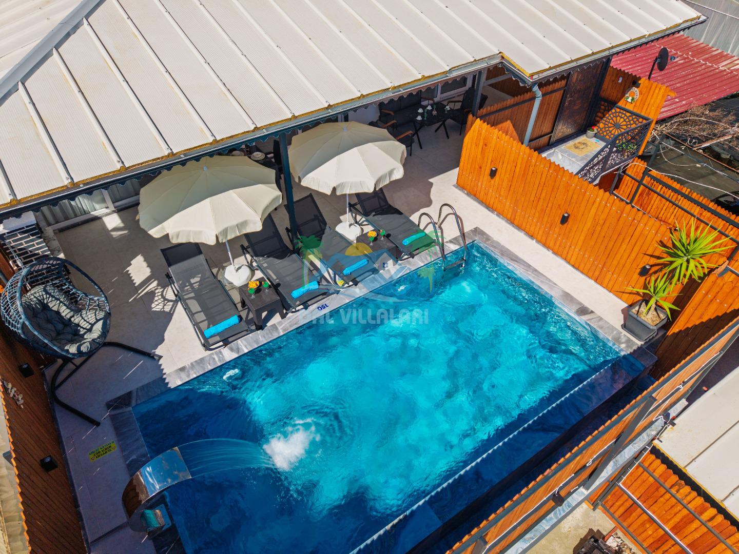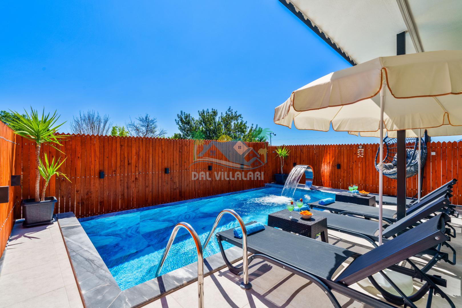 Villamızın en önemli özelliklerinden biri tam korunaklı özel yüzme havuzuna sahip olmasıdır. Dışarıdan görünmeyen havuz alanı sayesinde misafirlerimiz gün boyunca rahat ve özgür bir şekilde tatilin keyfini çıkarabilirler.