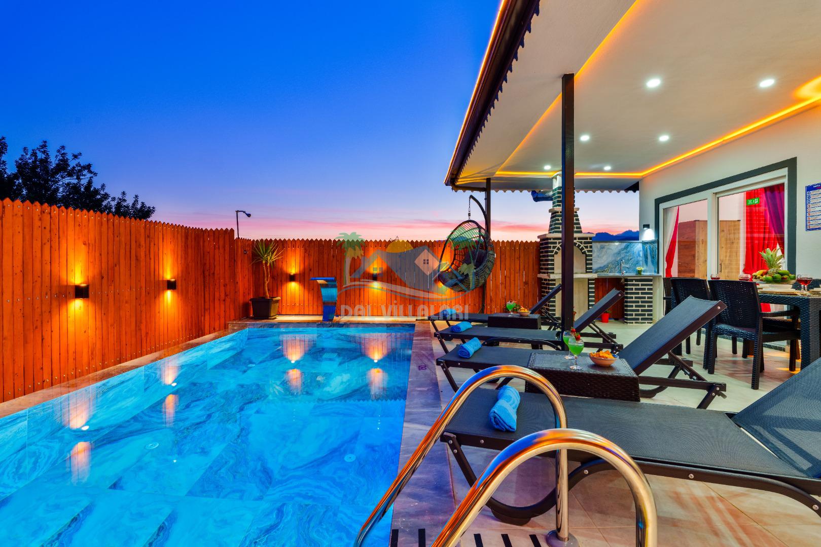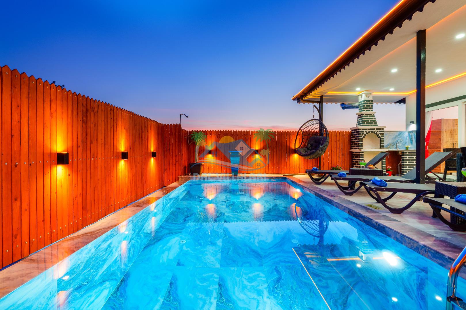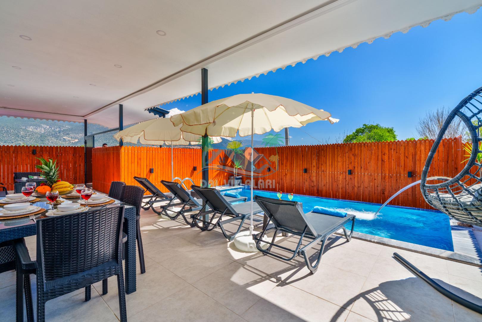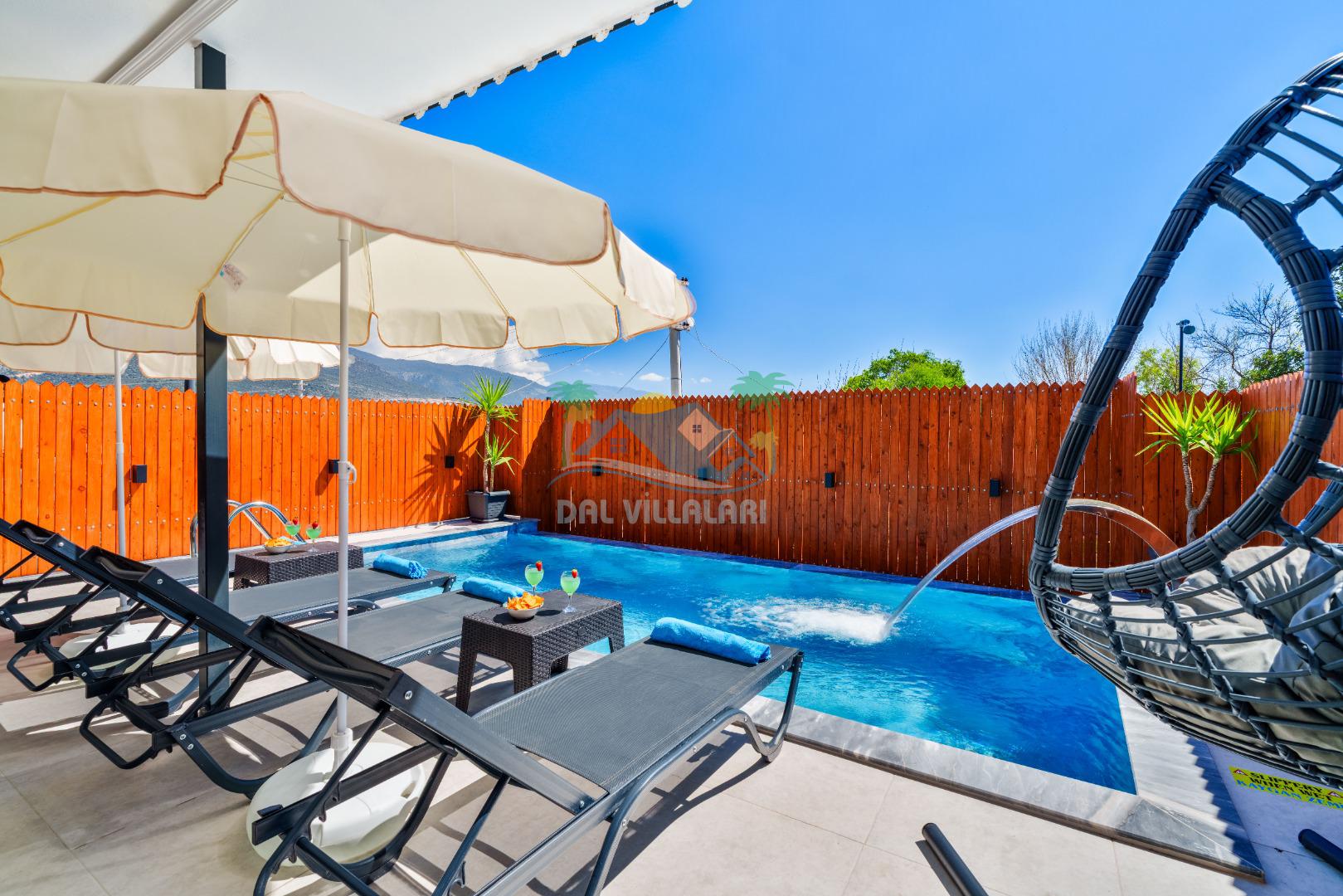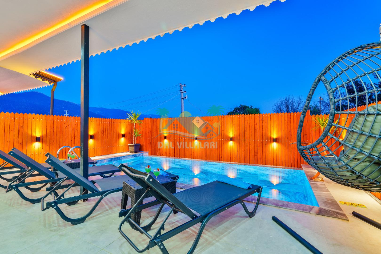 Villamızın en önemli özelliklerinden biri tam korunaklı özel yüzme havuzuna sahip olmasıdır. Dışarıdan görünmeyen havuz alanı sayesinde misafirlerimiz gün boyunca rahat ve özgür bir şekilde tatilin keyfini çıkarabilirler.