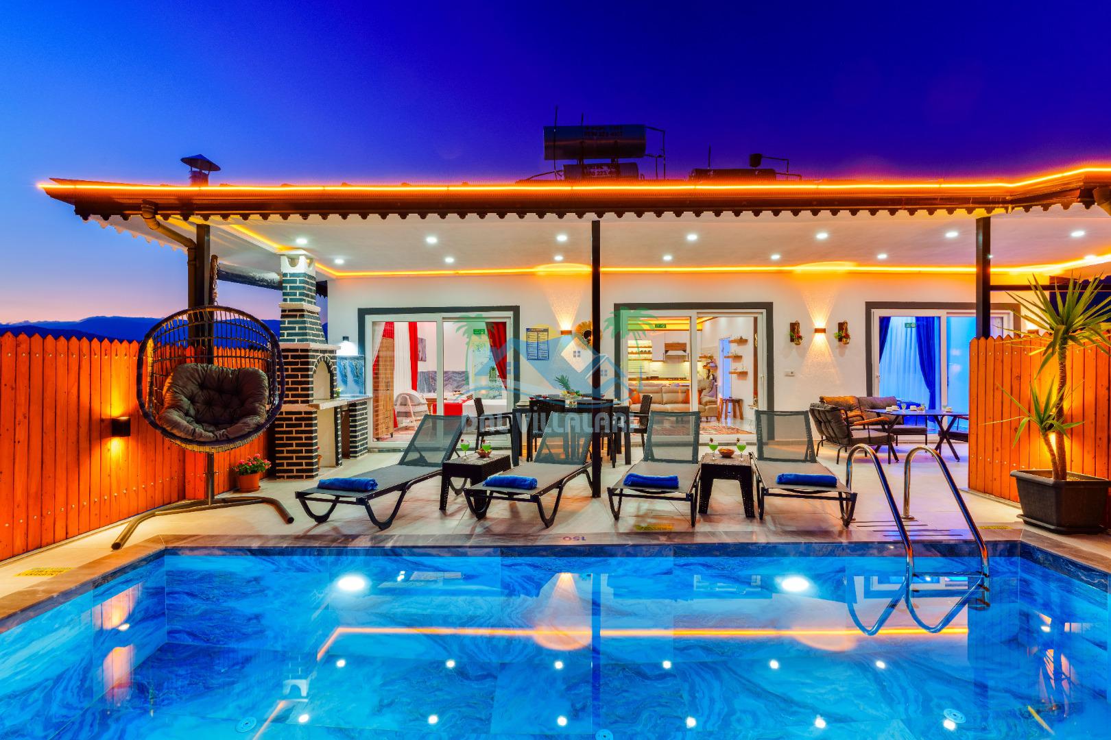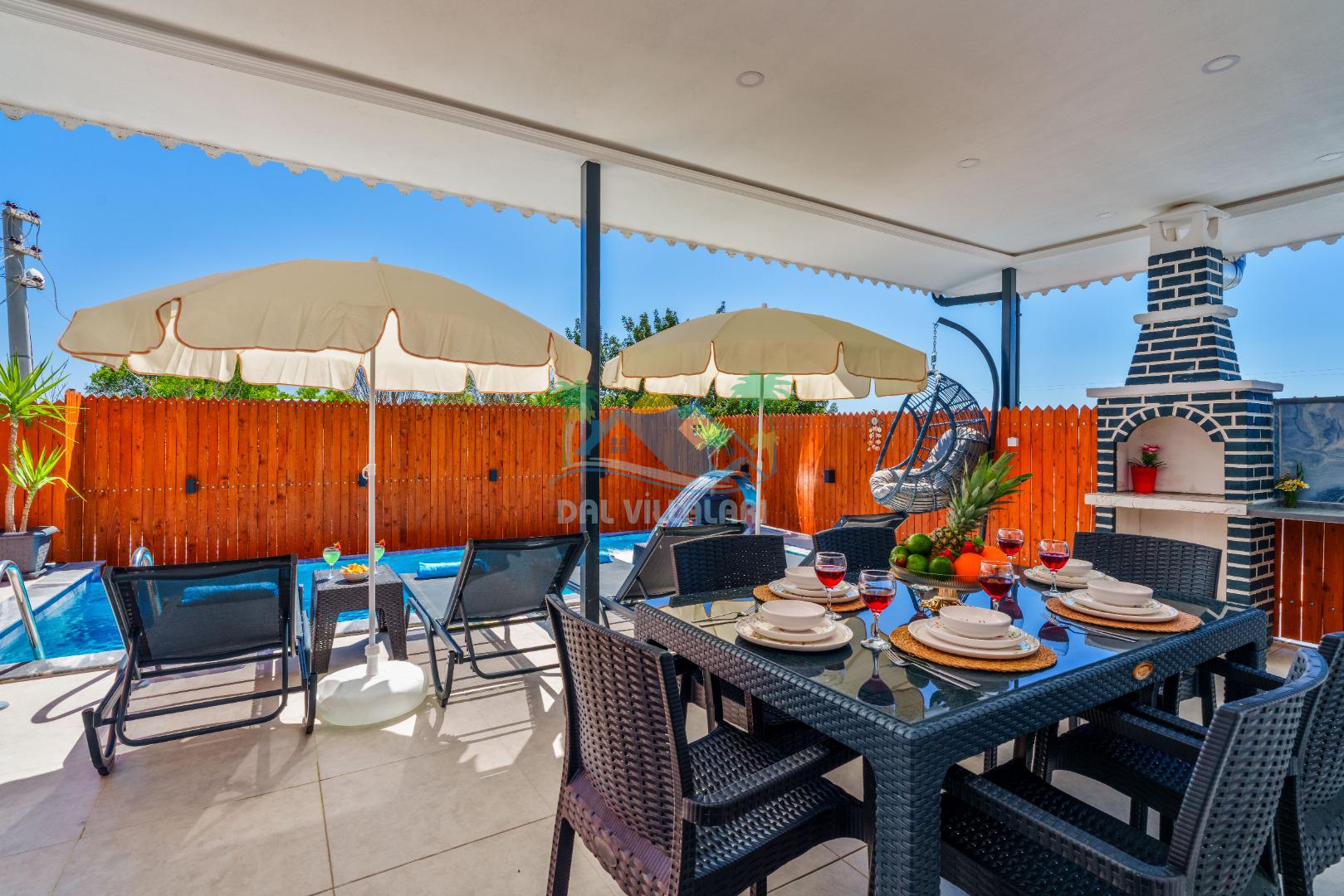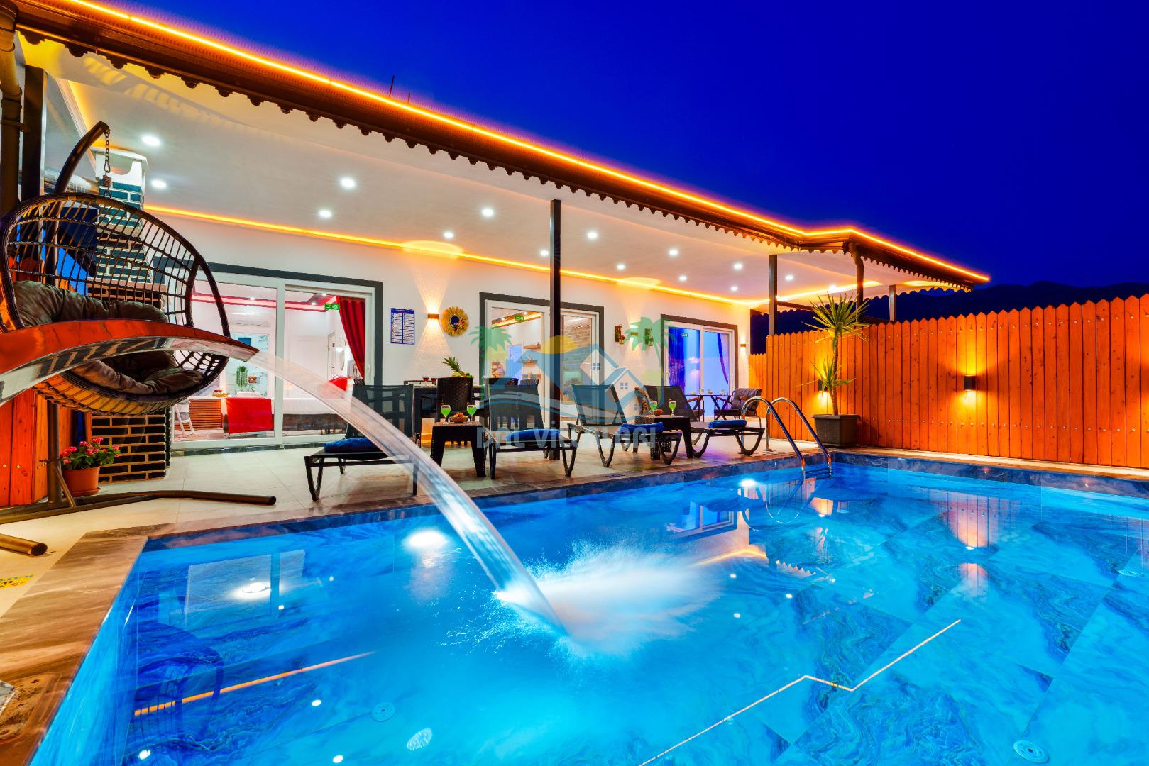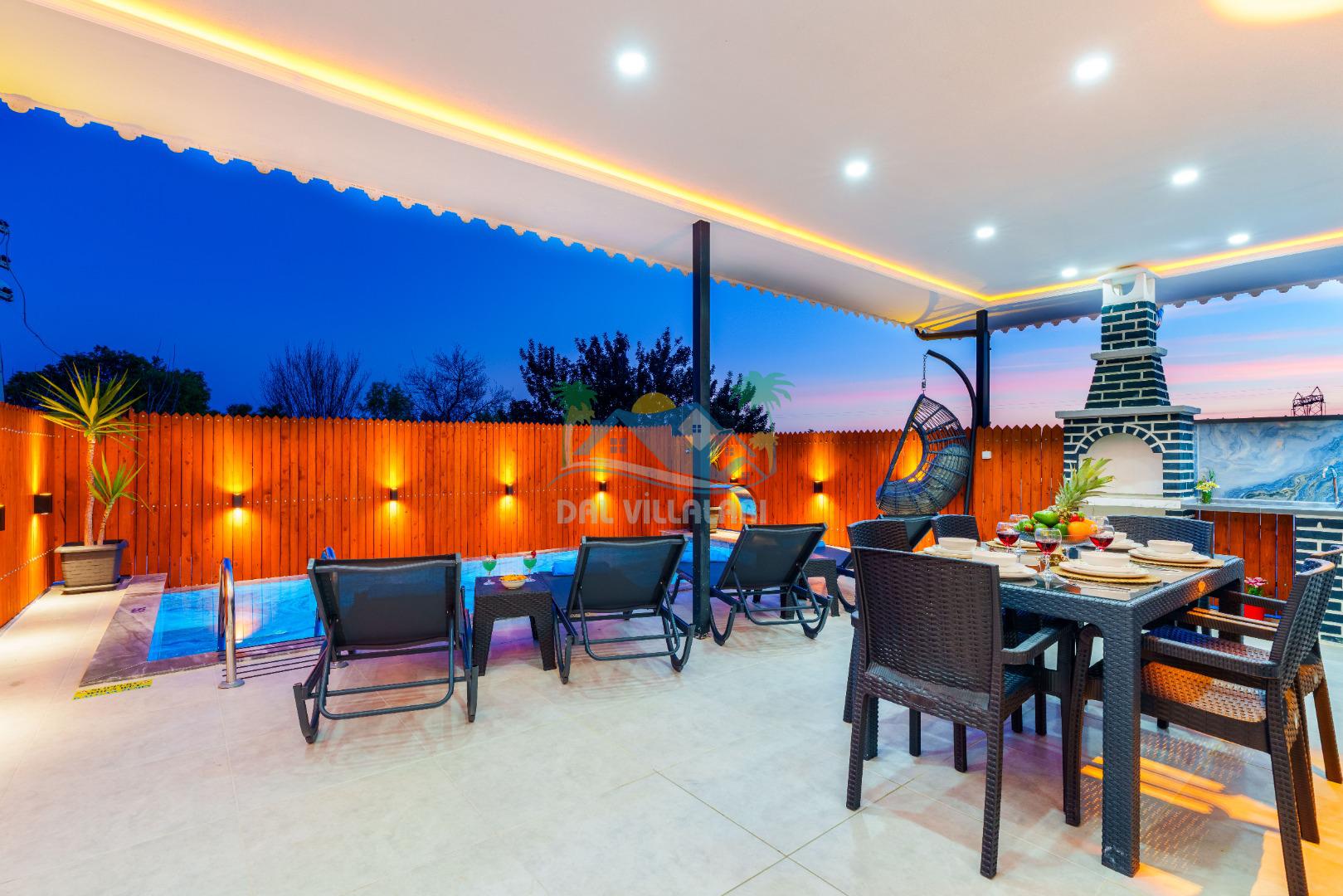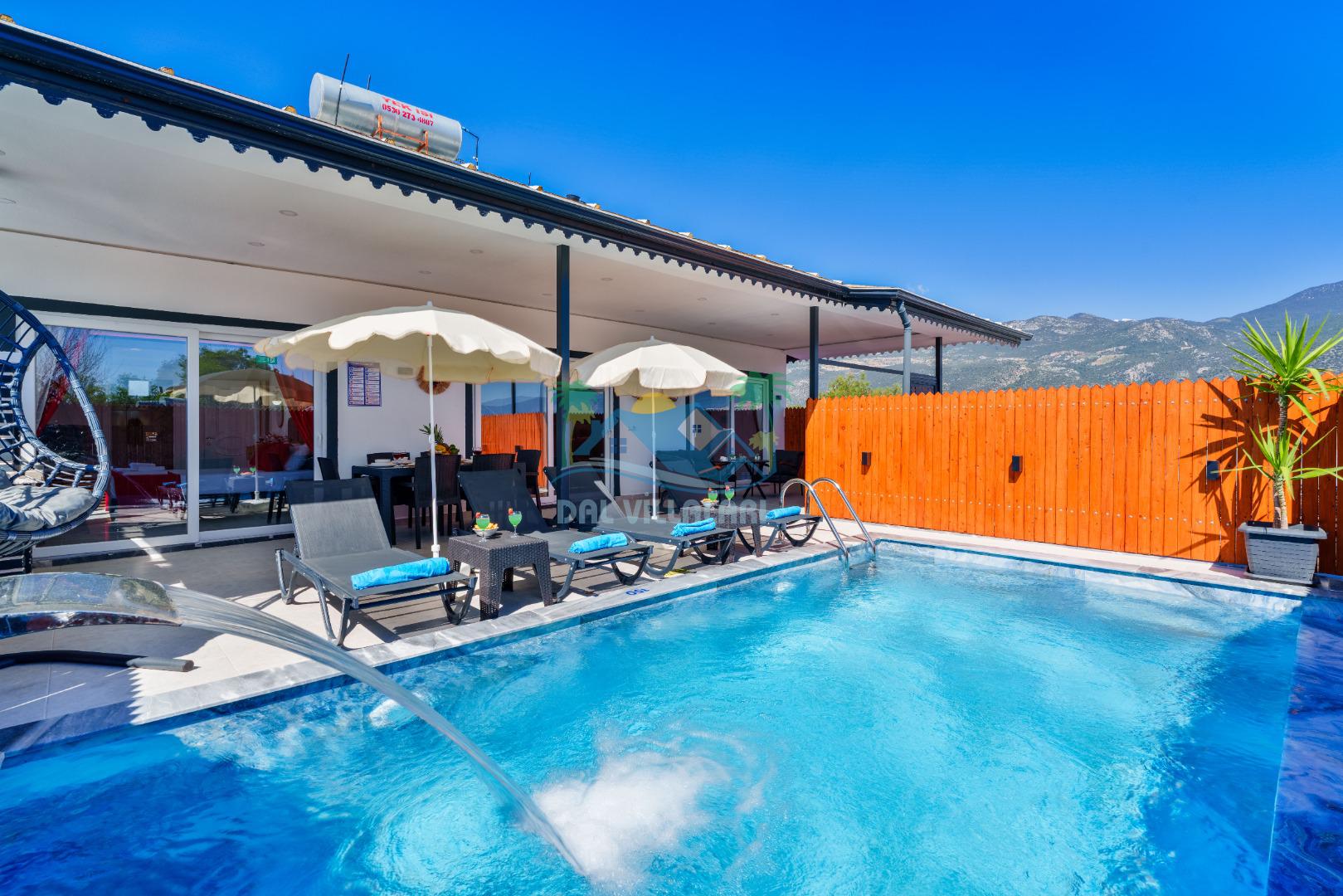 Villamızın en önemli özelliklerinden biri tam korunaklı özel yüzme havuzuna sahip olmasıdır. Dışarıdan görünmeyen havuz alanı sayesinde misafirlerimiz gün boyunca rahat ve özgür bir şekilde tatilin keyfini çıkarabilirler.