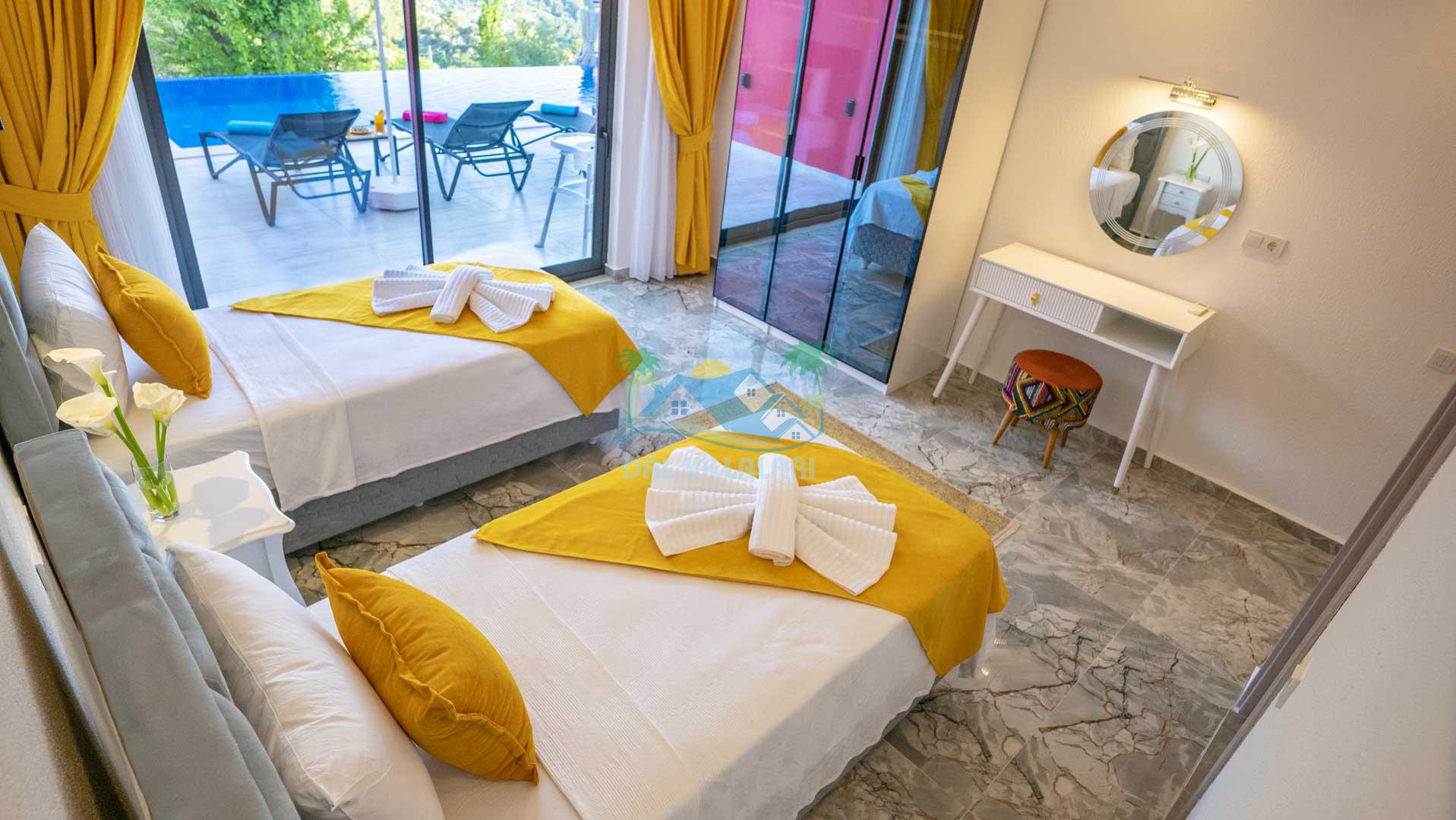 Villa Gökmen, Kalkan İslamlar Köyü'nde yer almakta olup, 2 yatak odası ve 4 kişi konaklama kapasitesine sahip lüks bir tatil villasıdır.