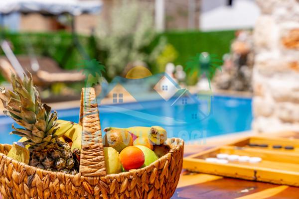 Bahçede özel bir yüzme havuzu, şezlonglar, bahçe mobilyaları ve barbekü bulunmaktadır.