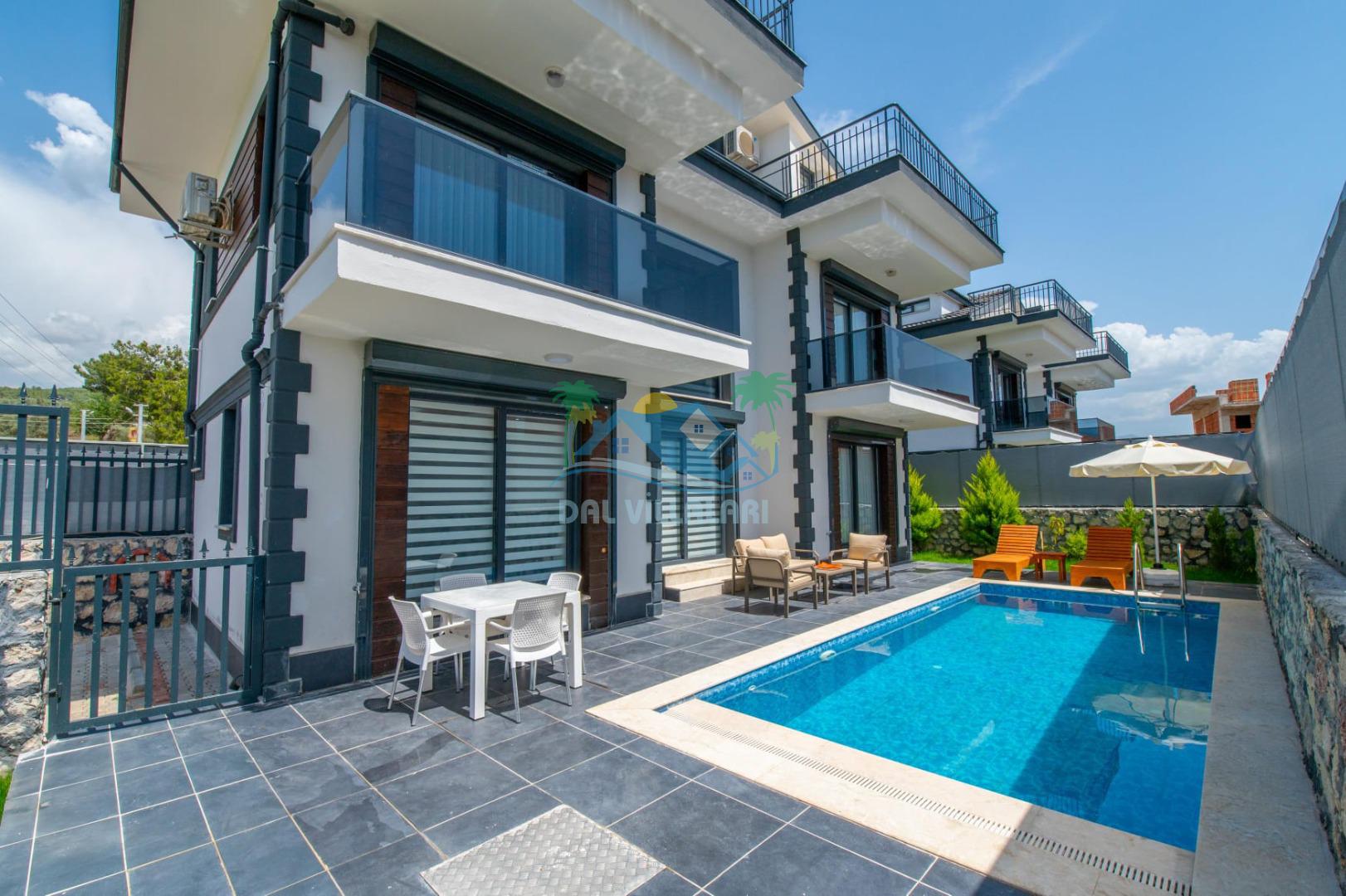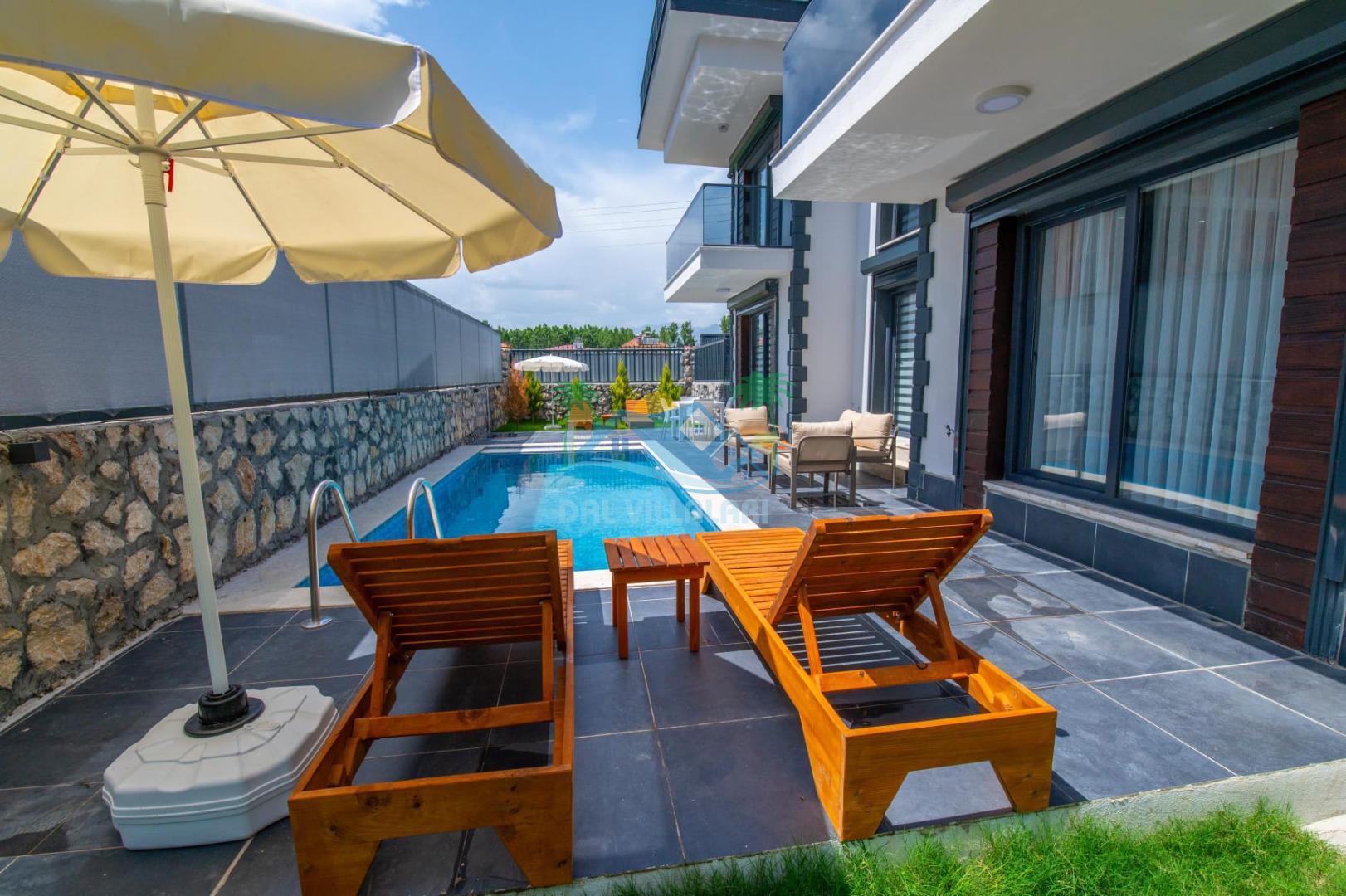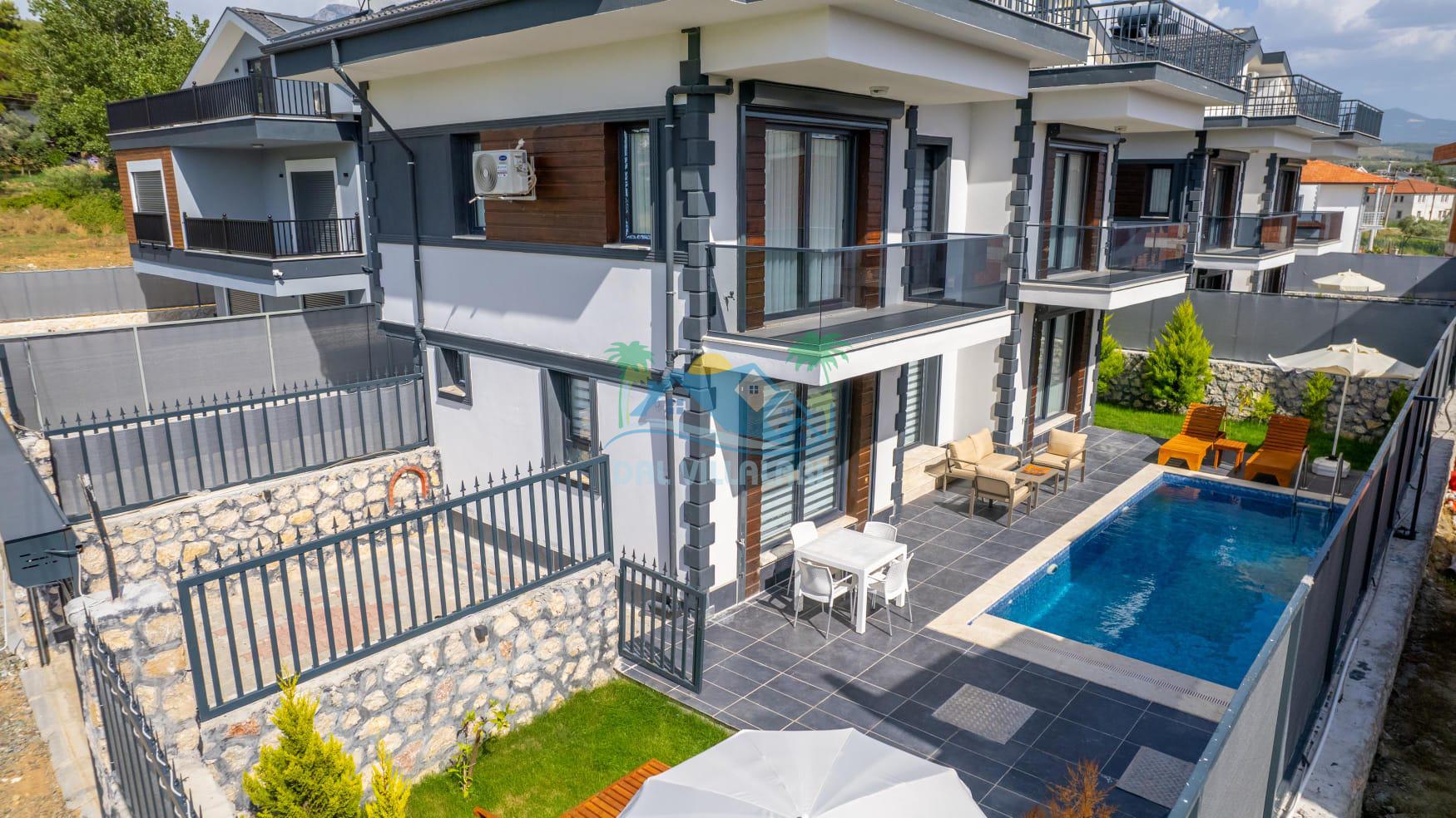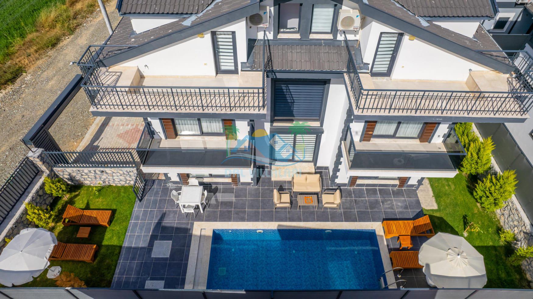 Villanın dış alanında ise geniş bir yüzme havuzu, güneşlenme terası, şezlonglar ve oturma grubu yer alır. Yeşillikler içinde yer alan bahçesi, çocuklu aileler için güvenli ve keyifli bir oyun alanı sunarken, doğayla iç içe kahvaltı ya da akşam yemekleri için de huzurlu bir ortam yaratır.