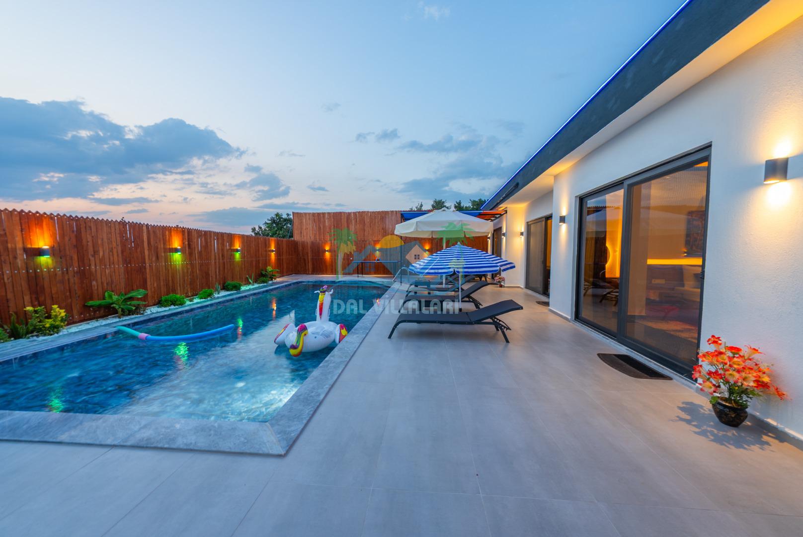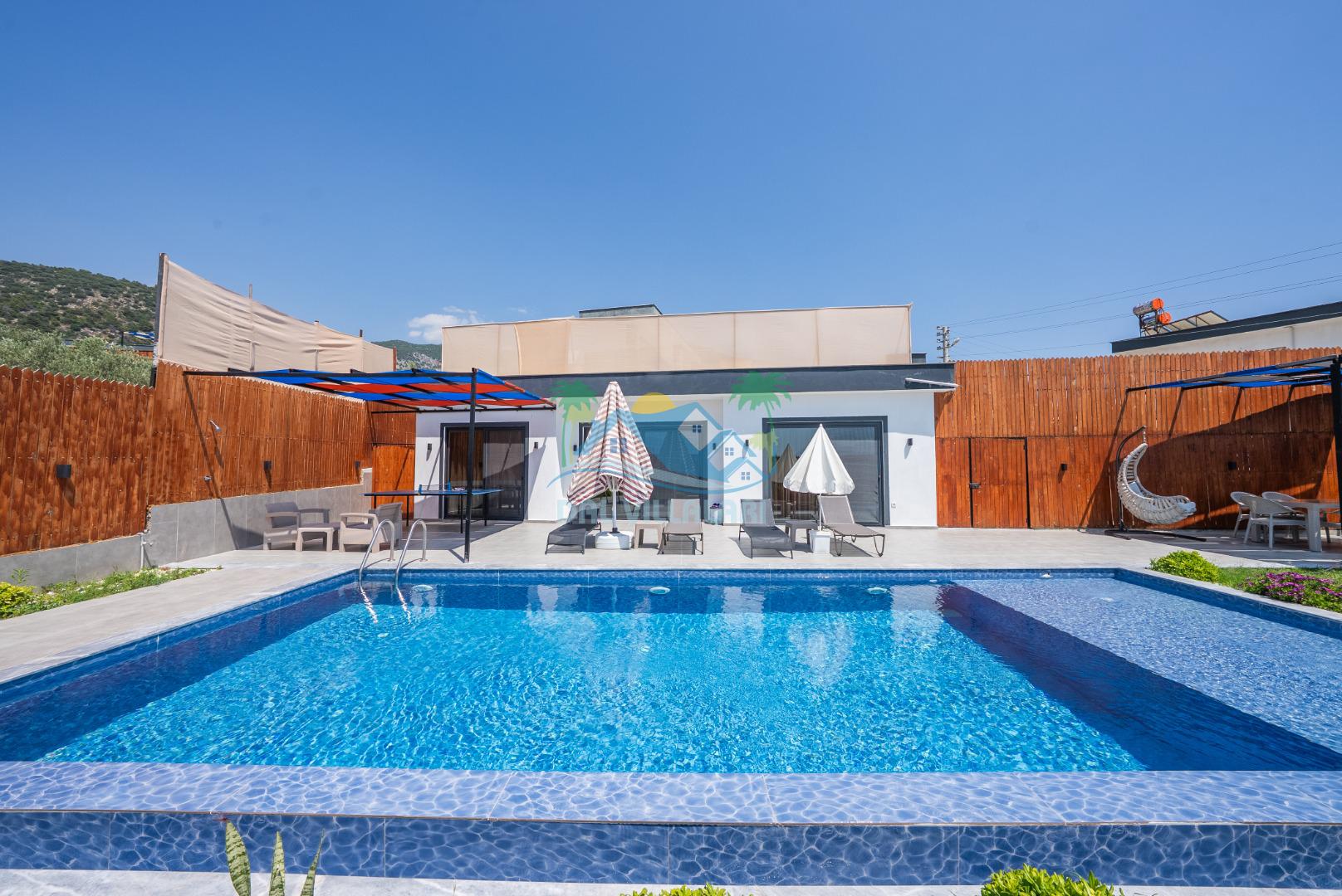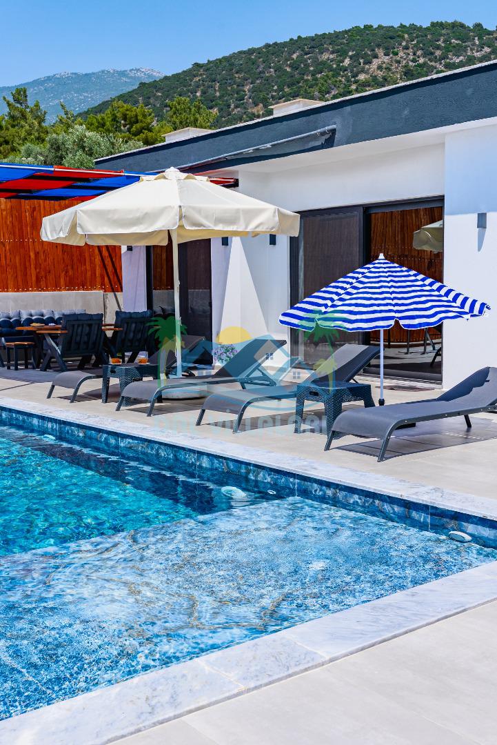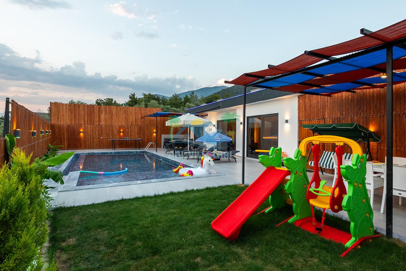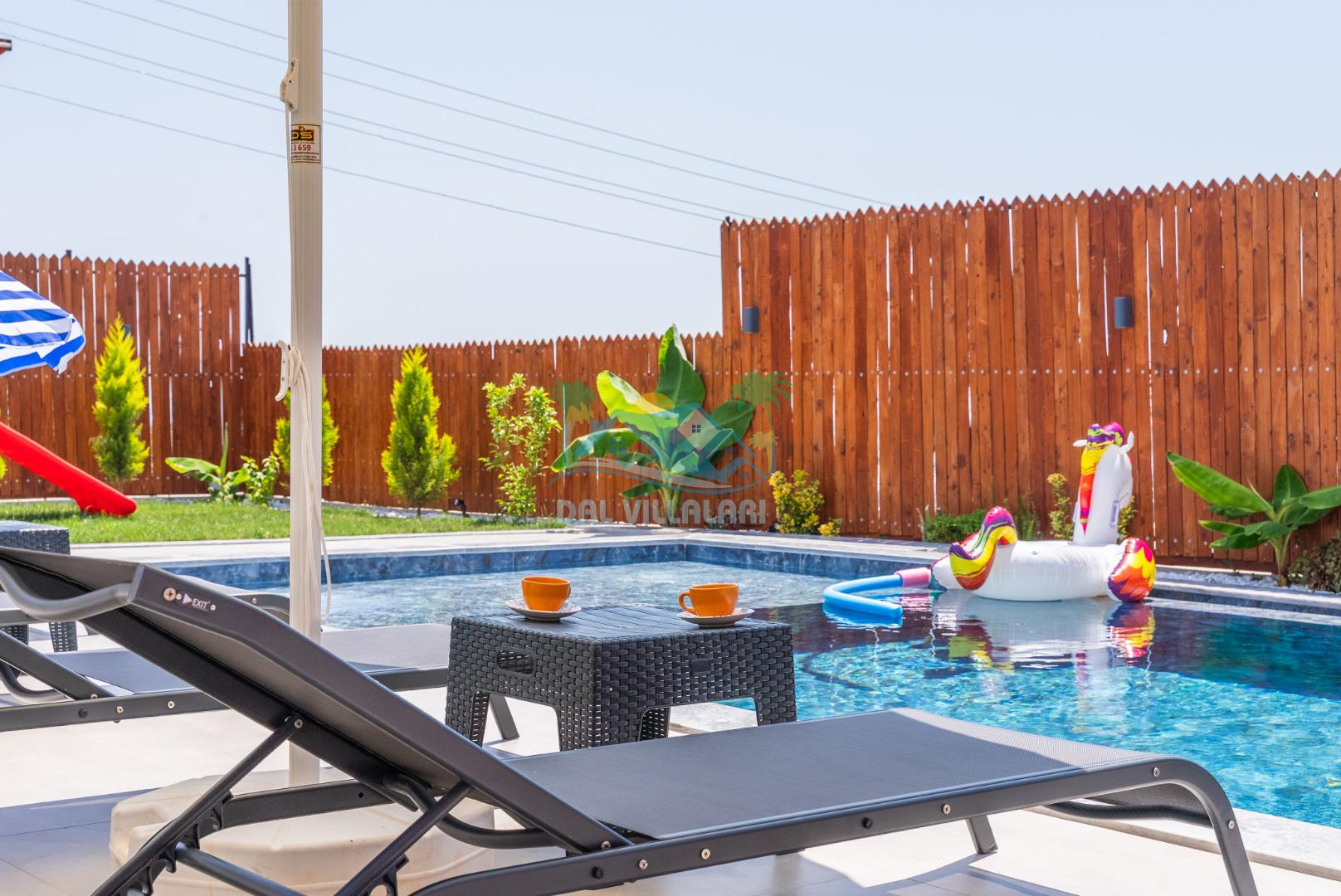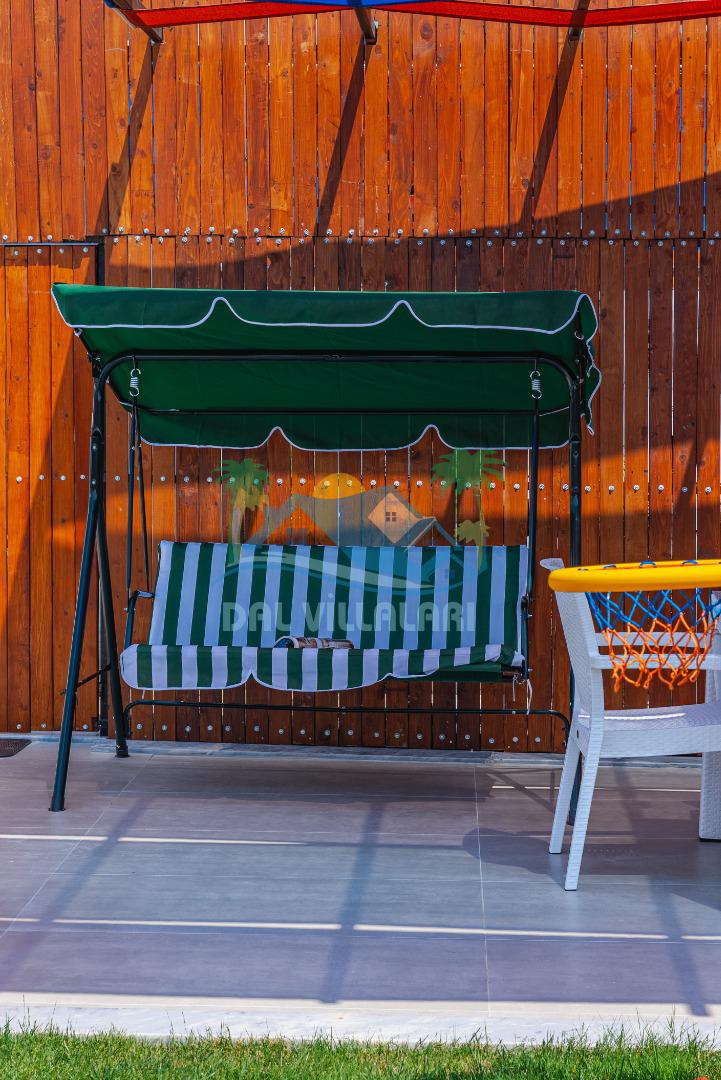 Temiz havanın, gökyüzünün ve güneşin hiç eksilmediği havuz ve bahçe alanında bitmesin isteyeceğiniz bir tatil sizleri bekliyor, Şehirden uzak sakin tatil arayan misafirerimizin tam olarak aradığı bulacağı kriterlere ve olanaklara sahip villa, doğayla iç içe konumu ve tatinize renk katacak havuz terasında kapasiteye uygun şezlong takımı, salıncak, çocuk oyun ekipmanları, oturma grubu ve barbekü alanı ile keyifli bir alana sahiptir. Geniş havuz ve bahçesine açılan konforlu oturma odası ve tam donanımlı açık mutfağı; birinci yatak odasında çift kişilik yatak, ebeveyn banyosu ve jakuzi; ikinci yatak odasında ise bir çift kişilik yatak, bir tek kişilik yatak ve banyo bulunmaktadır.