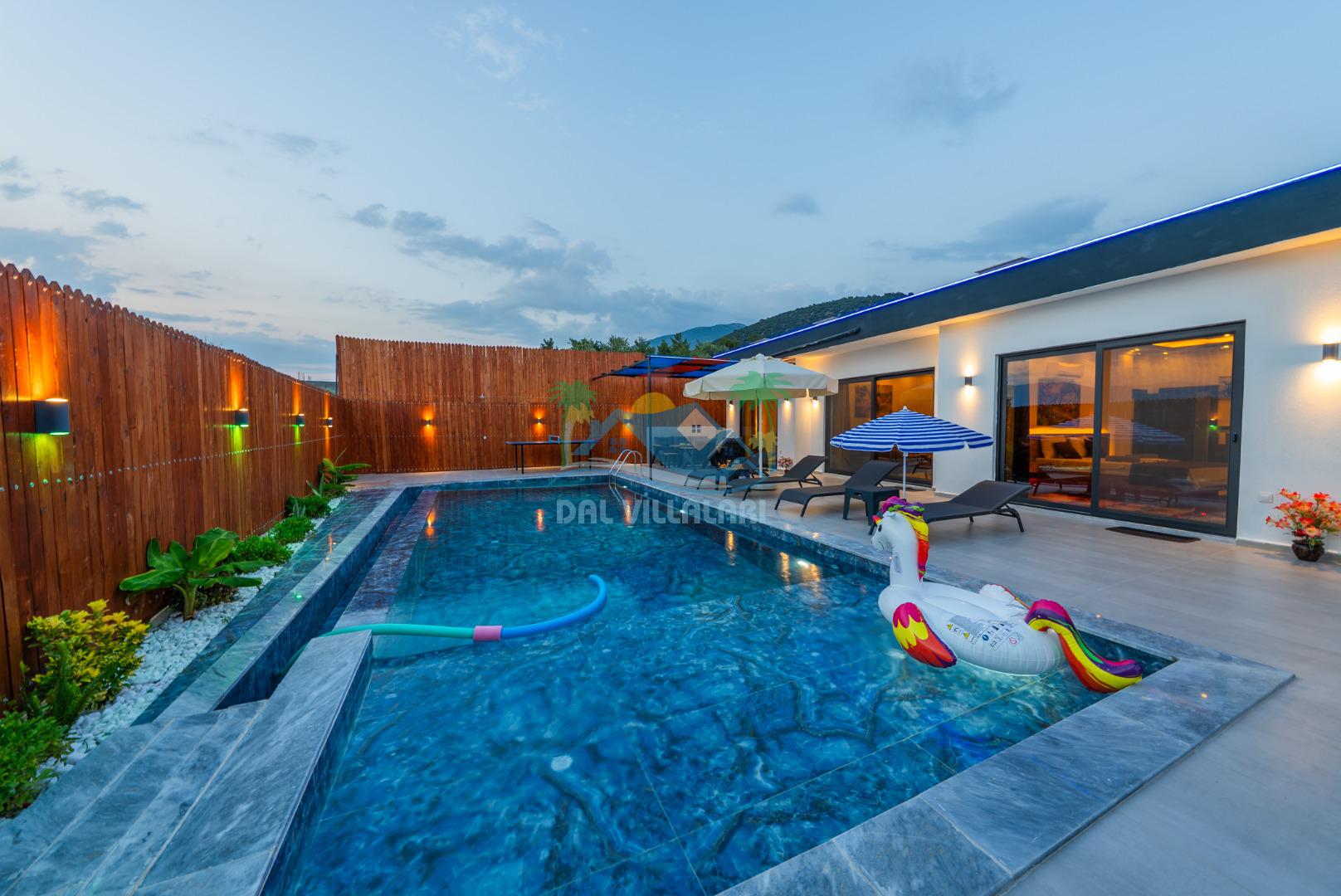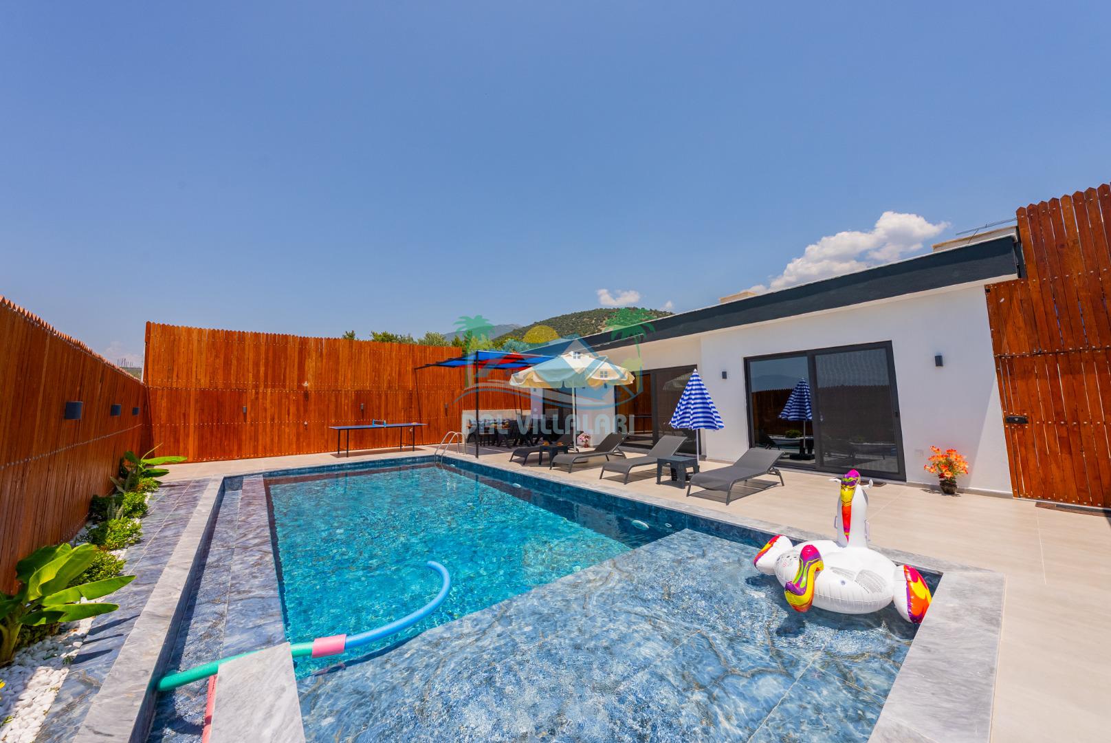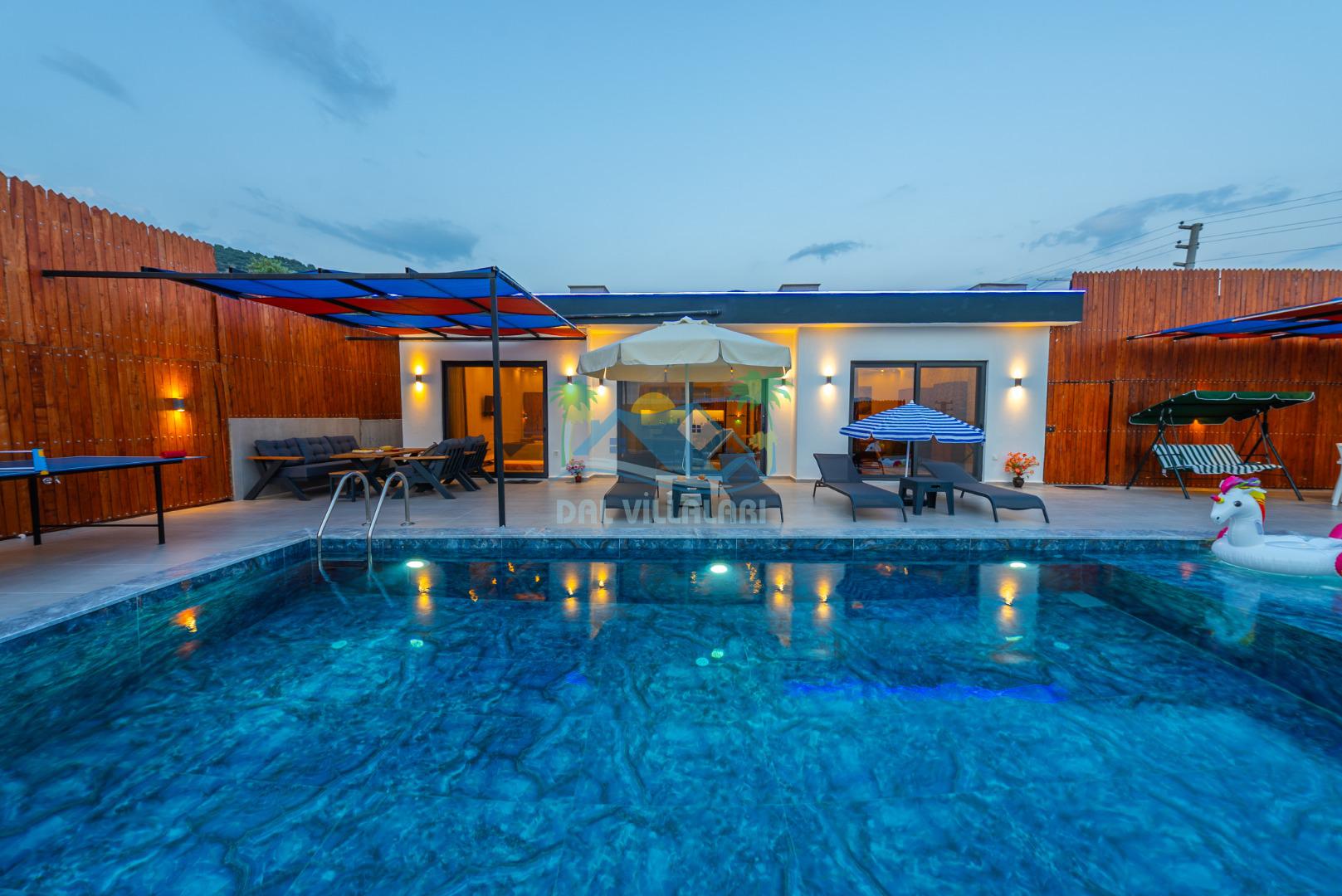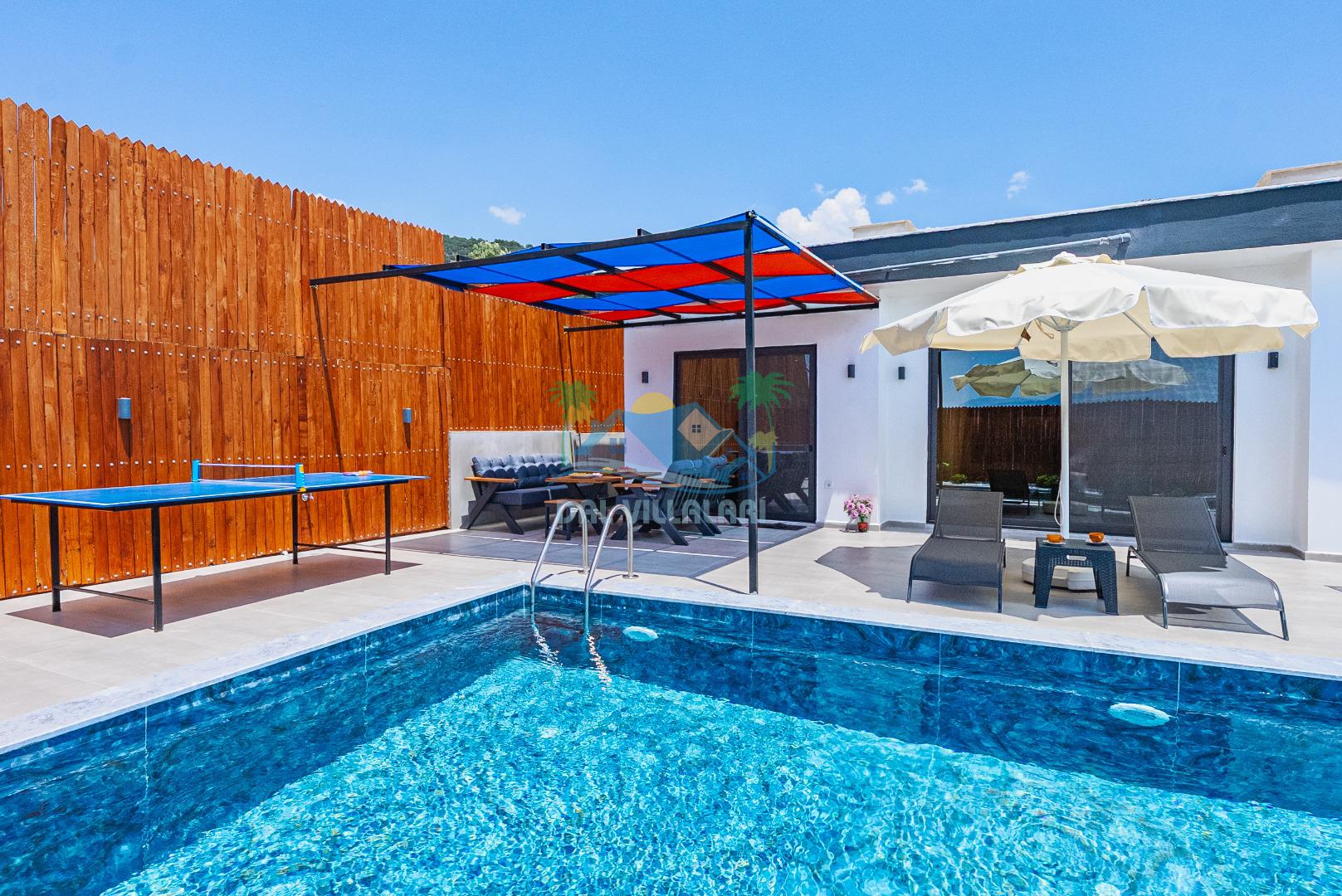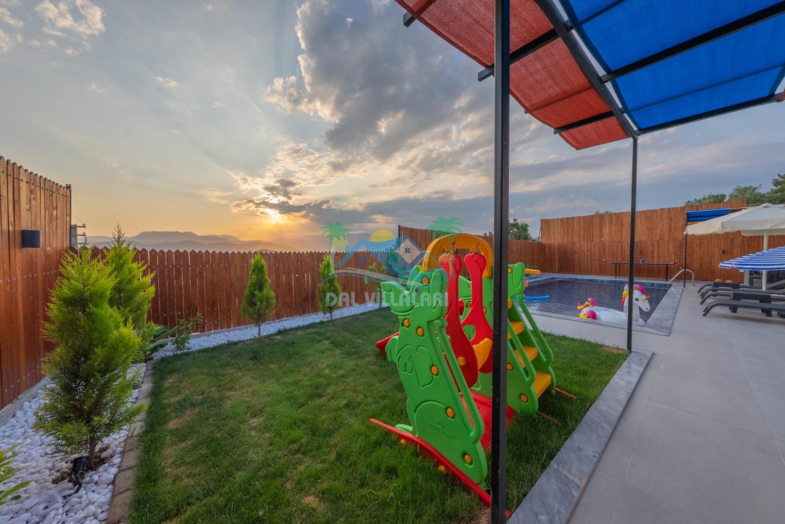 Temiz havanın, gökyüzünün ve güneşin hiç eksilmediği havuz ve bahçe alanında bitmesin isteyeceğiniz bir tatil sizleri bekliyor, Şehirden uzak sakin tatil arayan misafirerimizin tam olarak aradığı bulacağı kriterlere ve olanaklara sahip villa, doğayla iç içe konumu ve tatinize renk katacak havuz terasında kapasiteye uygun şezlong takımı, salıncak, çocuk oyun ekipmanları, oturma grubu ve barbekü alanı ile keyifli bir alana sahiptir. Geniş havuz ve bahçesine açılan konforlu oturma odası ve tam donanımlı açık mutfağı; birinci yatak odasında çift kişilik yatak, ebeveyn banyosu ve jakuzi; ikinci yatak odasında ise bir çift kişilik yatak, bir tek kişilik yatak ve banyo bulunmaktadır.