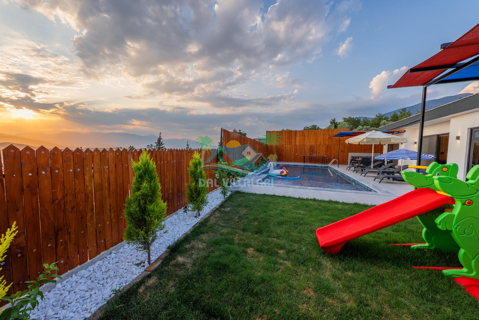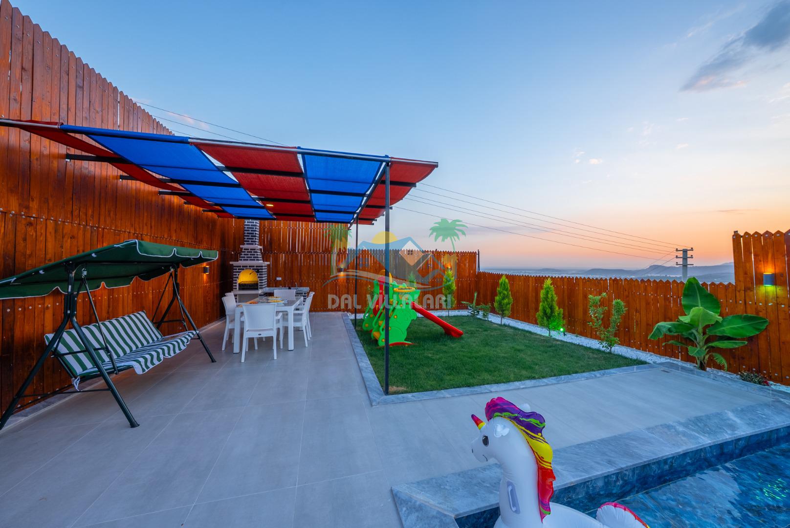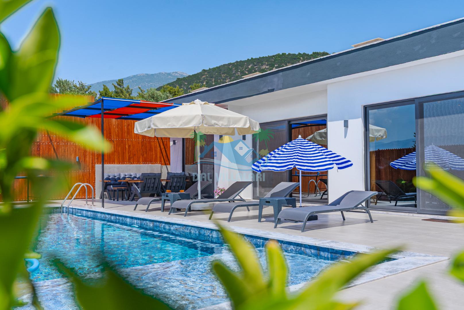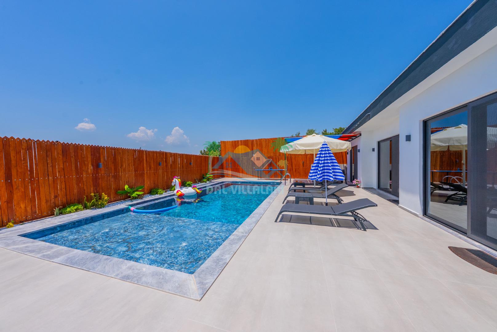Temiz havanın, gökyüzünün ve güneşin hiç eksilmediği havuz ve bahçe alanında bitmesin isteyeceğiniz bir tatil sizleri bekliyor, Şehirden uzak sakin tatil arayan misafirerimizin tam olarak aradığı bulacağı kriterlere ve olanaklara sahip villa, doğayla iç içe konumu ve tatinize renk katacak havuz terasında kapasiteye uygun şezlong takımı, salıncak, çocuk oyun ekipmanları, oturma grubu ve barbekü alanı ile keyifli bir alana sahiptir. Geniş havuz ve bahçesine açılan konforlu oturma odası ve tam donanımlı açık mutfağı; birinci yatak odasında çift kişilik yatak, ebeveyn banyosu ve jakuzi; ikinci yatak odasında ise bir çift kişilik yatak, bir tek kişilik yatak ve banyo bulunmaktadır.