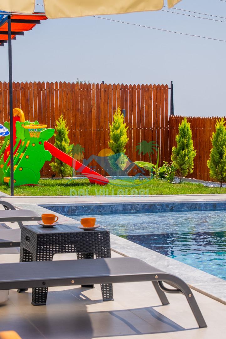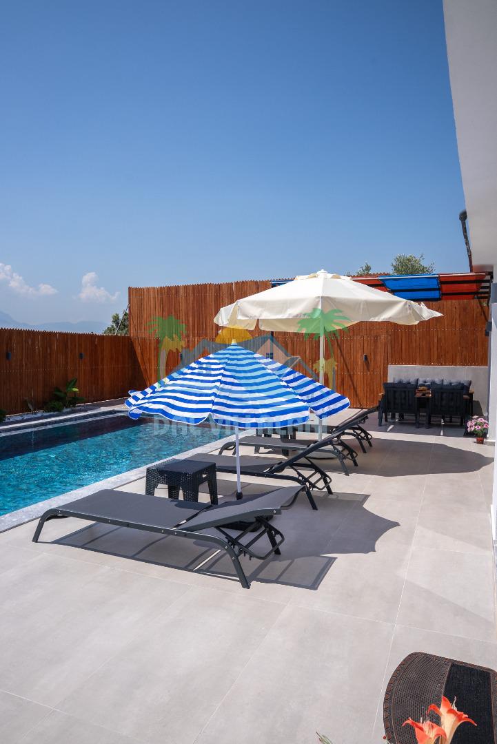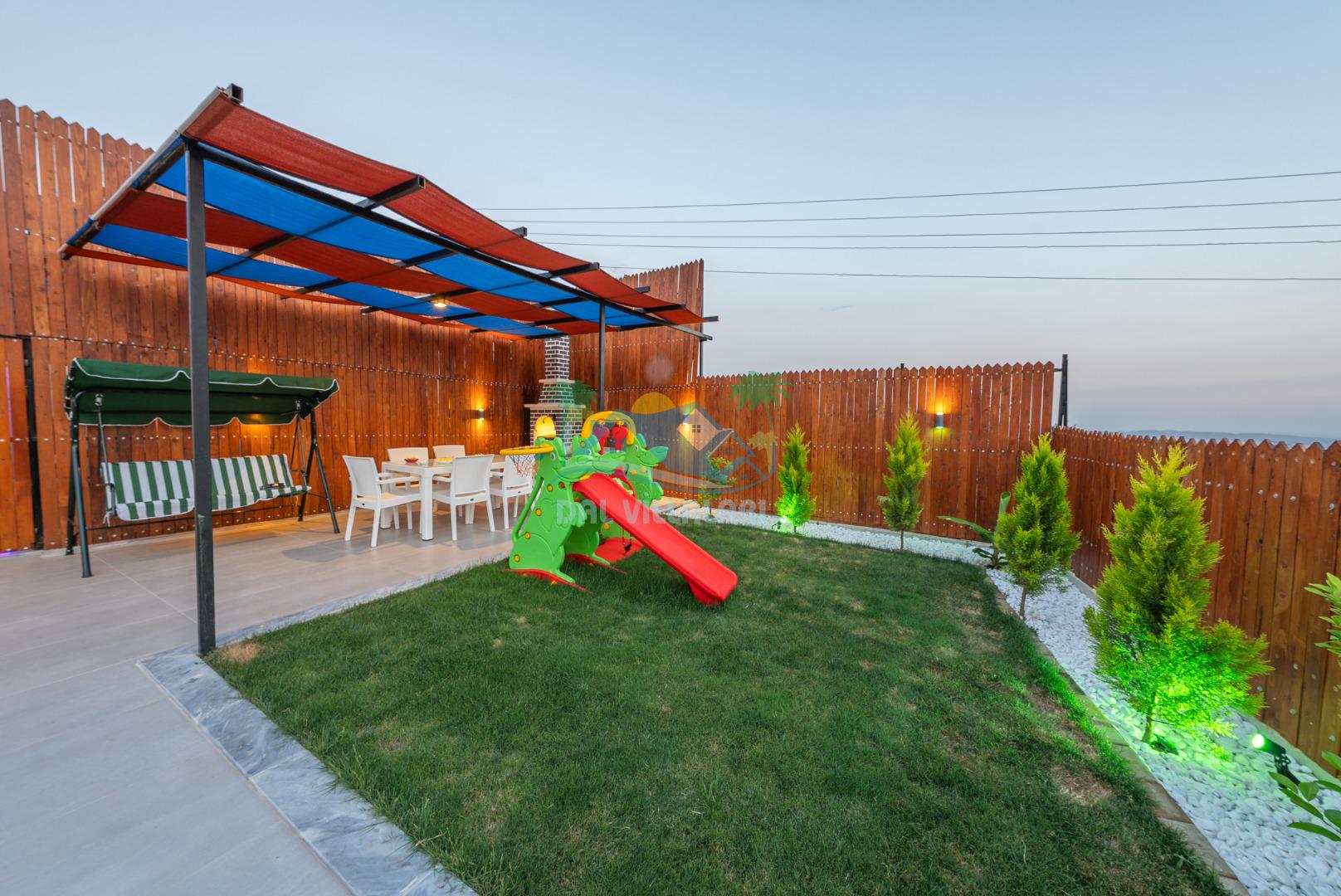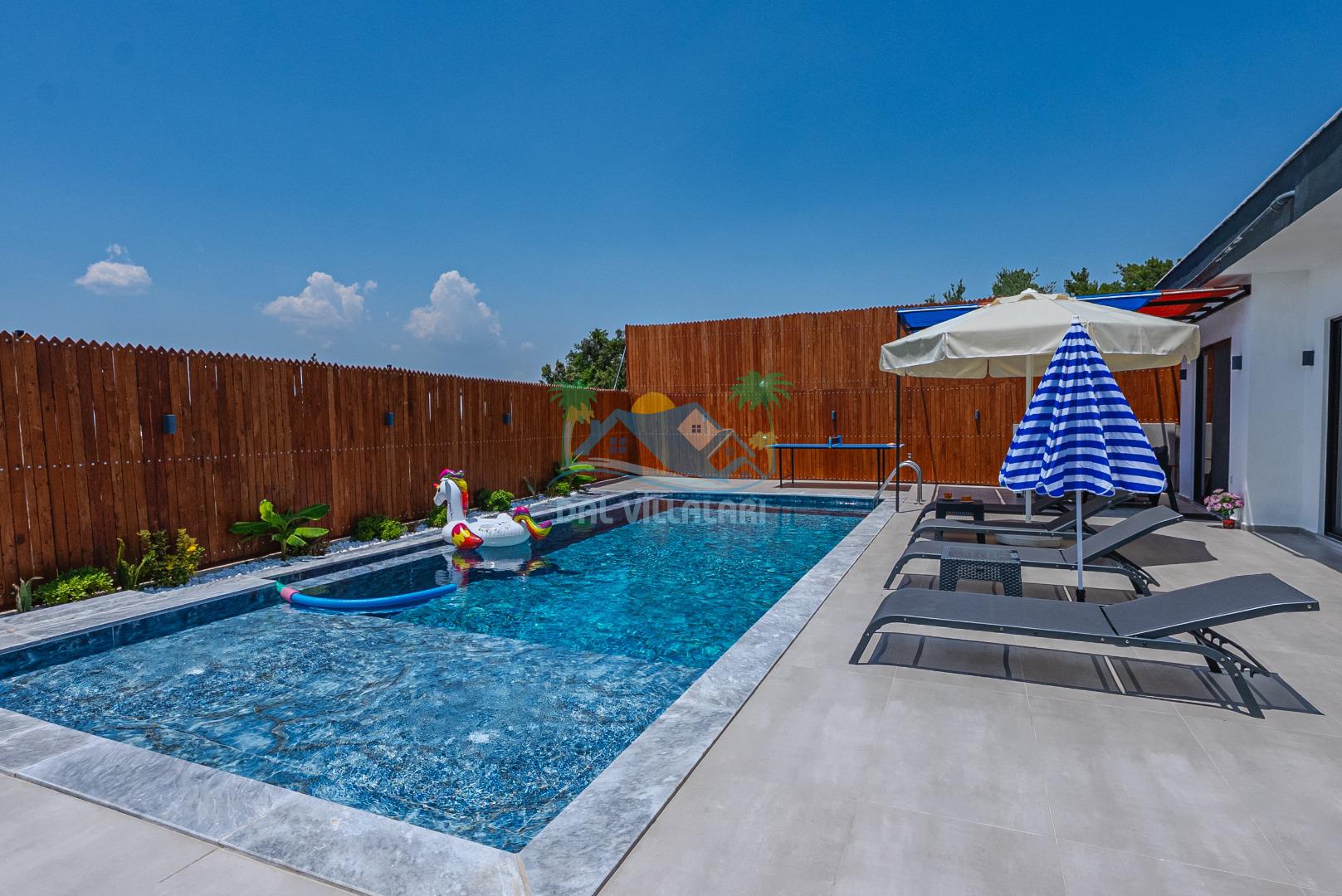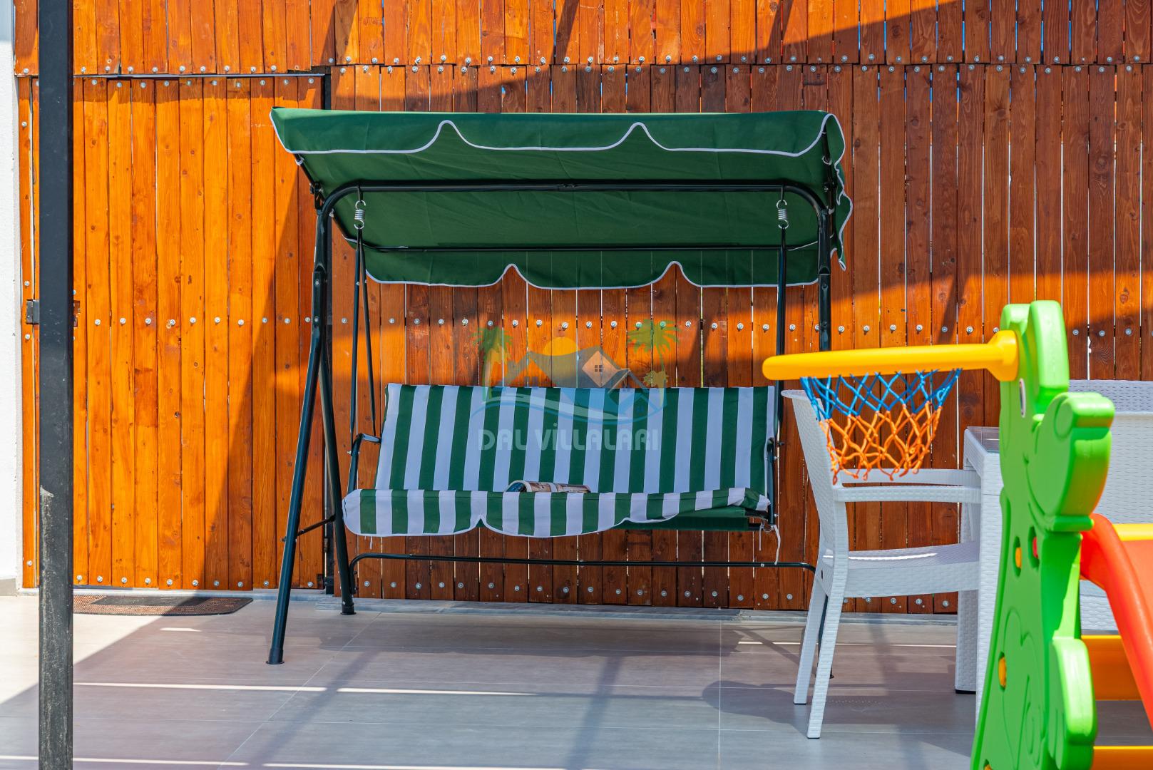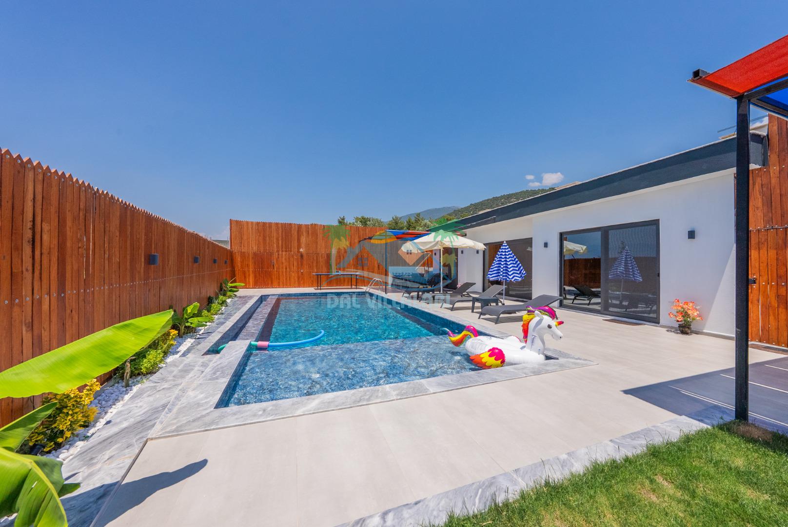 Temiz havanın, gökyüzünün ve güneşin hiç eksilmediği havuz ve bahçe alanında bitmesin isteyeceğiniz bir tatil sizleri bekliyor, Şehirden uzak sakin tatil arayan misafirerimizin tam olarak aradığı bulacağı kriterlere ve olanaklara sahip villa, doğayla iç içe konumu ve tatinize renk katacak havuz terasında kapasiteye uygun şezlong takımı, salıncak, çocuk oyun ekipmanları, oturma grubu ve barbekü alanı ile keyifli bir alana sahiptir. Geniş havuz ve bahçesine açılan konforlu oturma odası ve tam donanımlı açık mutfağı; birinci yatak odasında çift kişilik yatak, ebeveyn banyosu ve jakuzi; ikinci yatak odasında ise bir çift kişilik yatak, bir tek kişilik yatak ve banyo bulunmaktadır.