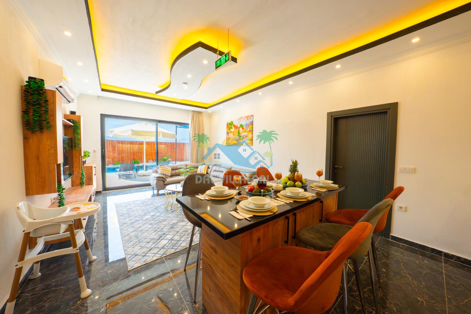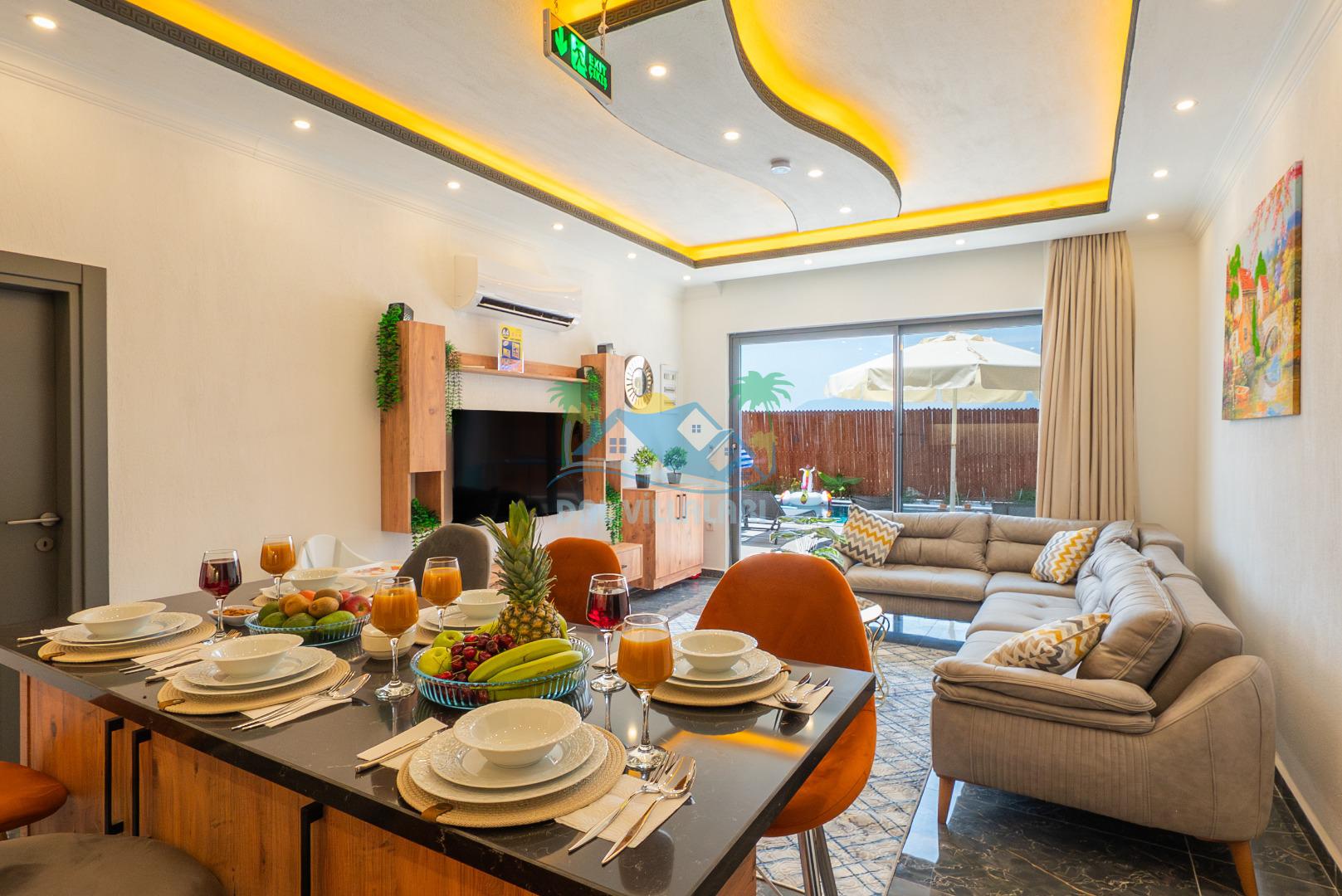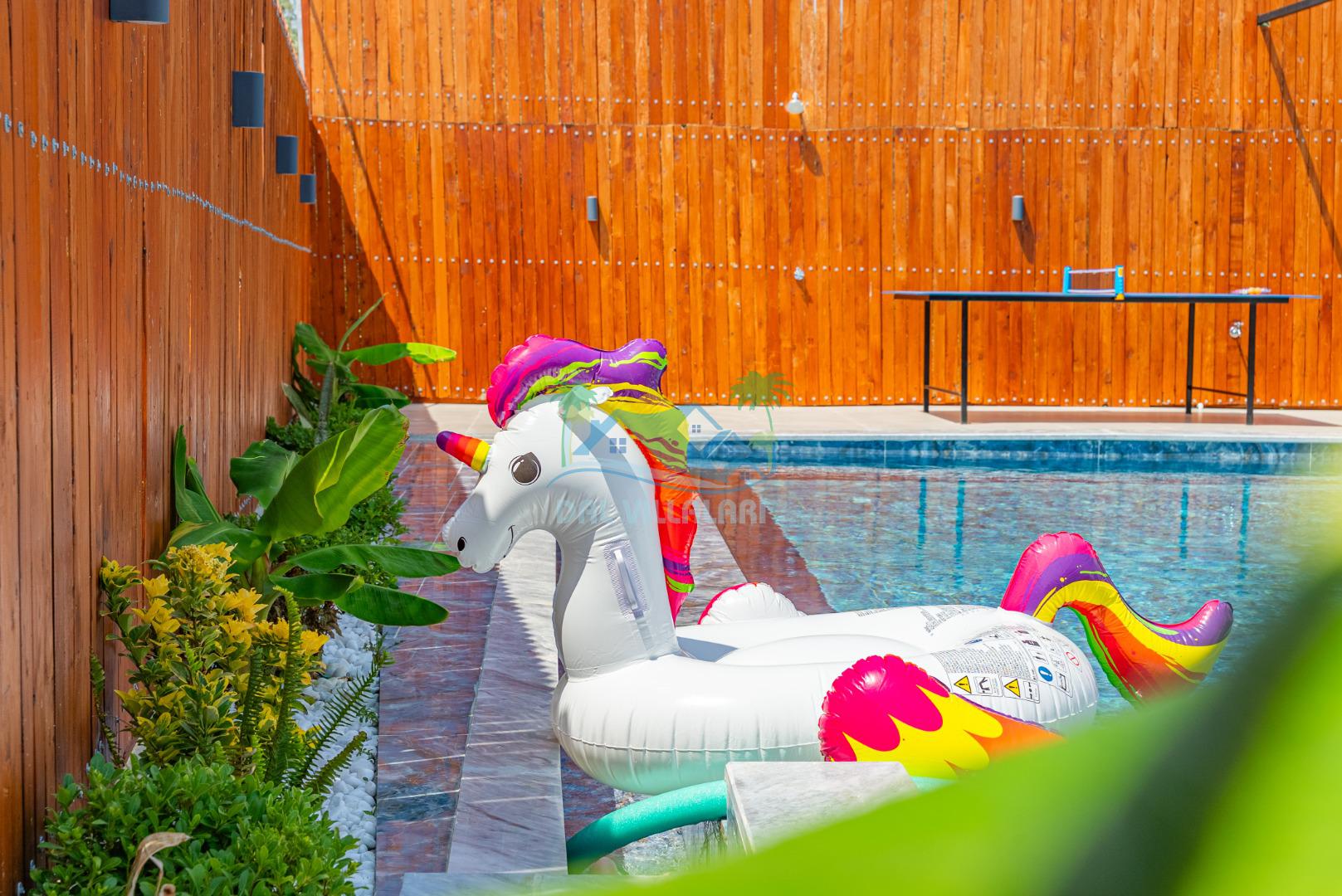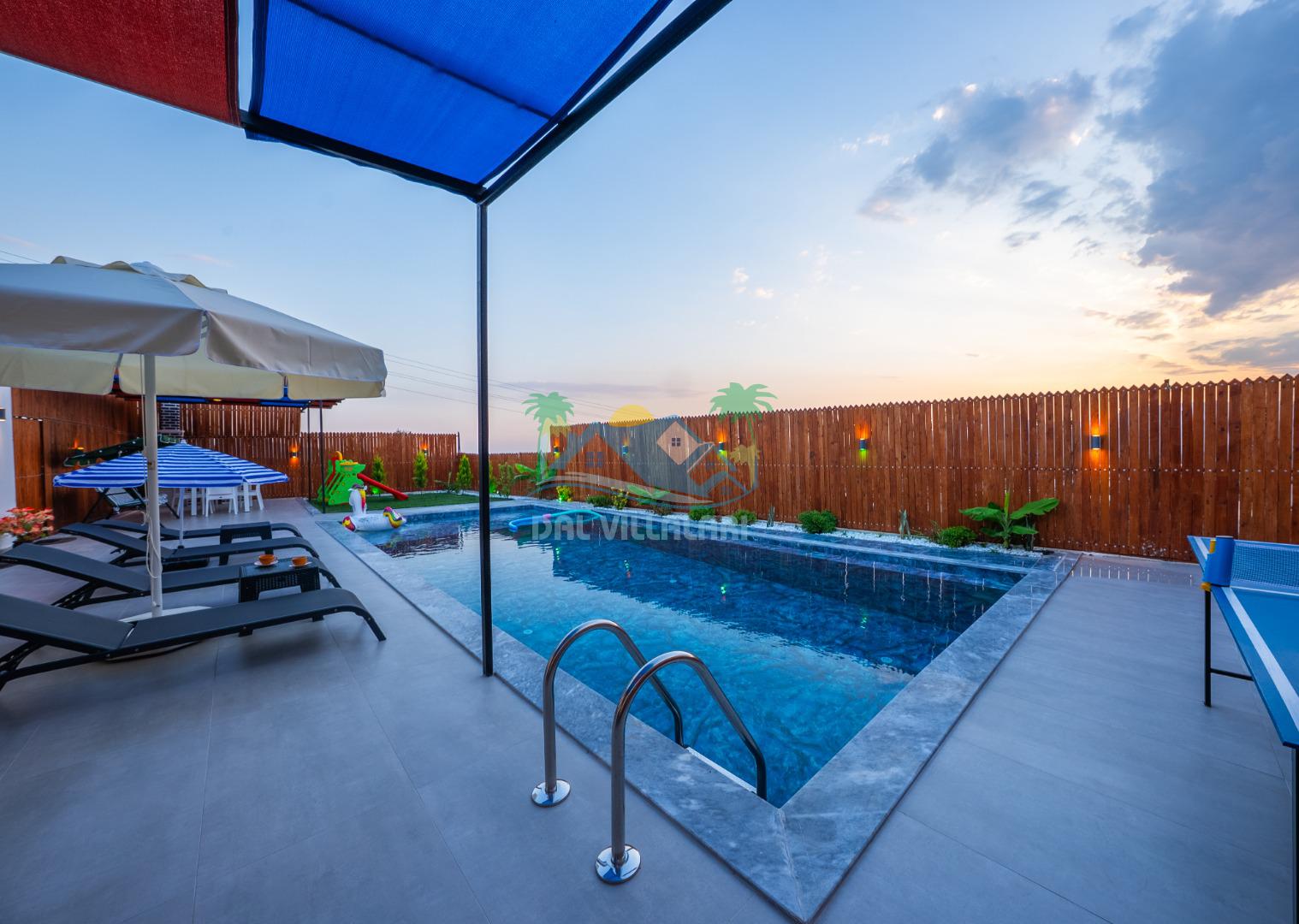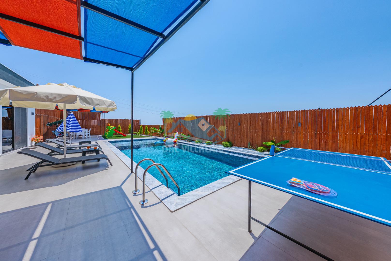 Temiz havanın, gökyüzünün ve güneşin hiç eksilmediği havuz ve bahçe alanında bitmesin isteyeceğiniz bir tatil sizleri bekliyor, Şehirden uzak sakin tatil arayan misafirerimizin tam olarak aradığı bulacağı kriterlere ve olanaklara sahip villa, doğayla iç içe konumu ve tatinize renk katacak havuz terasında kapasiteye uygun şezlong takımı, salıncak, çocuk oyun ekipmanları, oturma grubu ve barbekü alanı ile keyifli bir alana sahiptir. Geniş havuz ve bahçesine açılan konforlu oturma odası ve tam donanımlı açık mutfağı; birinci yatak odasında çift kişilik yatak, ebeveyn banyosu ve jakuzi; ikinci yatak odasında ise bir çift kişilik yatak, bir tek kişilik yatak ve banyo bulunmaktadır.