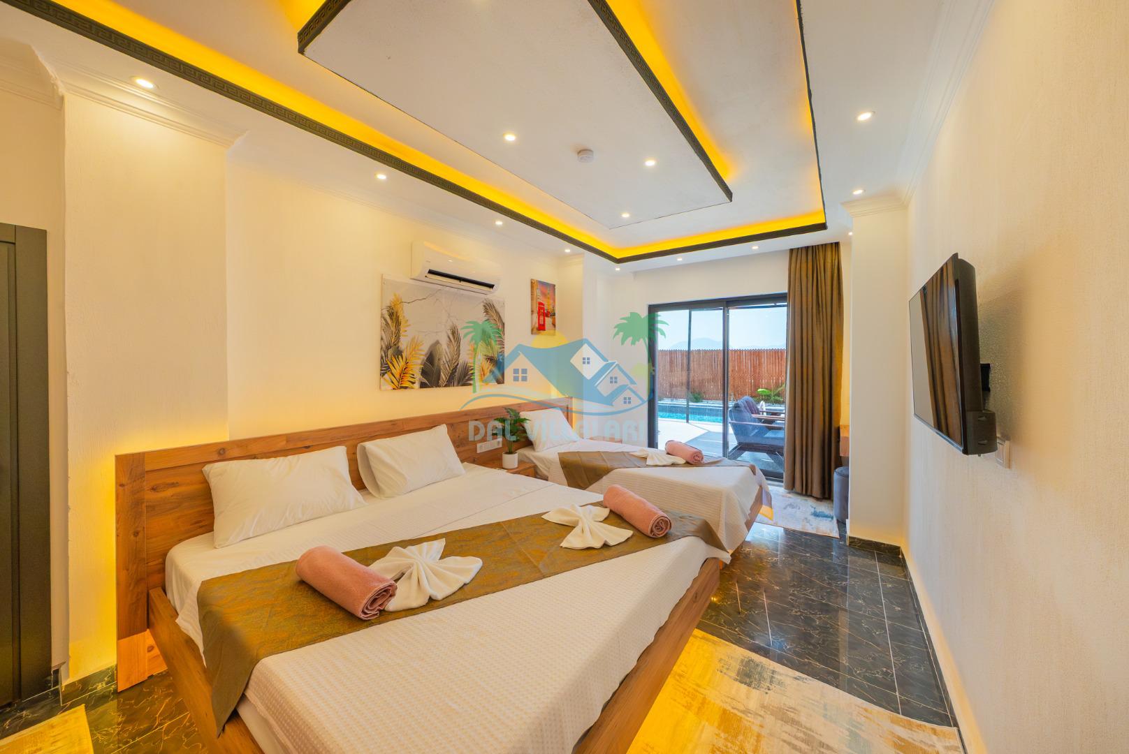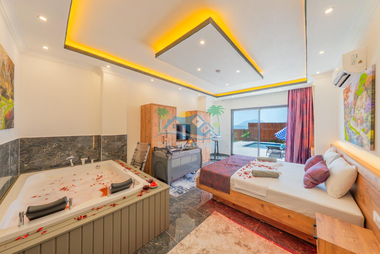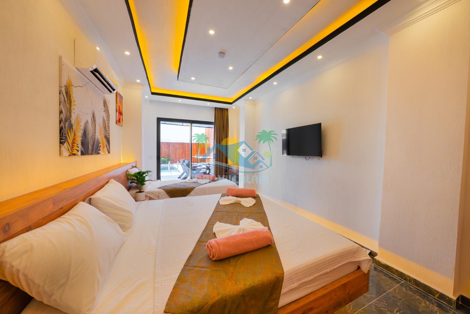 Kalkan Çavdır mevkiinde bulunan villa 2 yatak odası ile 5 kişilik konaklama kapasitesi sunmaktadır. Korunaklı havuz alanı ve jakuzi ile balayı çiftleri ve çekirdek aileler için ideal seçenekler arasında yer almaktadır.