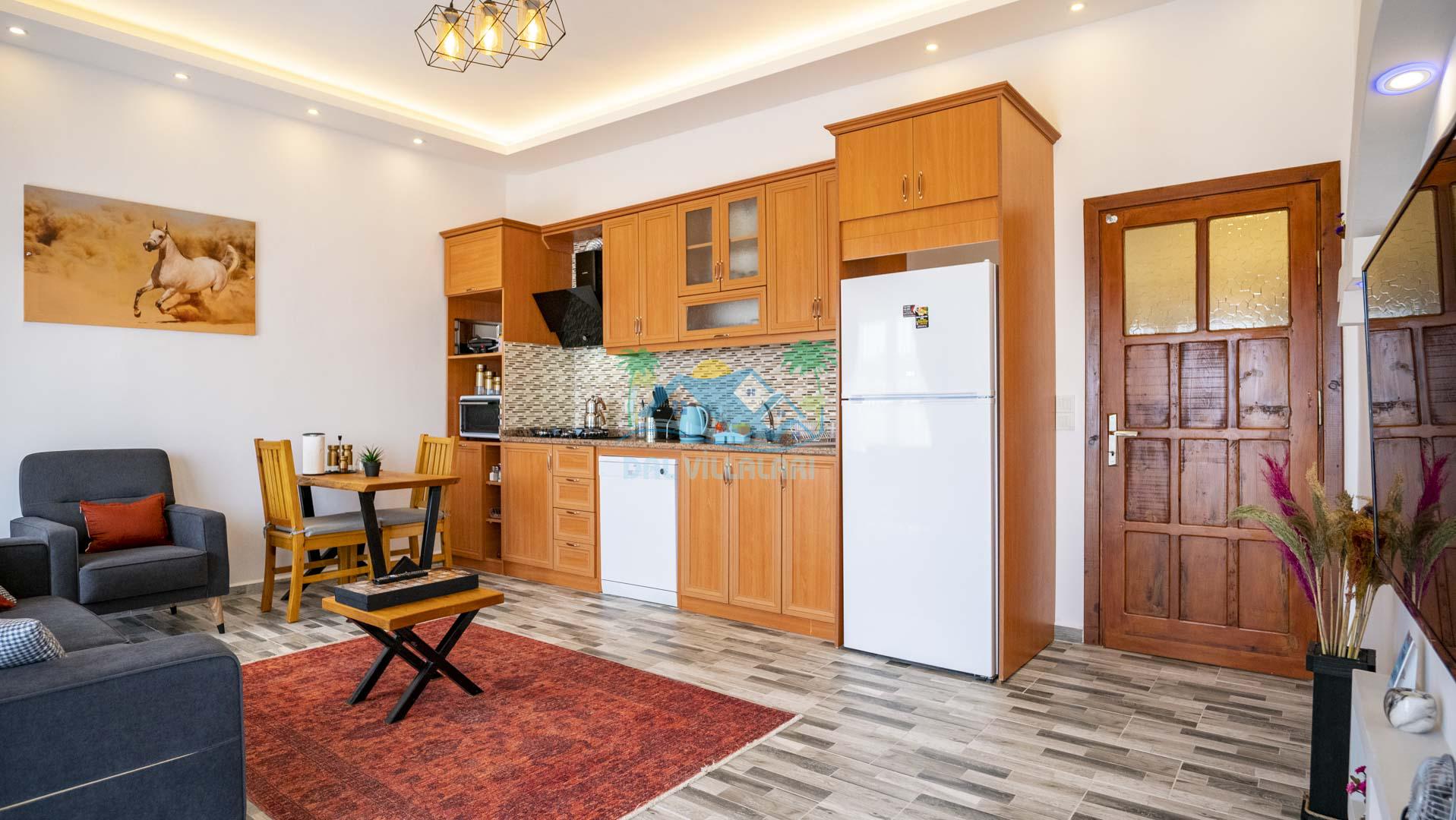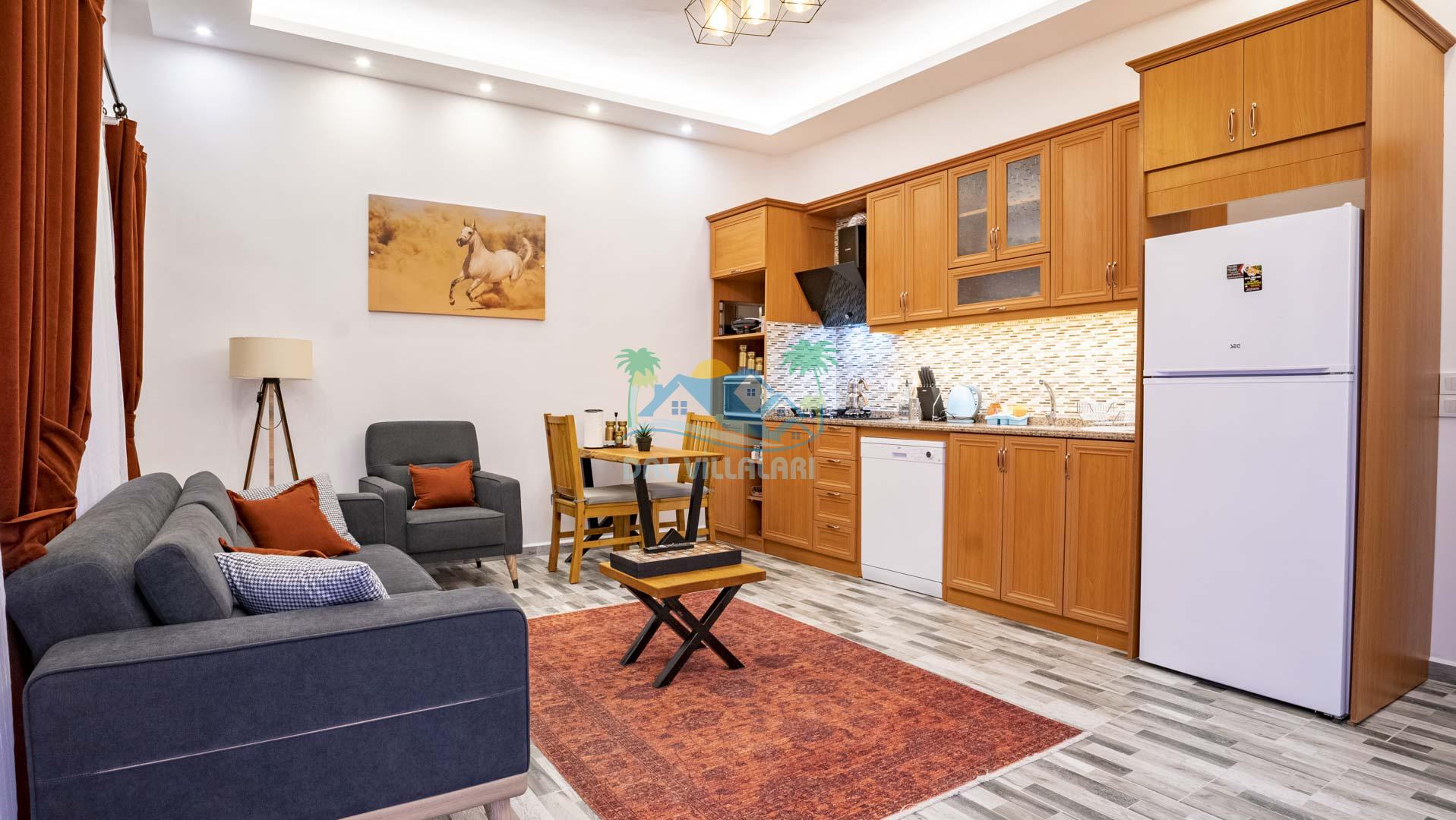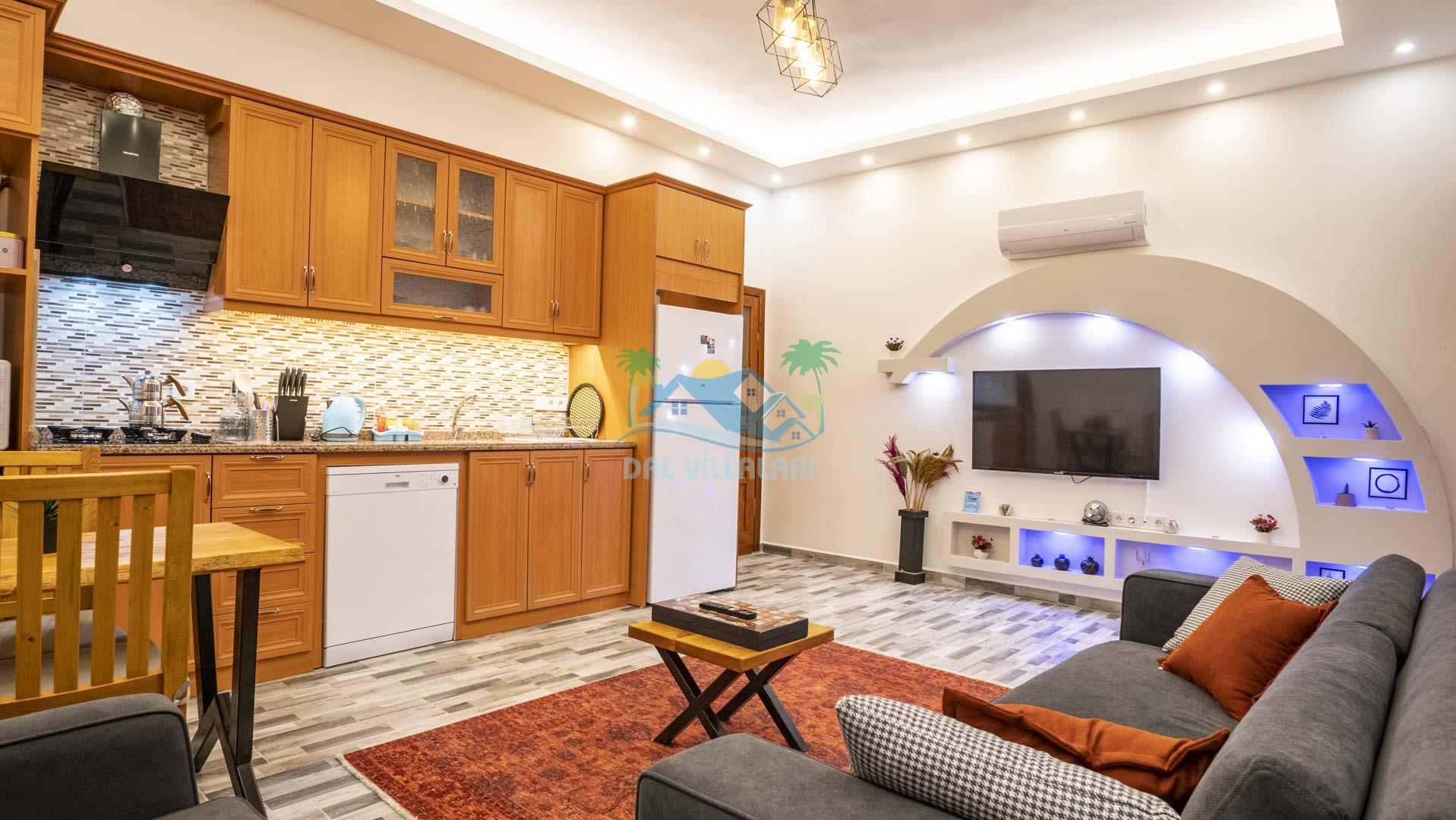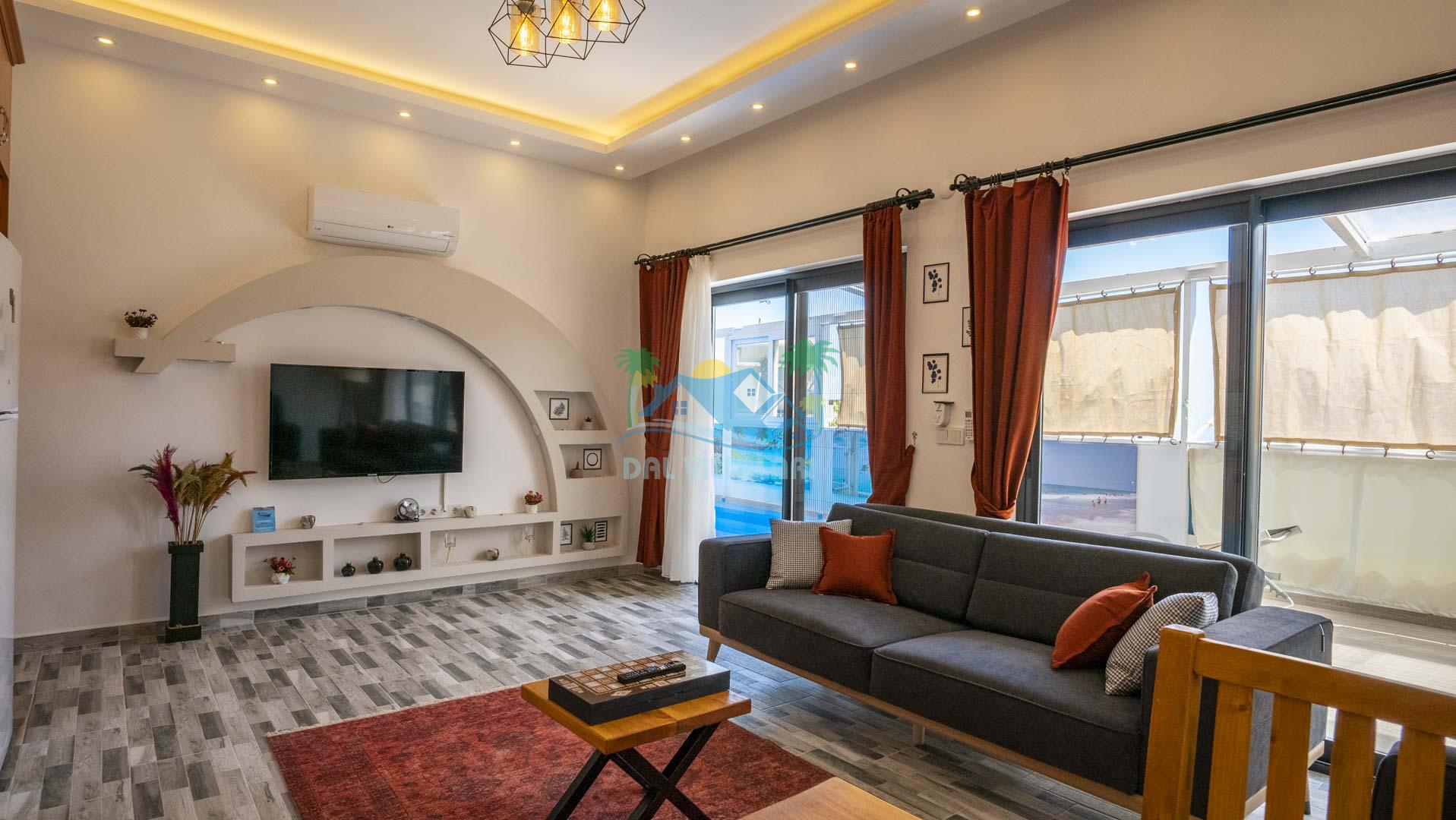 Villamız tek yatak odalıdır. Yatak odası içerisinde çift kişilik yatak ve klima bulunmaktadır. Salon içerisinde ise mutfak, oturma grubu, klima, banyo ve televizyon yer almaktadır.