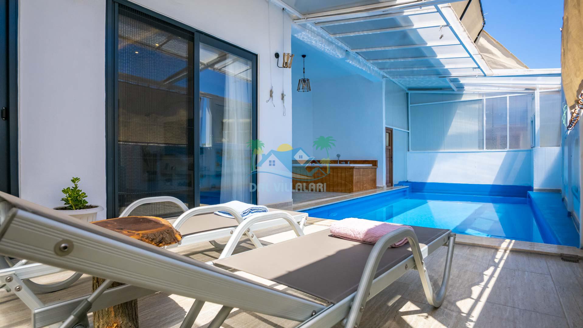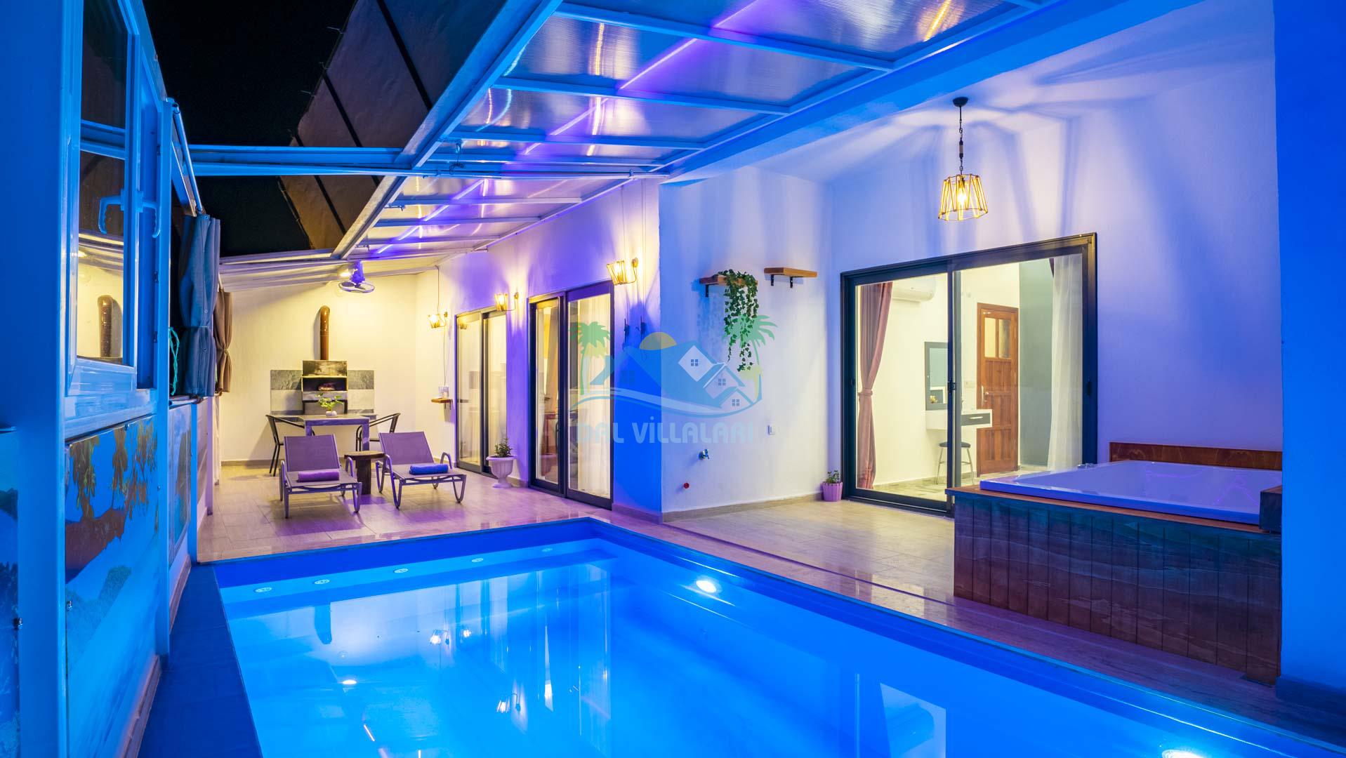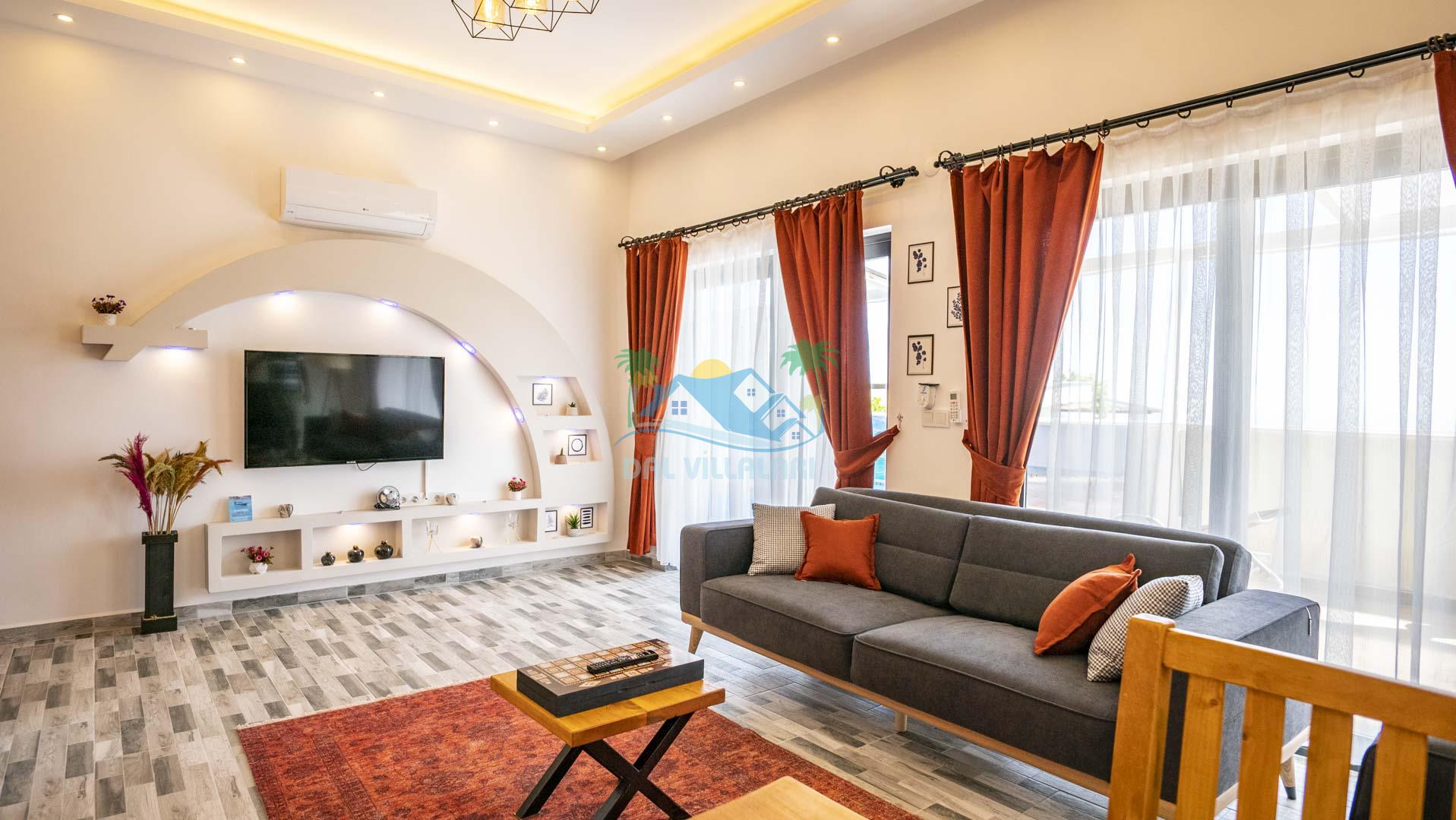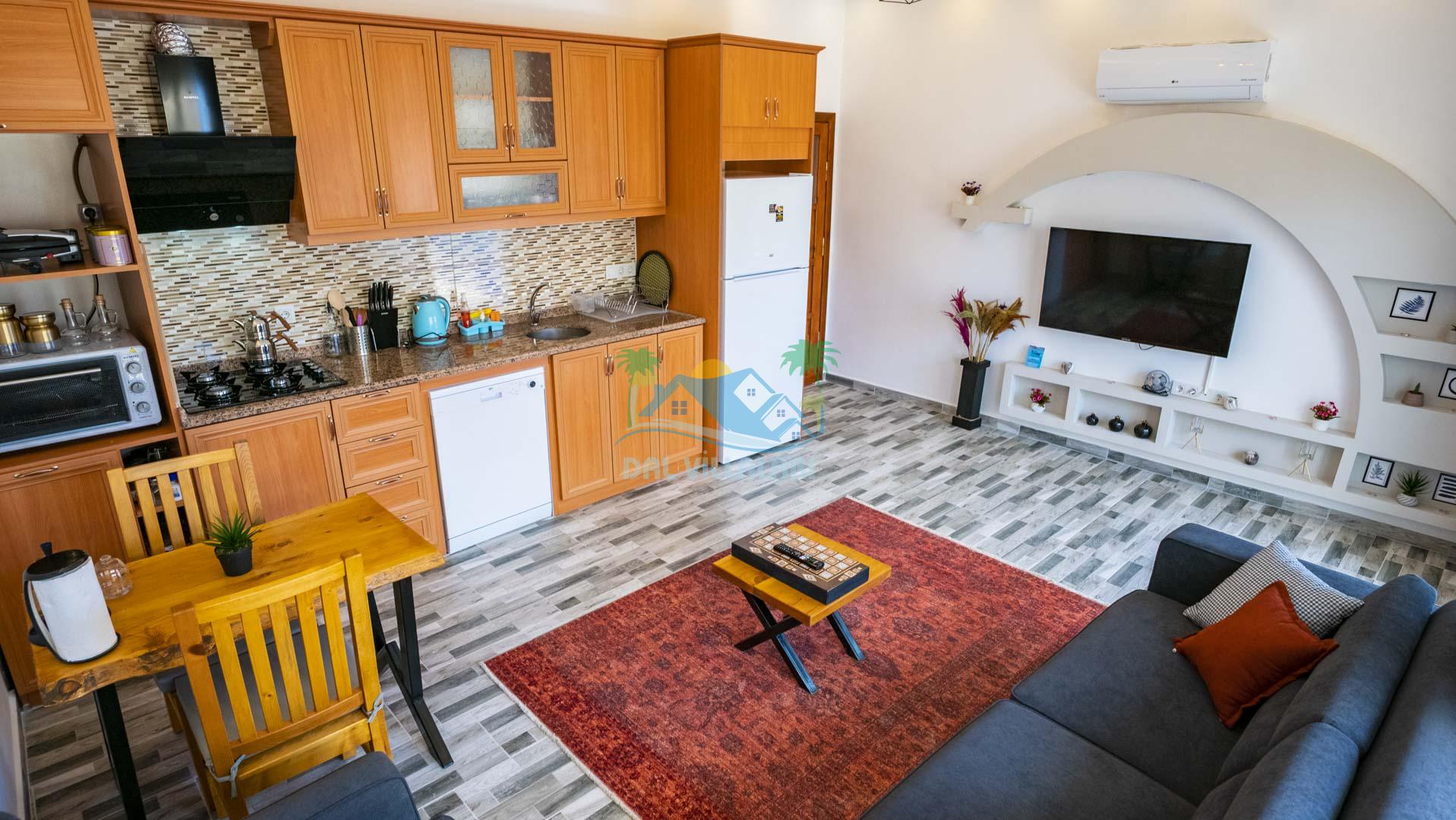 Villamız tek yatak odalıdır. Yatak odası içerisinde çift kişilik yatak ve klima bulunmaktadır. Salon içerisinde ise mutfak, oturma grubu, klima, banyo ve televizyon yer almaktadır.