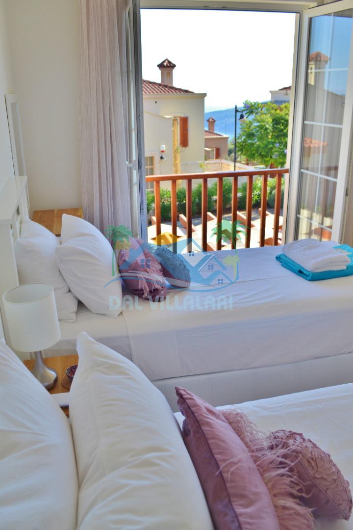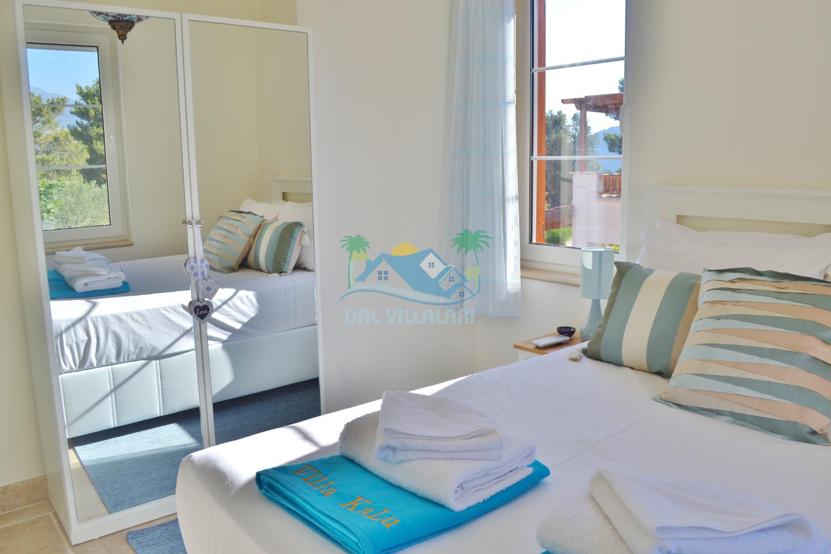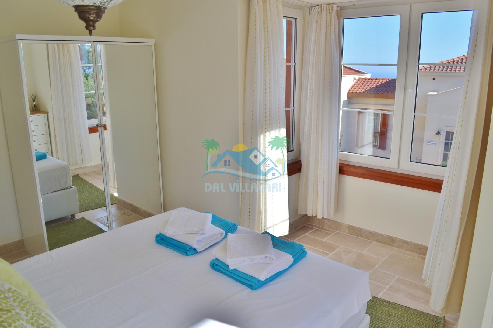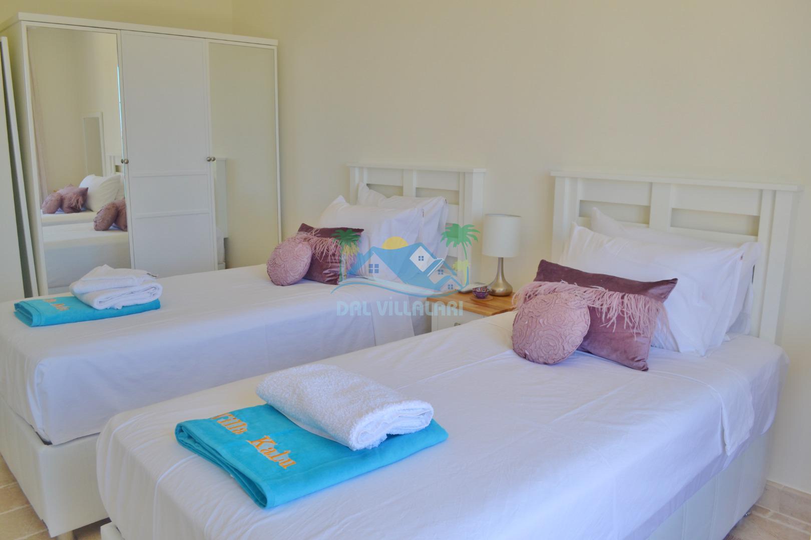 3. Yatak odası: 2 adet tek kişilik yatak, elbise dolabı, makyaj masası, saç kurutma makinası ve deniz manzarasına sahiptir.