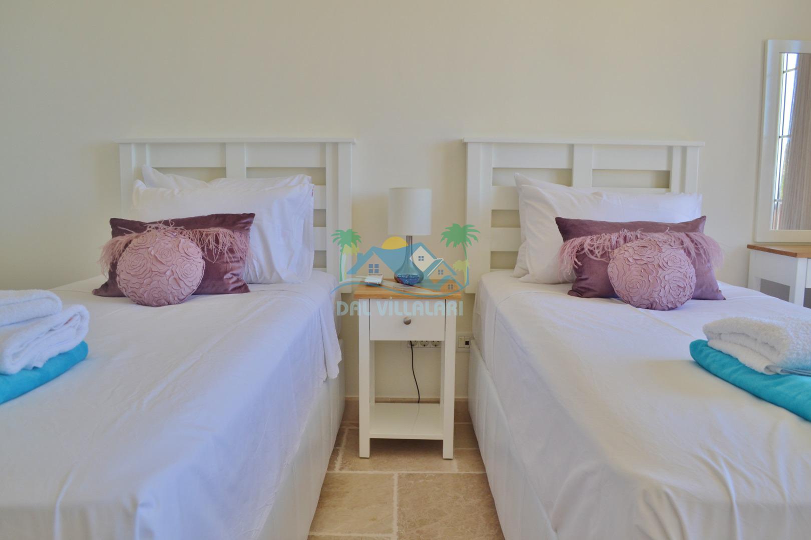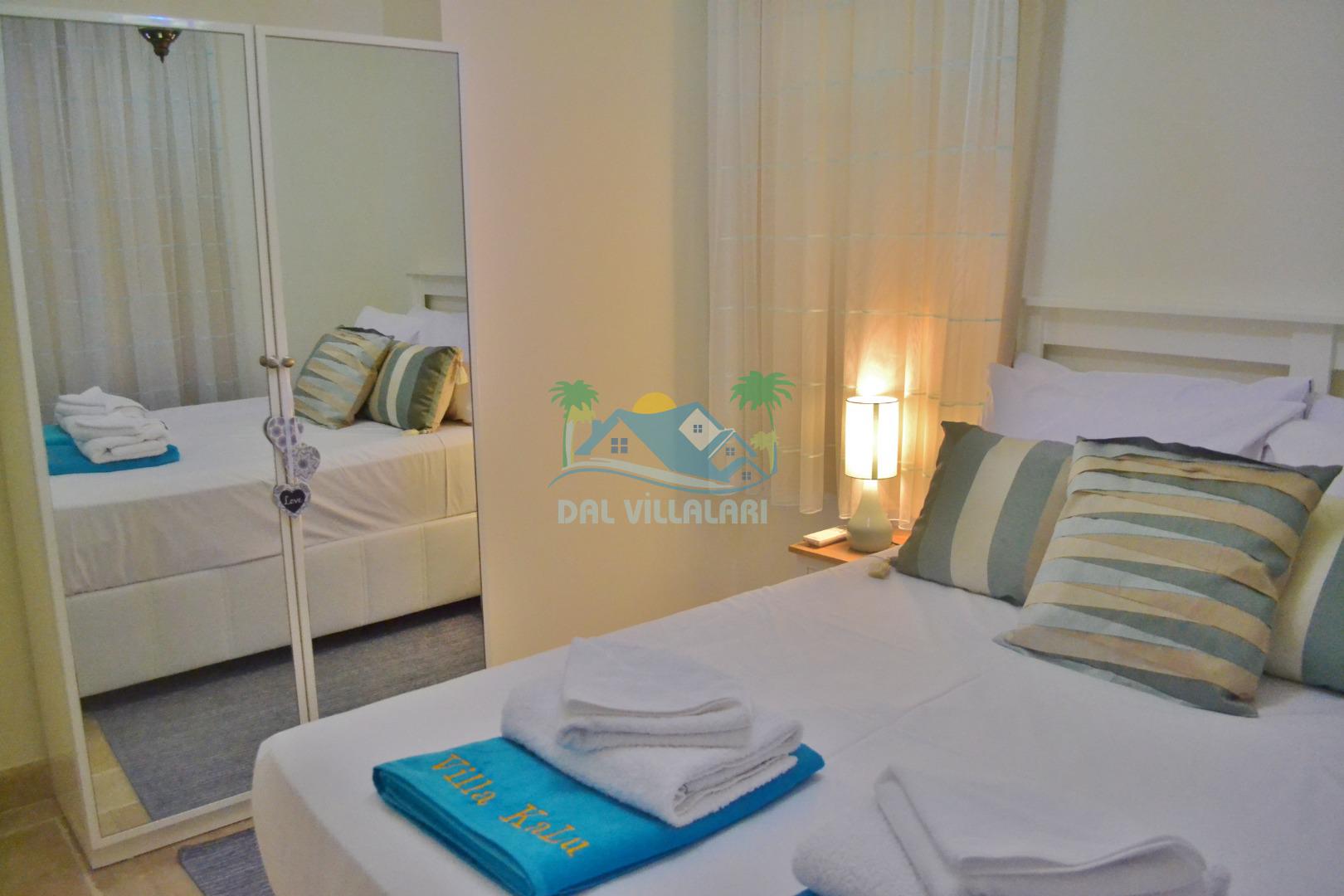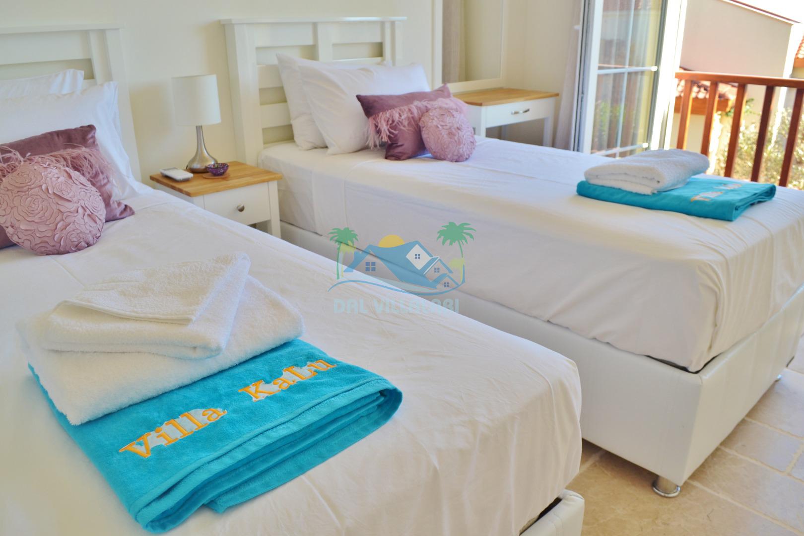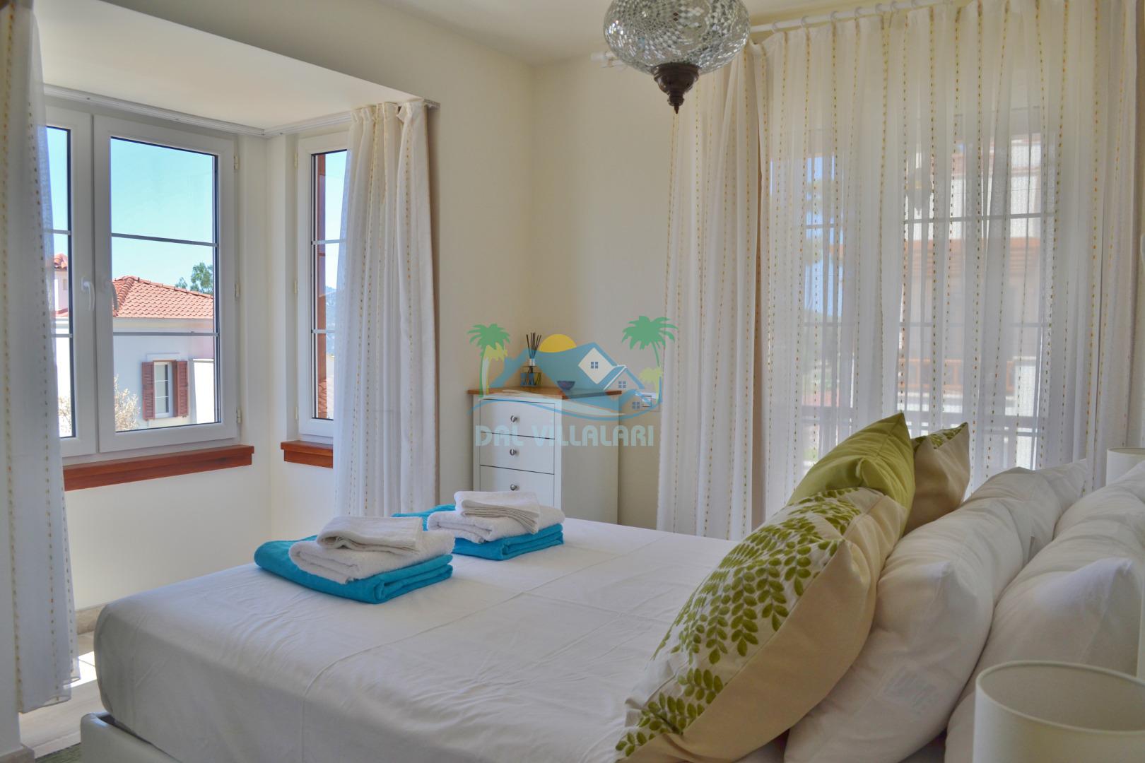 3. Yatak odası: 2 adet tek kişilik yatak, elbise dolabı, makyaj masası, saç kurutma makinası ve deniz manzarasına sahiptir.