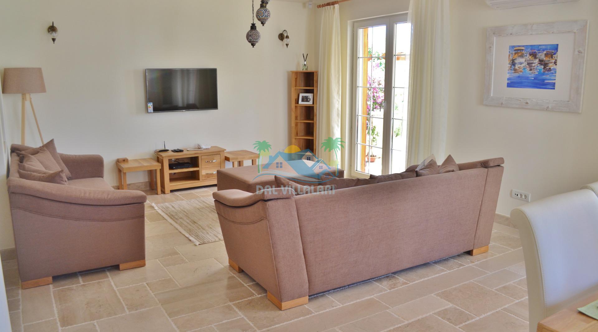 * Salonumuzda konforlu kaliteli lüks oturma gurubu, klima, hd smart tv, uydu alıcısı, sınırsız kablosuz internet mevcuttur. Salonumuzda banyove tuvalet bulunmaktadır. Salonumuzdan havuz başına ve bahçemizeçıkış vardır.