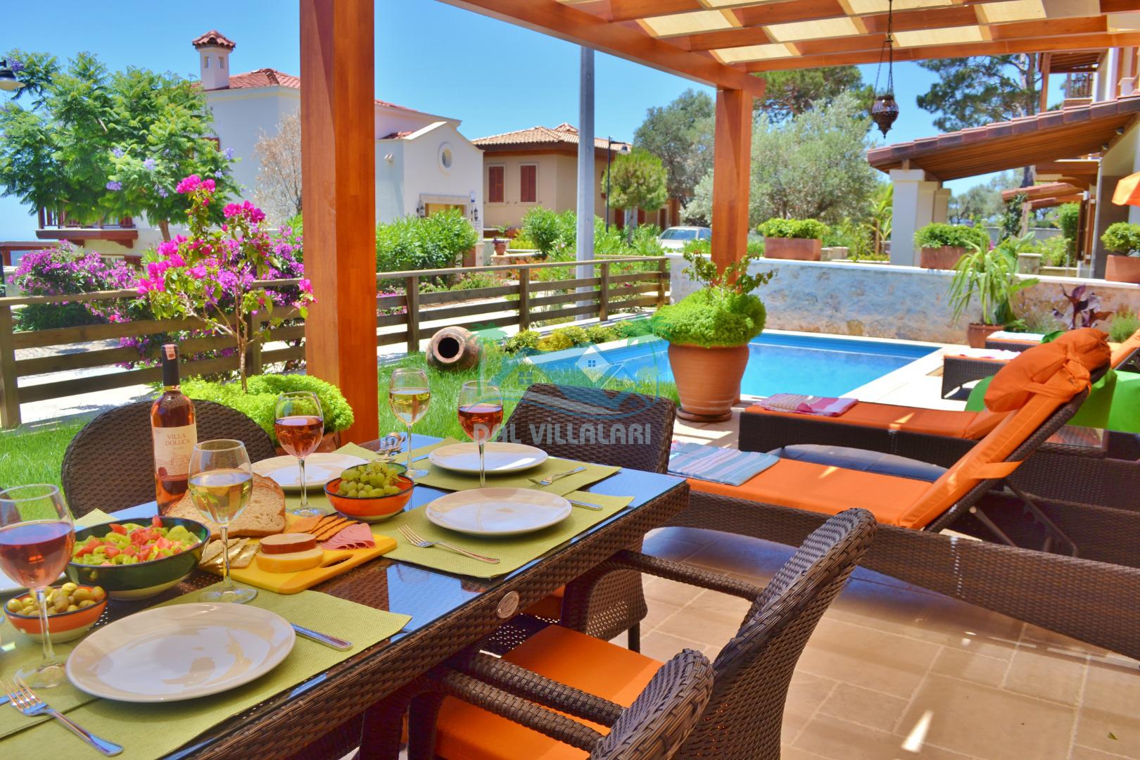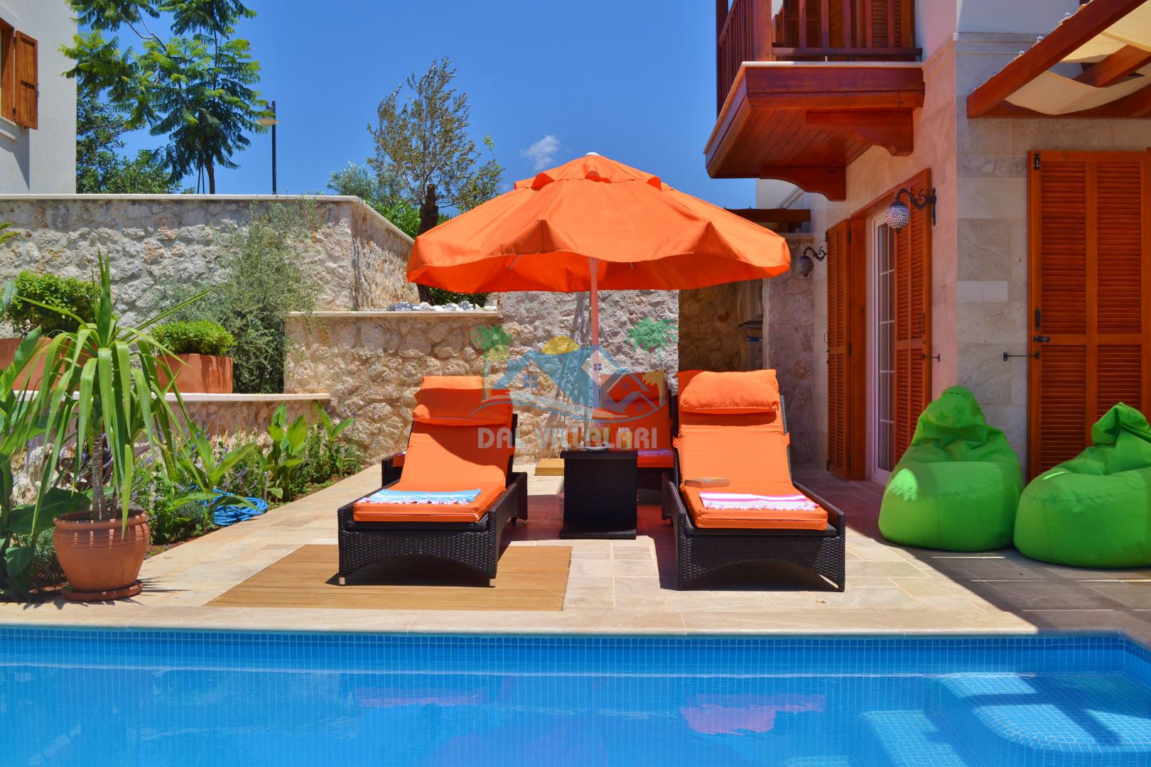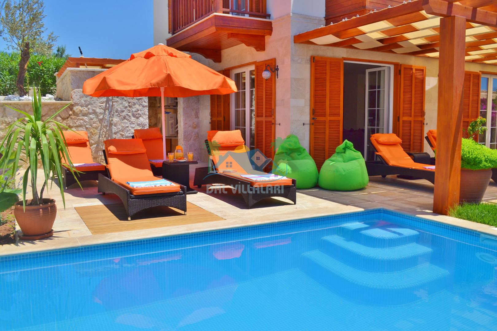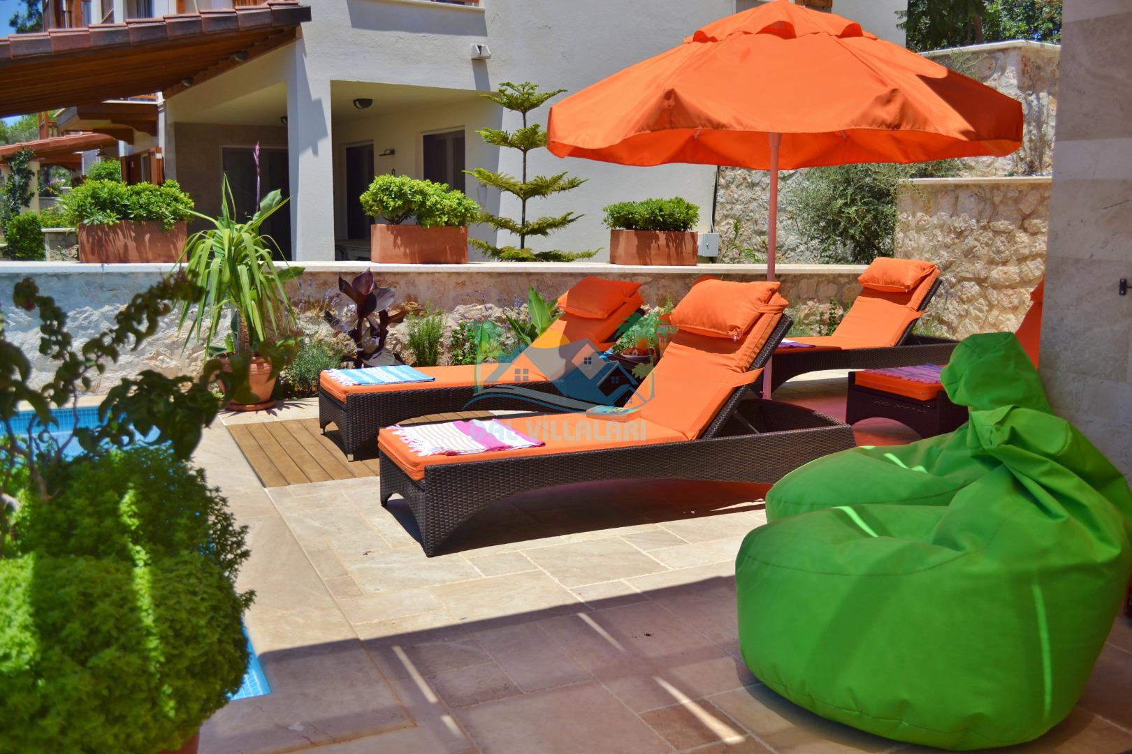 * Villa KaLu geniş bir bahçeye sahiptir. Villamızın havuz terası gayetgeniş olup Özel yüzme havuzu, barbekü mangal, dış duş, şezlong, yemek masası, şemsiye ve pergole yer almaktadır.