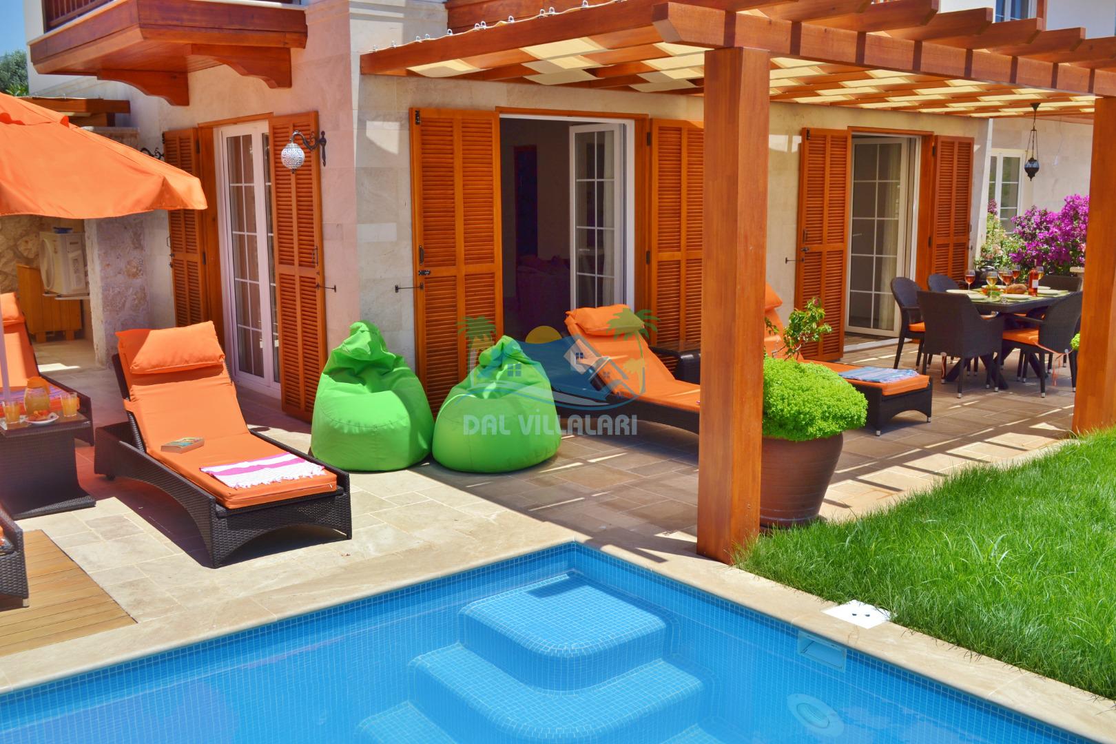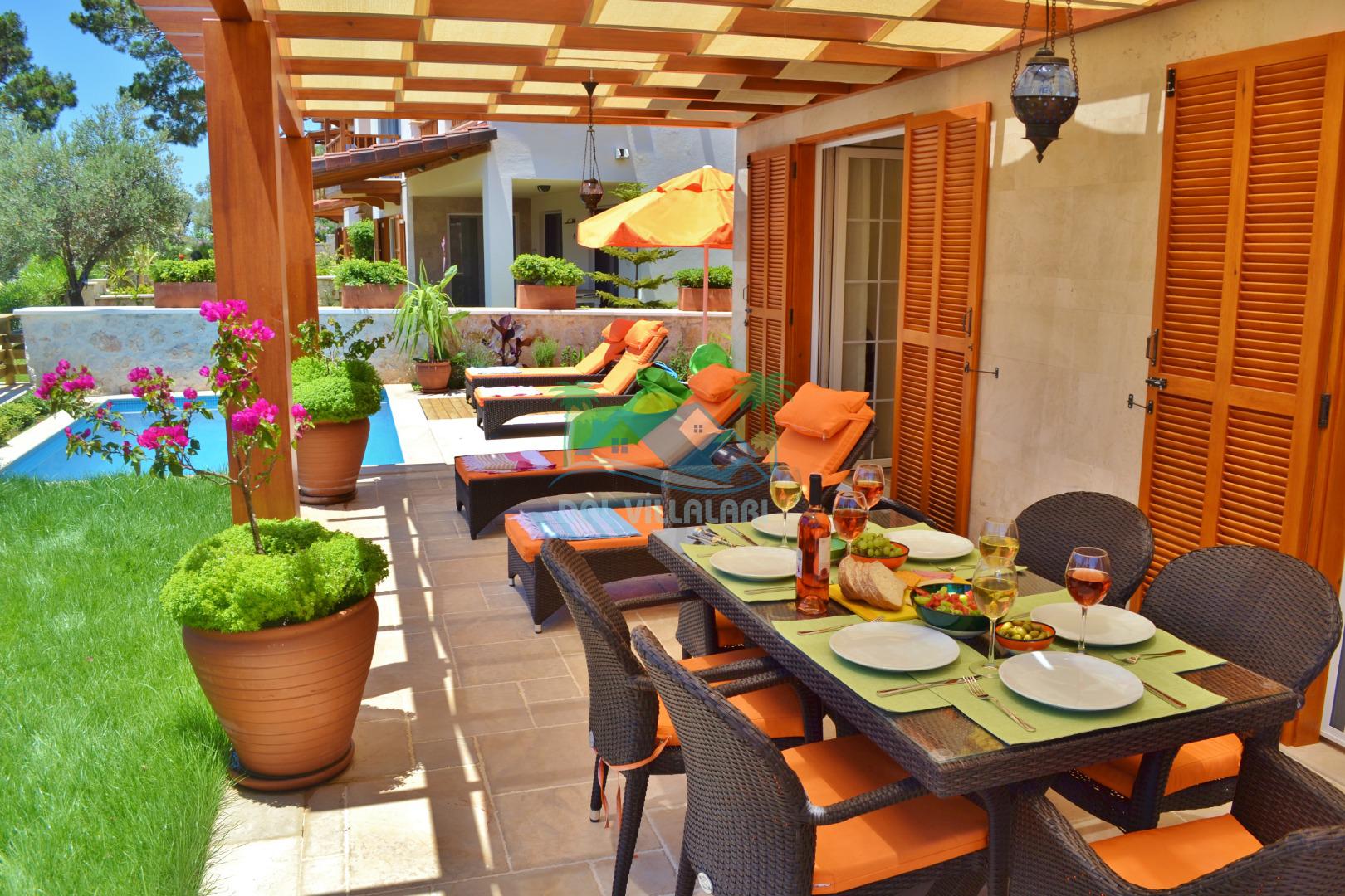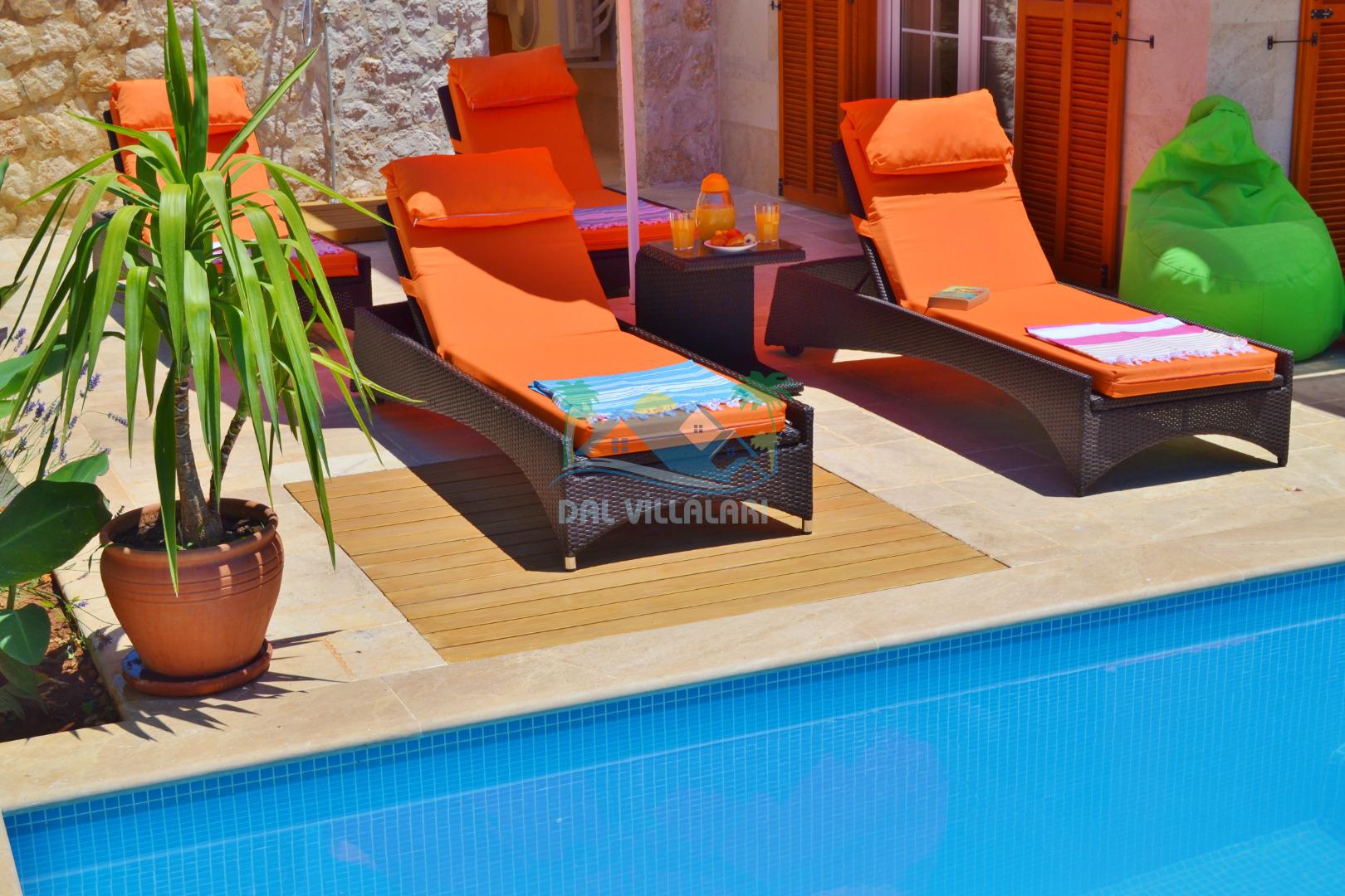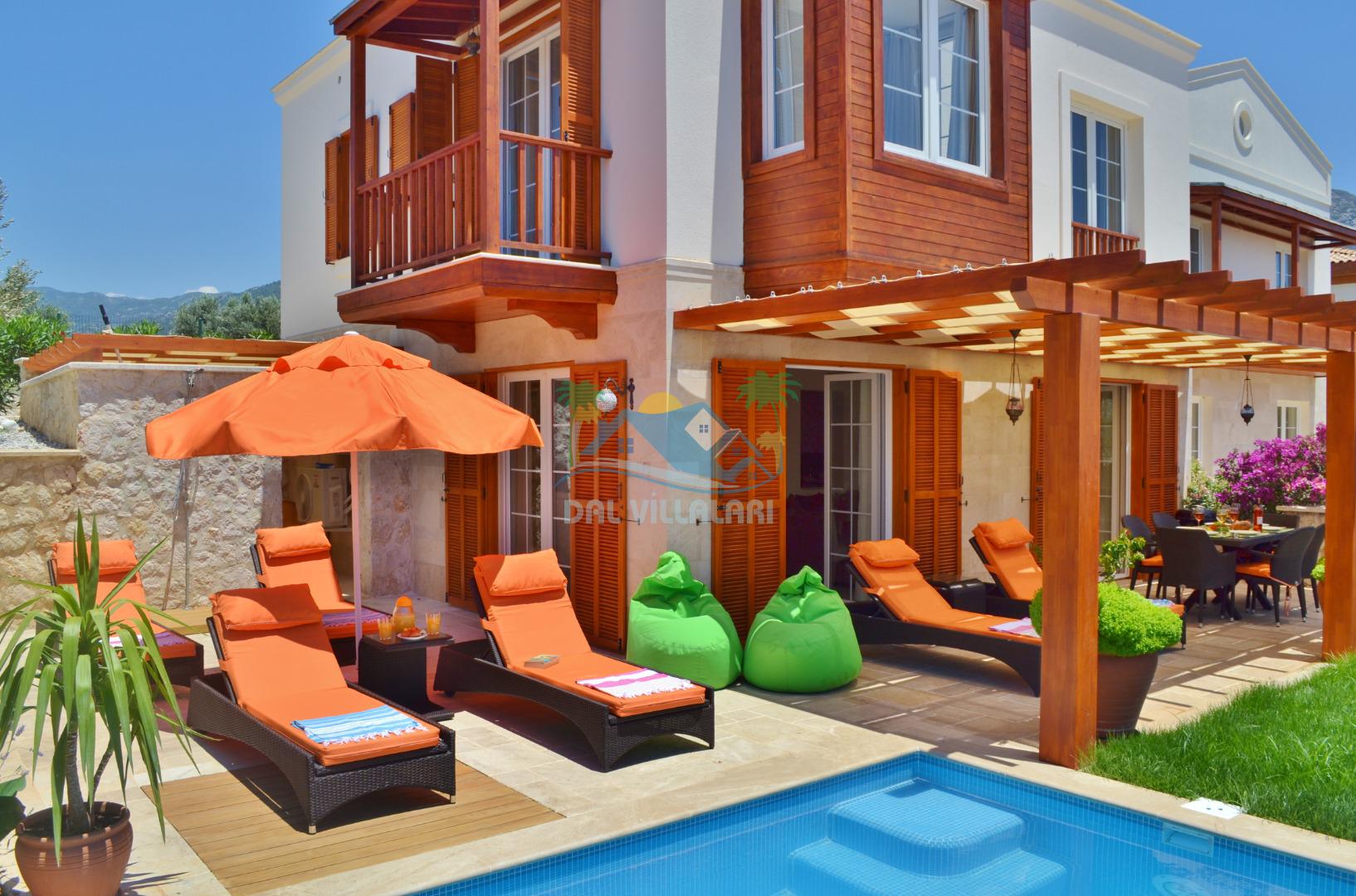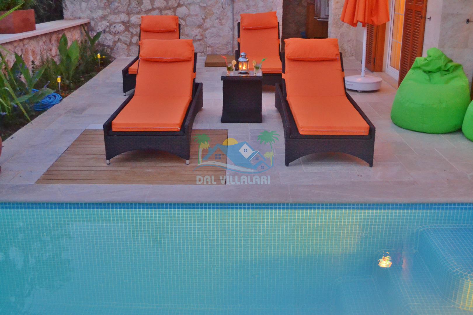 * Villa KaLu geniş bir bahçeye sahiptir. Villamızın havuz terası gayetgeniş olup Özel yüzme havuzu, barbekü mangal, dış duş, şezlong, yemek masası, şemsiye ve pergole yer almaktadır.
