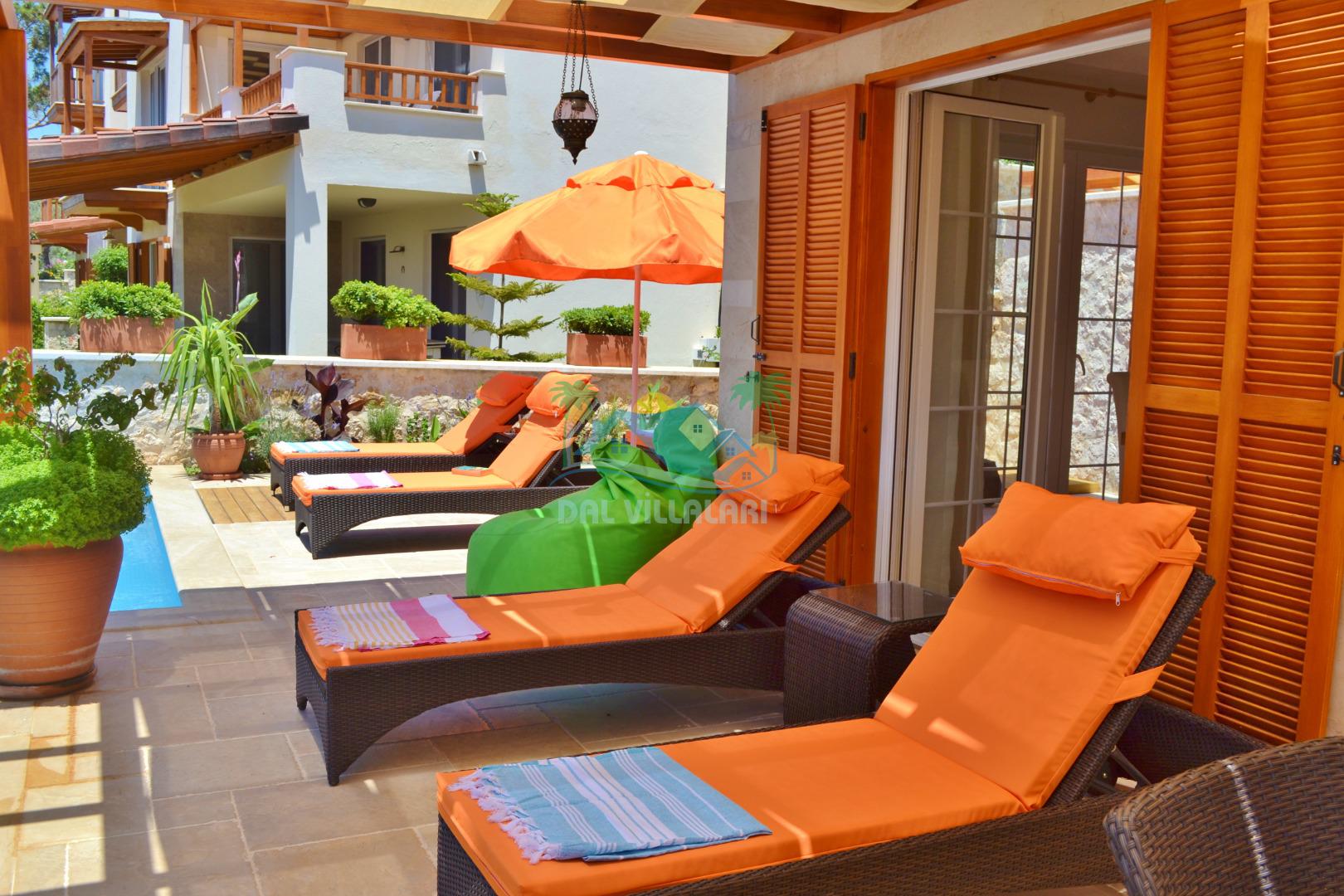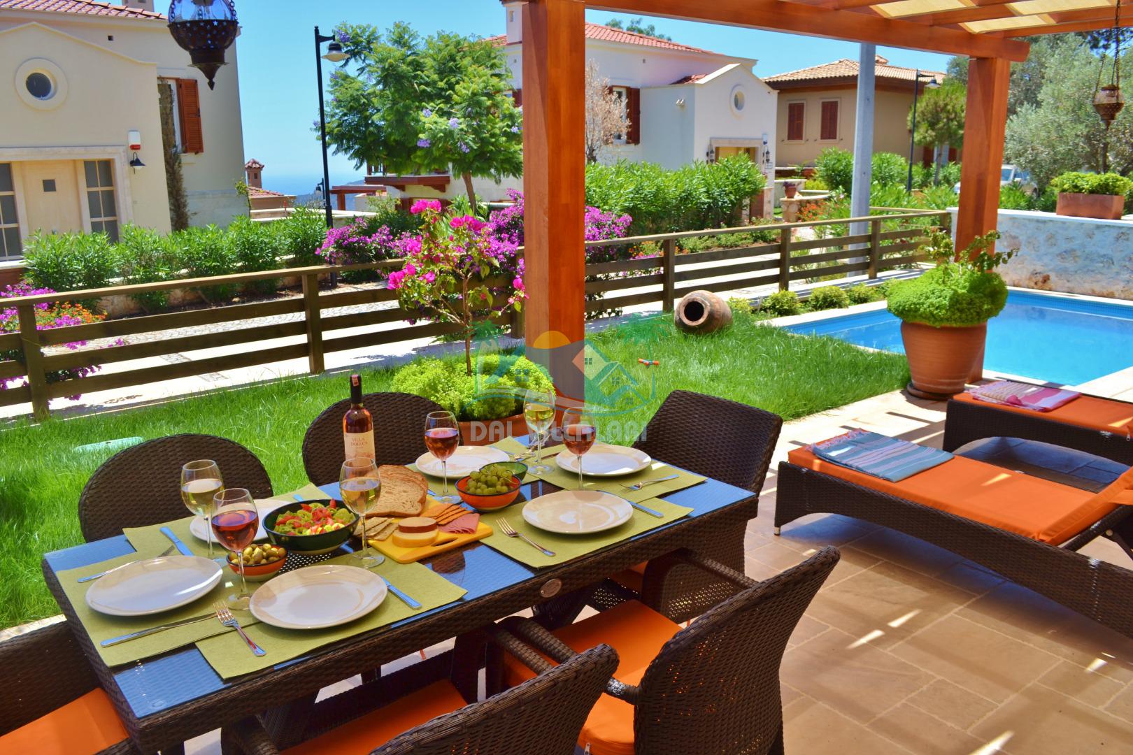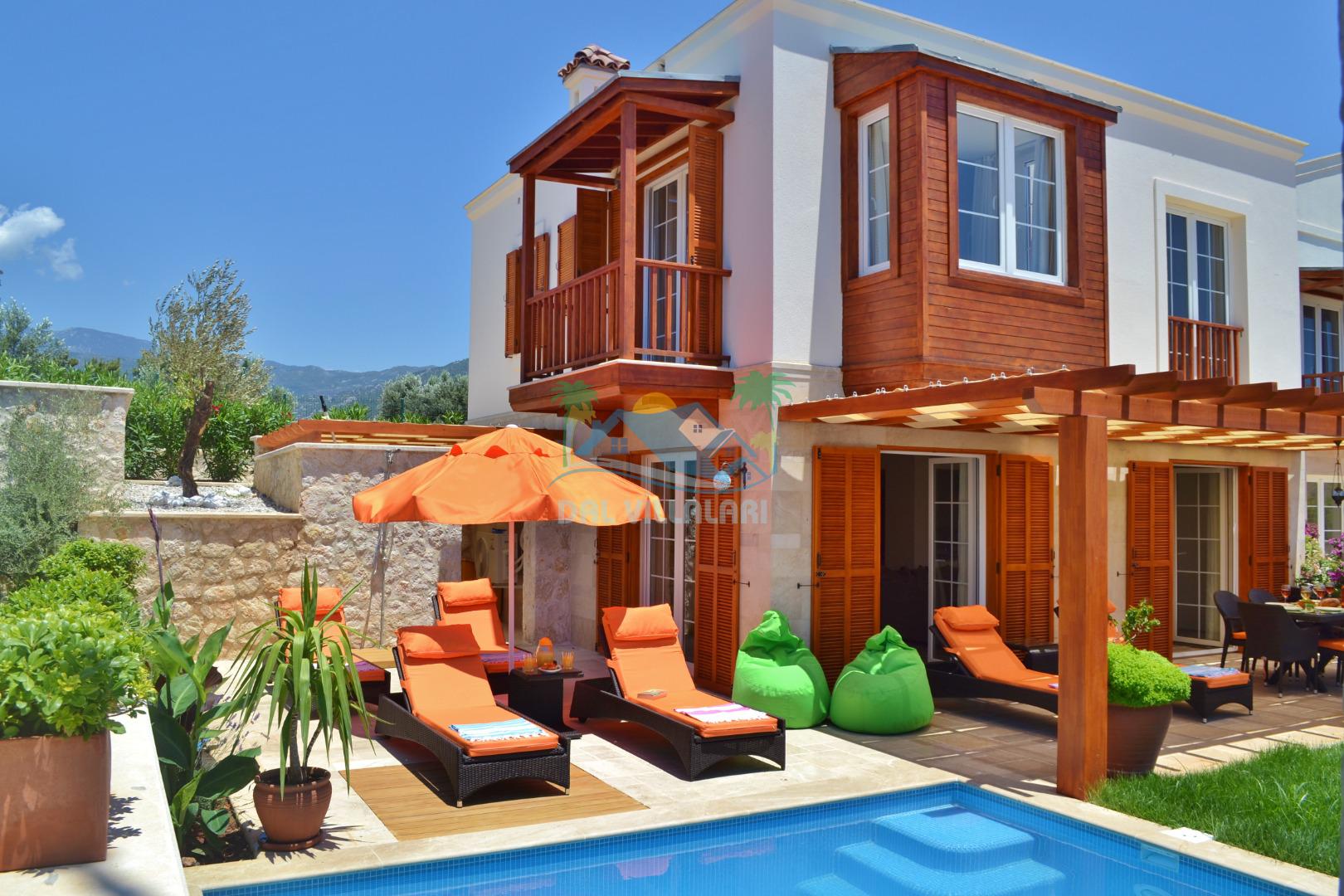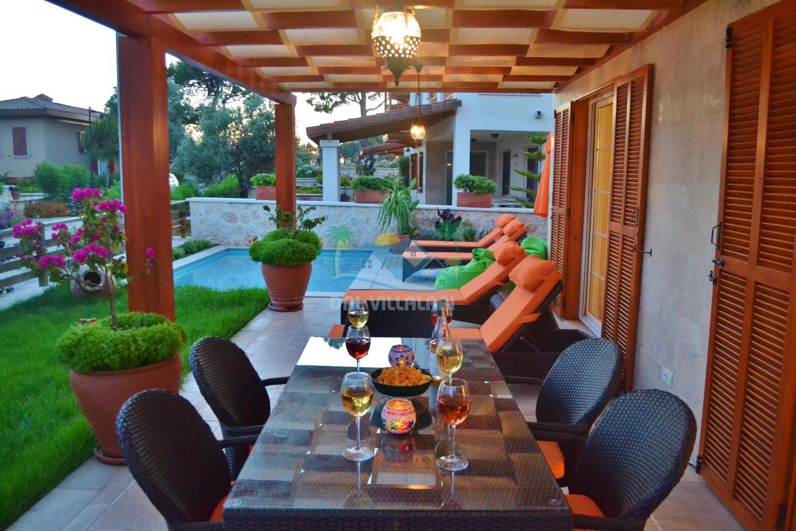 * Villa KaLu geniş bir bahçeye sahiptir. Villamızın havuz terası gayetgeniş olup Özel yüzme havuzu, barbekü mangal, dış duş, şezlong, yemek masası, şemsiye ve pergole yer almaktadır.
