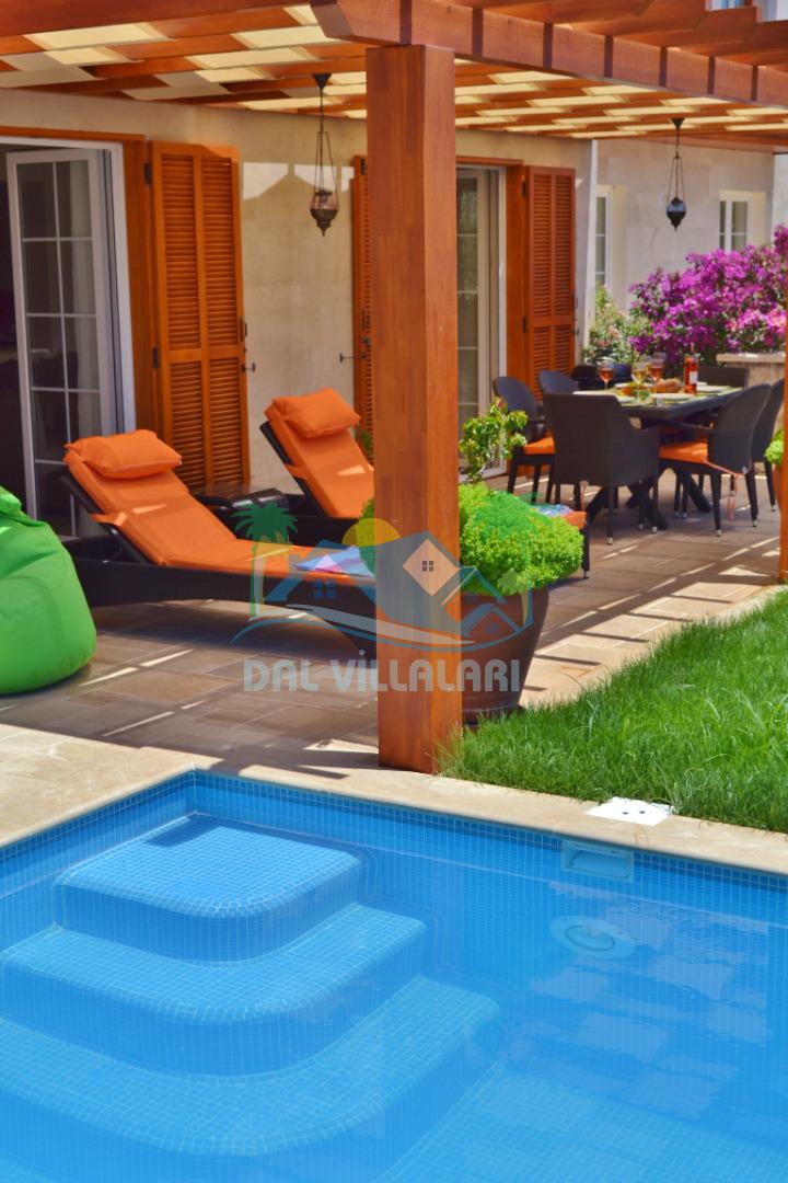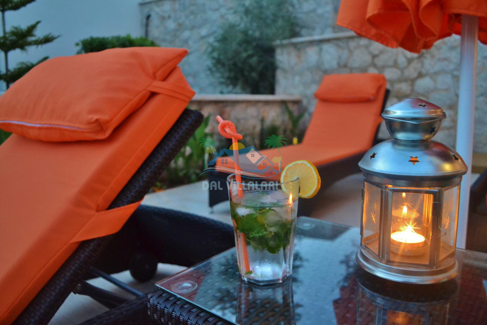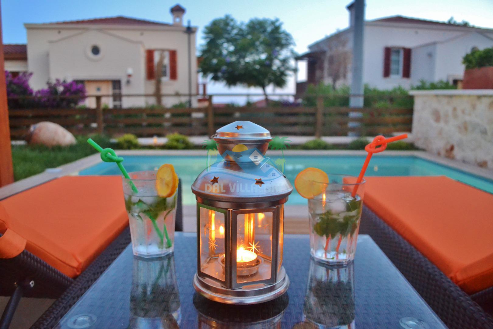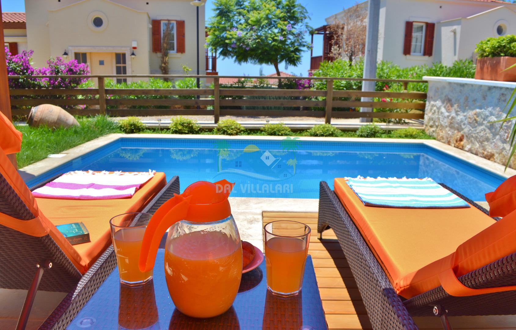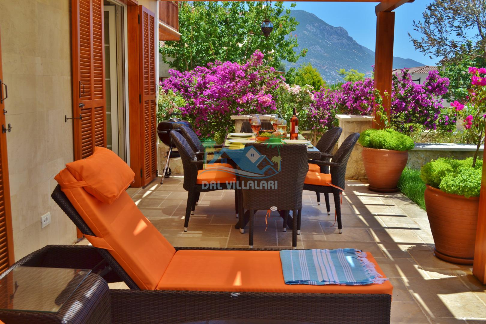 * Villa KaLu geniş bir bahçeye sahiptir. Villamızın havuz terası gayetgeniş olup Özel yüzme havuzu, barbekü mangal, dış duş, şezlong, yemek masası, şemsiye ve pergole yer almaktadır.