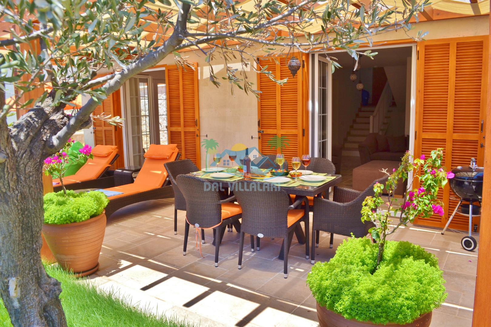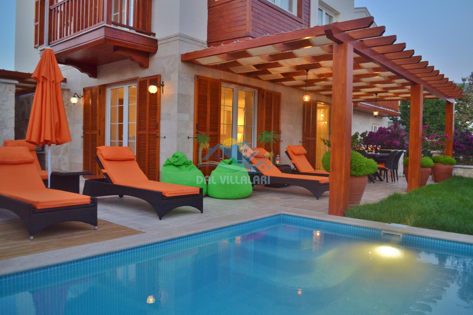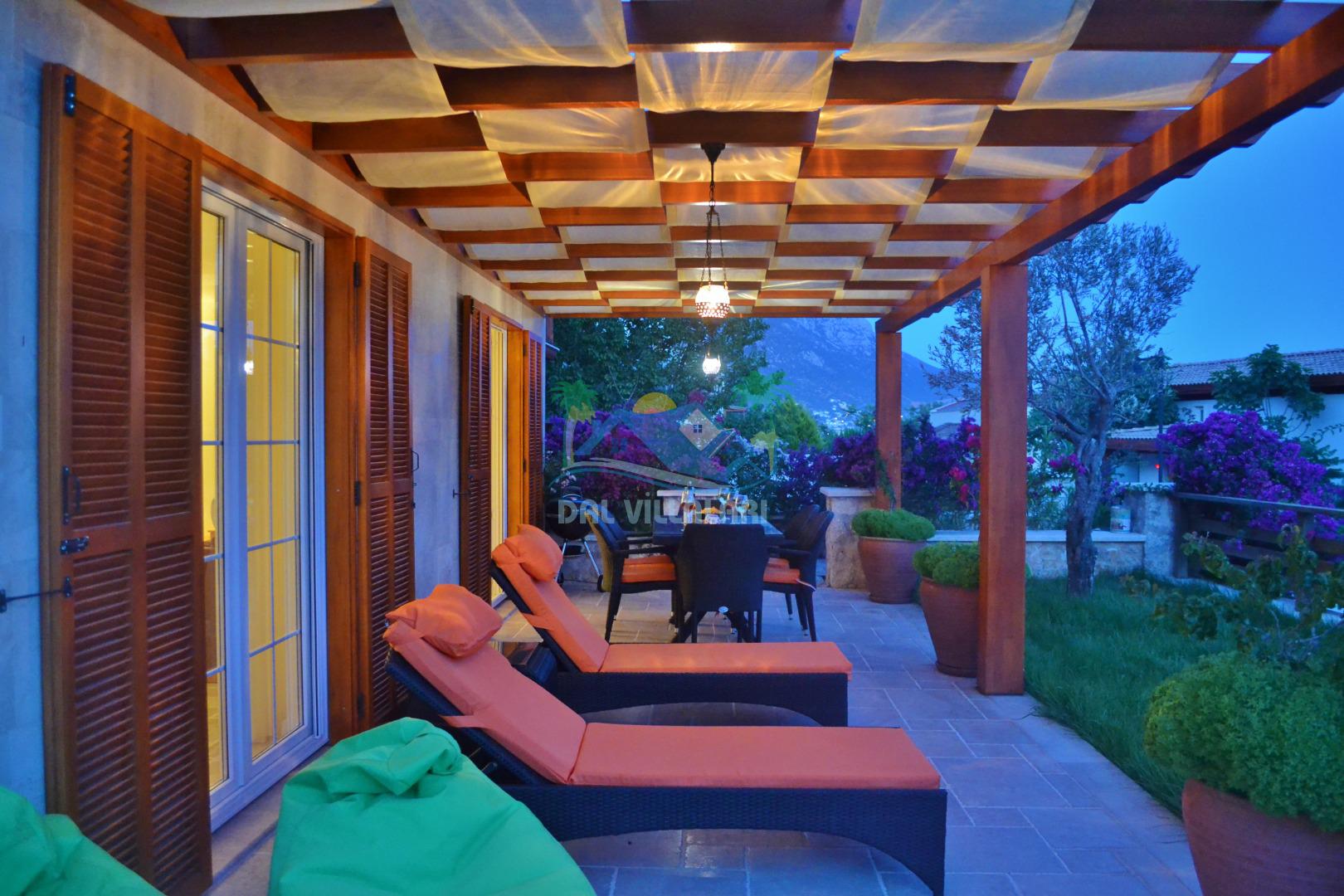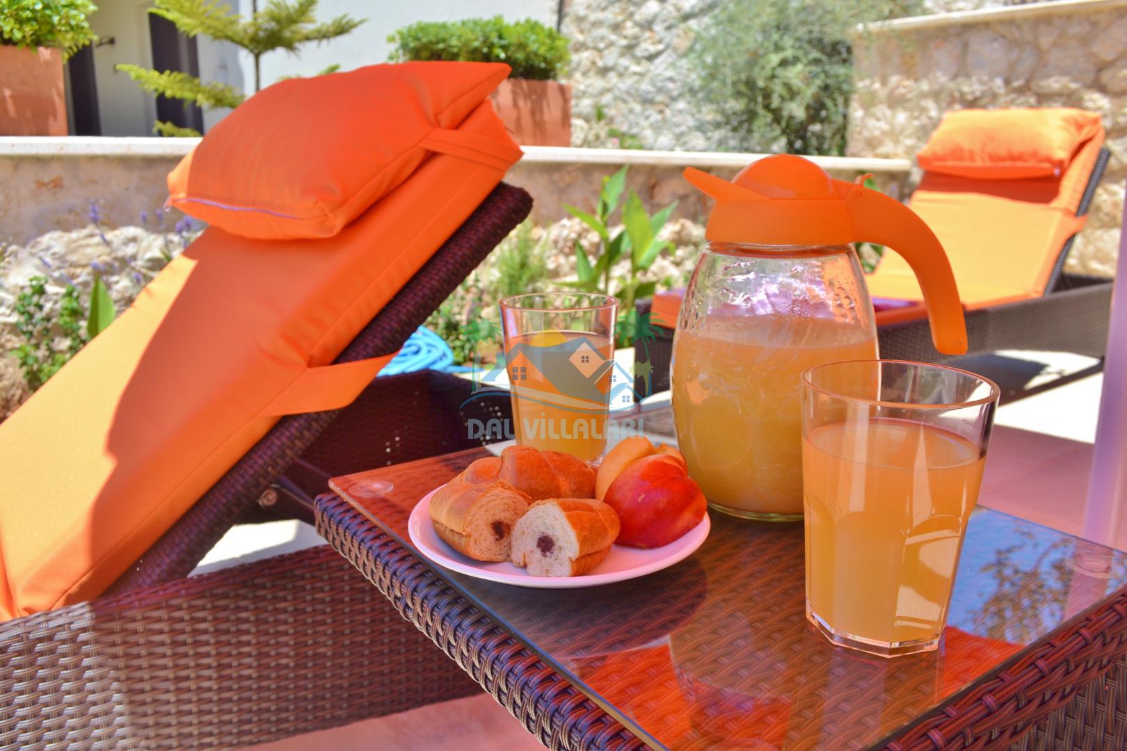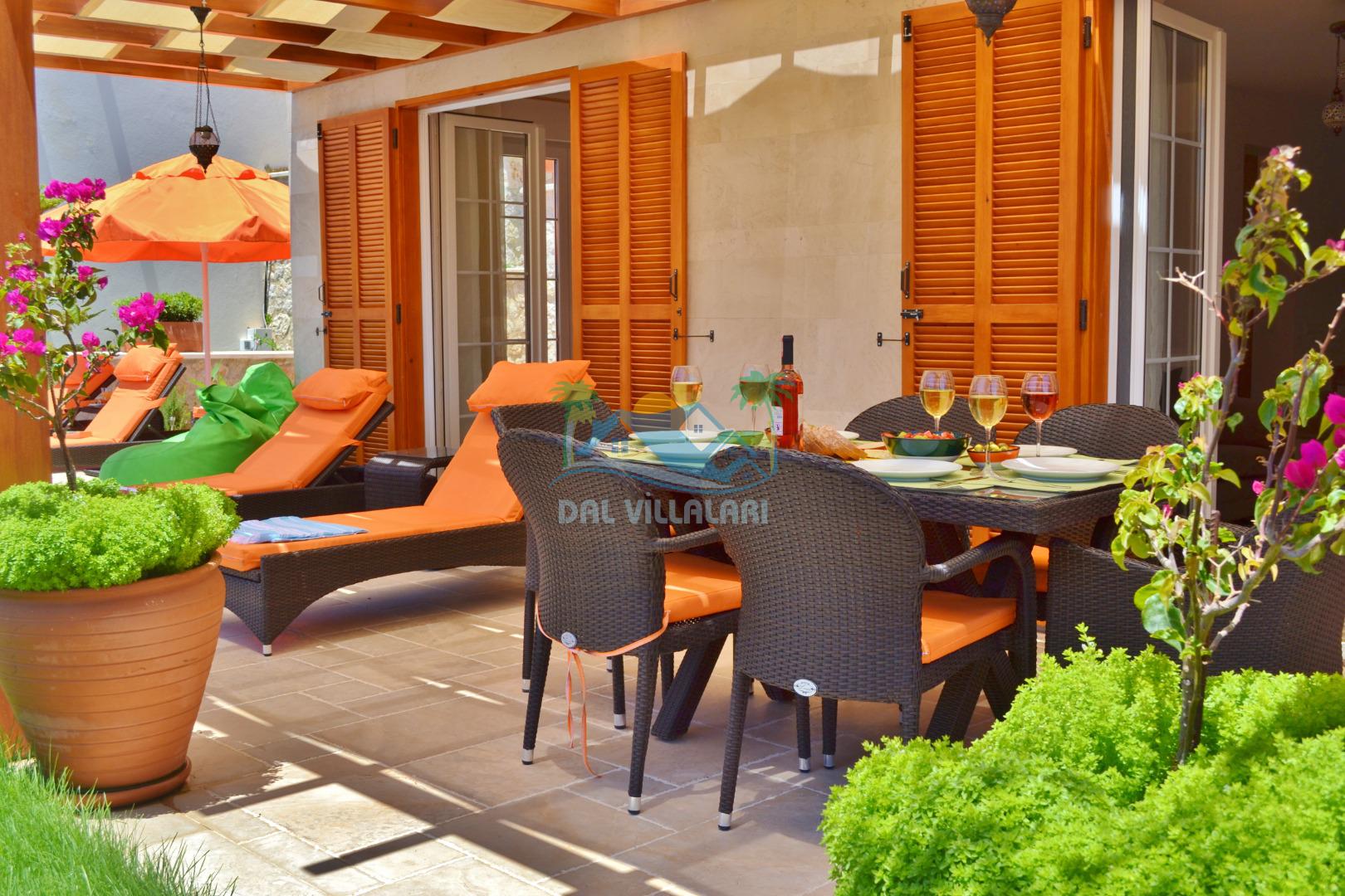 * Villa KaLu geniş bir bahçeye sahiptir. Villamızın havuz terası gayetgeniş olup Özel yüzme havuzu, barbekü mangal, dış duş, şezlong, yemek masası, şemsiye ve pergole yer almaktadır.