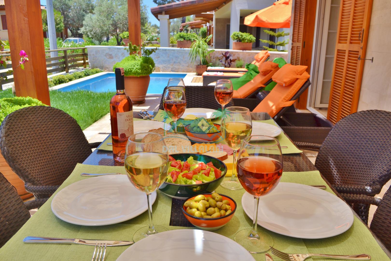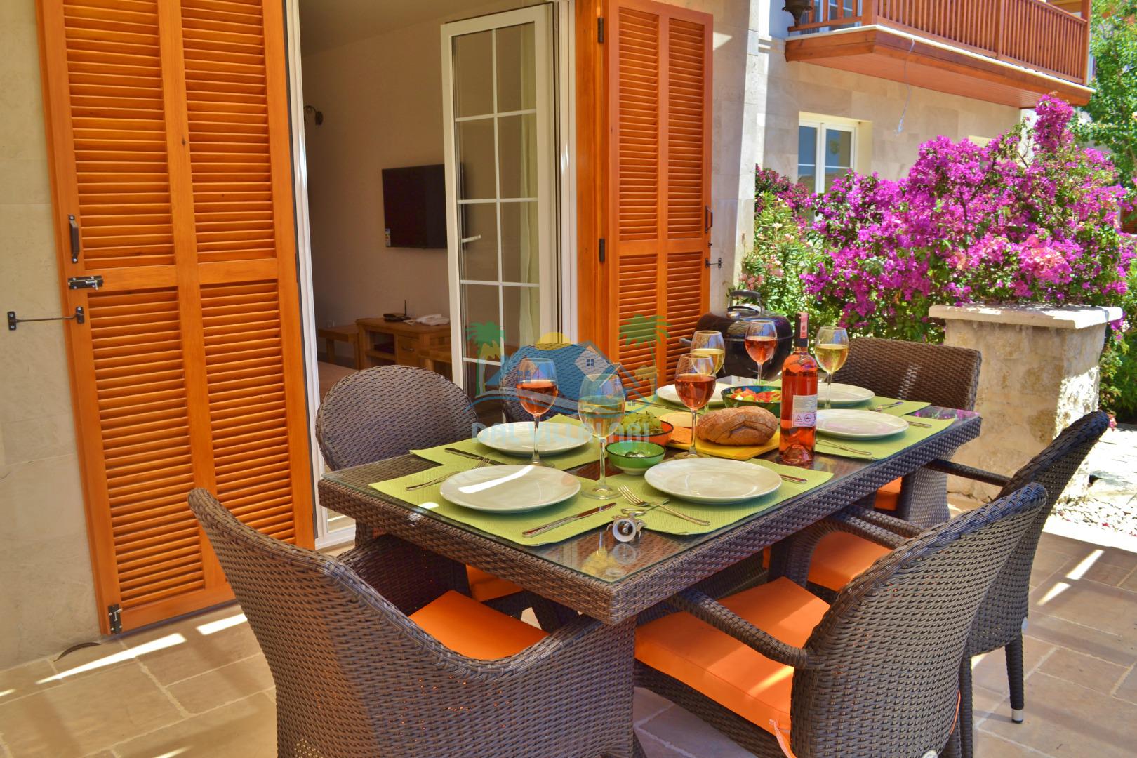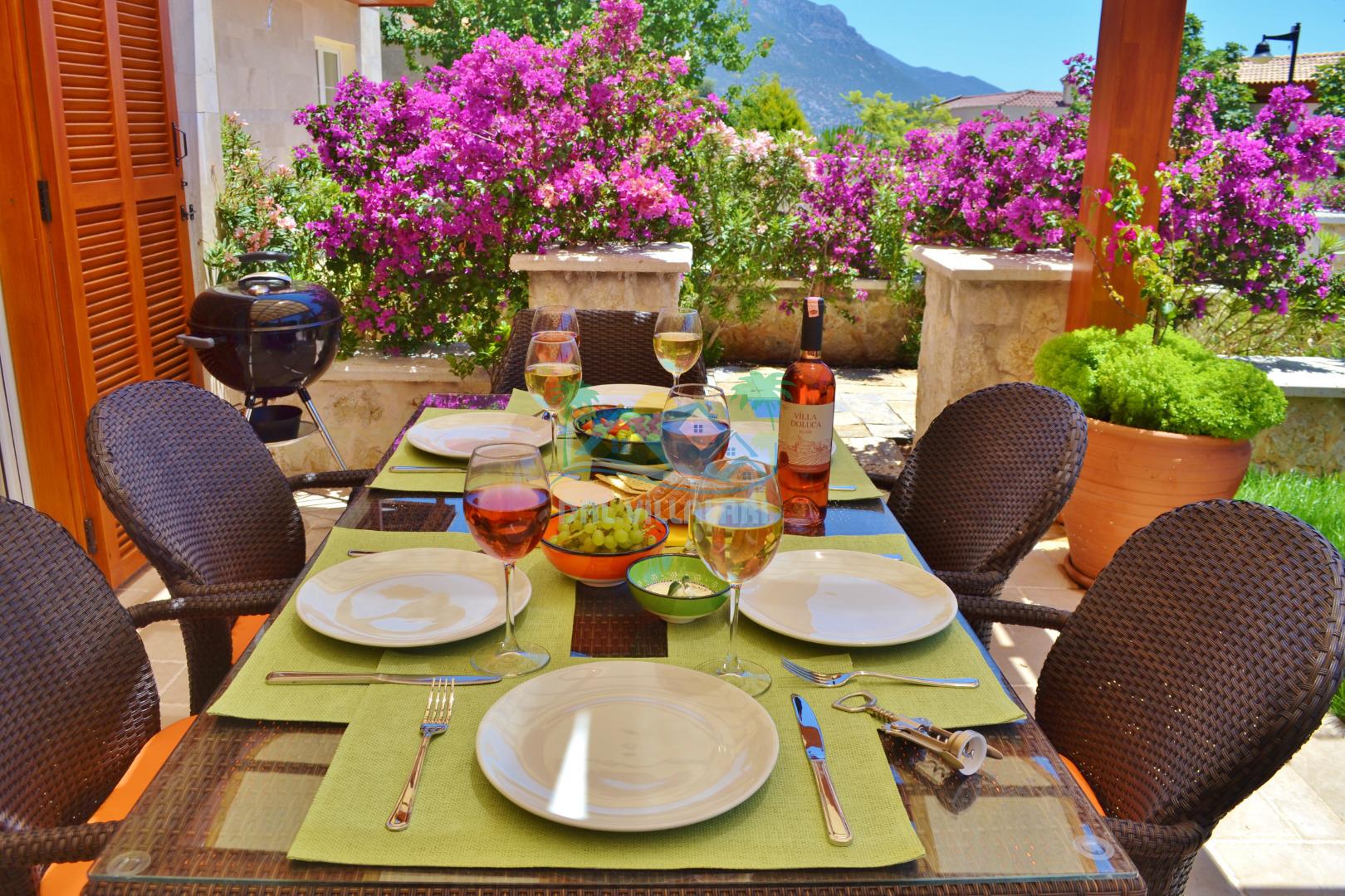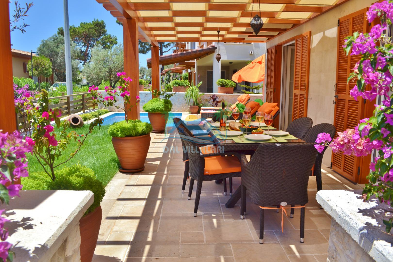* Villa KaLu geniş bir bahçeye sahiptir. Villamızın havuz terası gayetgeniş olup Özel yüzme havuzu, barbekü mangal, dış duş, şezlong, yemek masası, şemsiye ve pergole yer almaktadır.