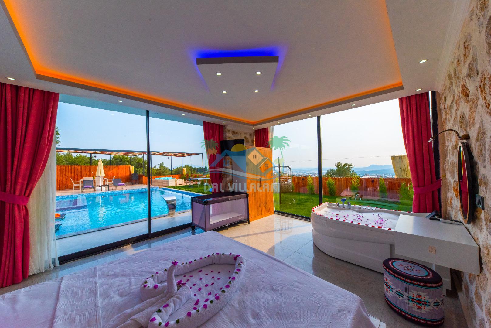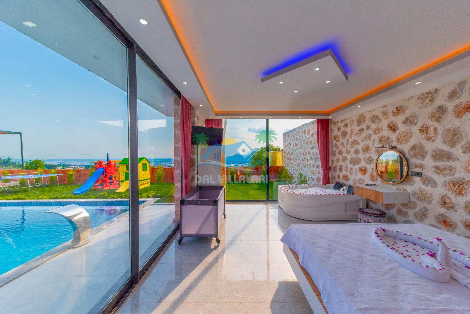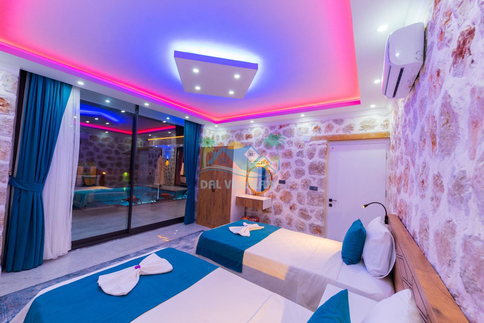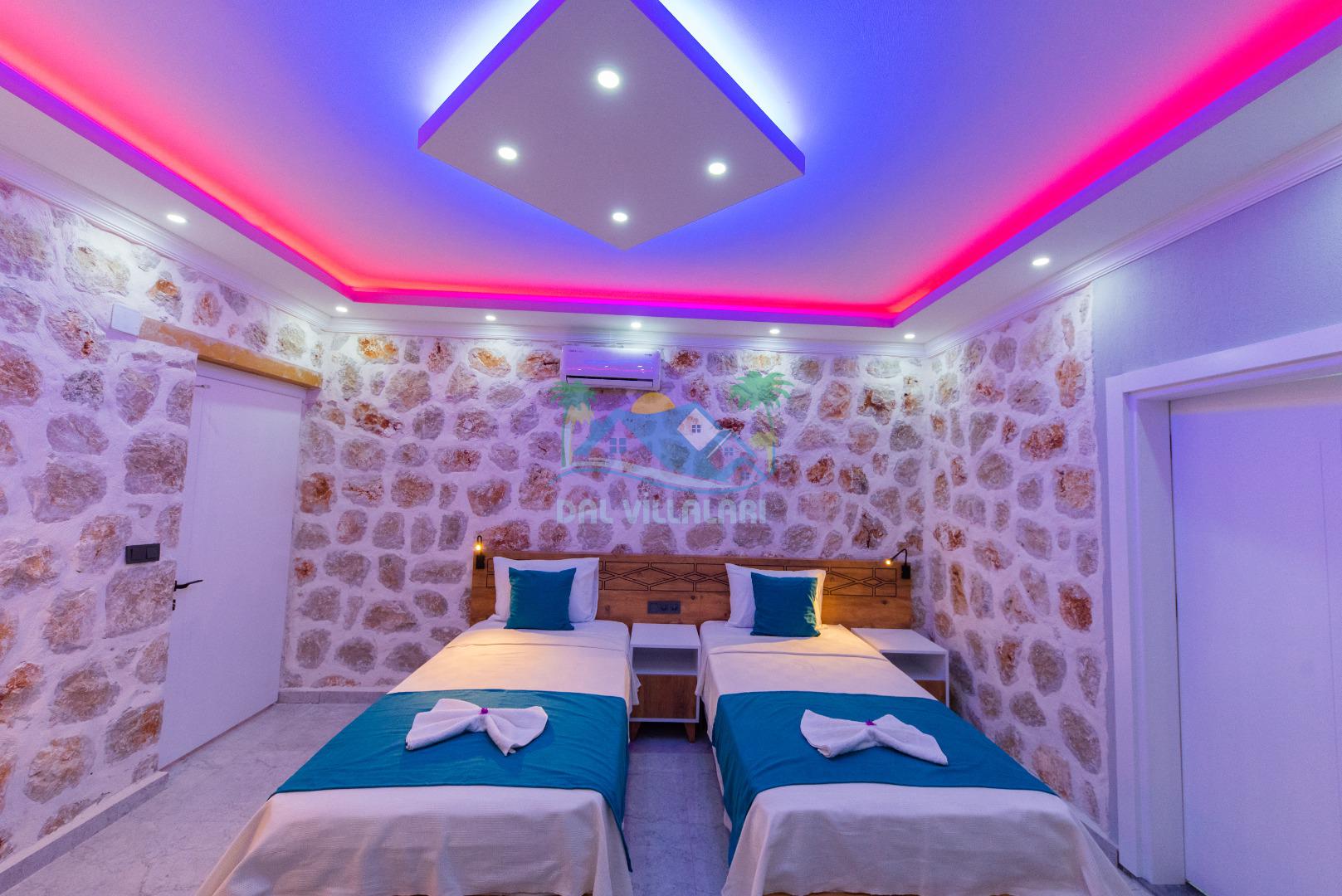 Villamızın iki adet yatak odası ve iki adet banyosu bulunmaktadır. Birinci yatak odası içerisinde bir adet çift kişilik yatak, banyo, jakuzi, klima ve televizyon; ikinci yatak odası içerisinde iki adet tek kişilik yatak, banyo ve klima yer almaktadır. Salon içerisinde mutfak, oturma grubu, televizyon ve klima yer almaktadır.